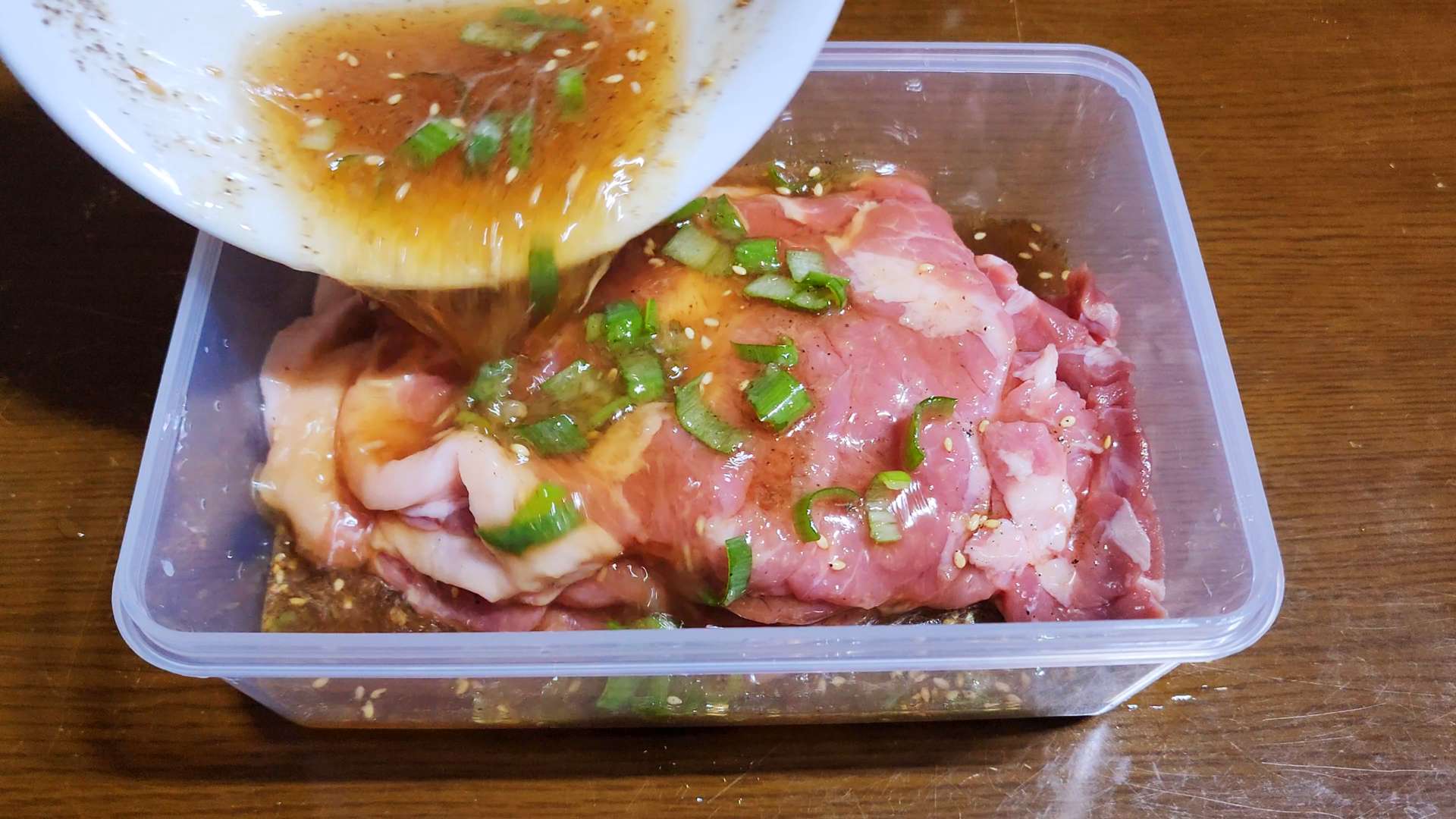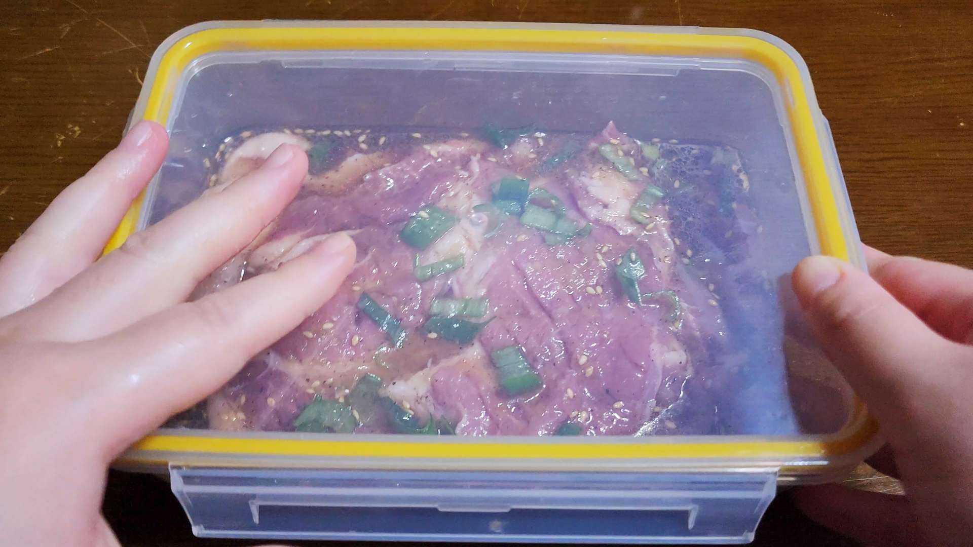 밀폐용기에 목살을 겹겹이 쌓아 넣고 양념장을 부어 재워줍니다. 4시간 이상 숙성시켜주세요.