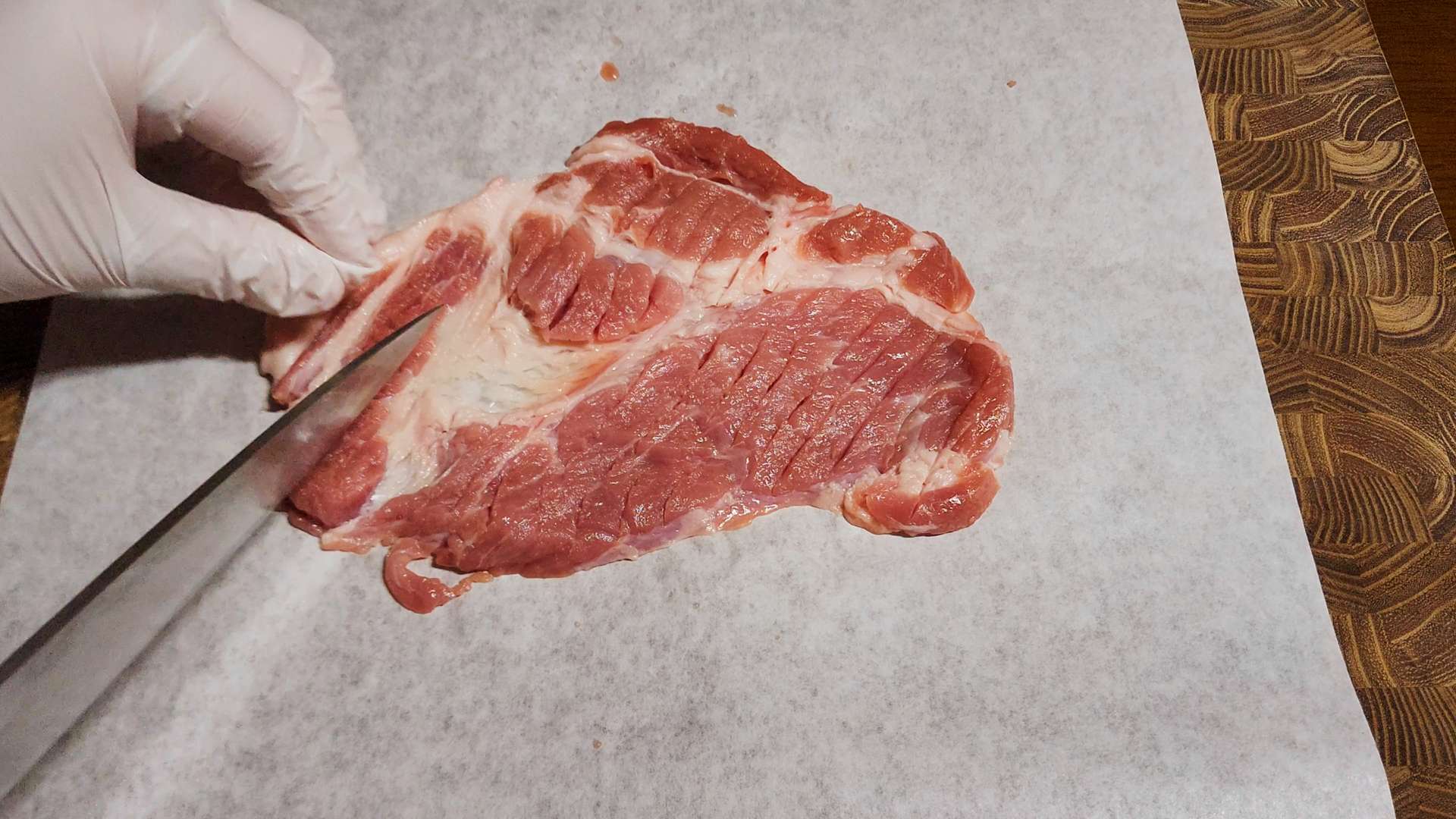 돼지목살은 앞면과 뒷면에 칼집을 내줍니다.