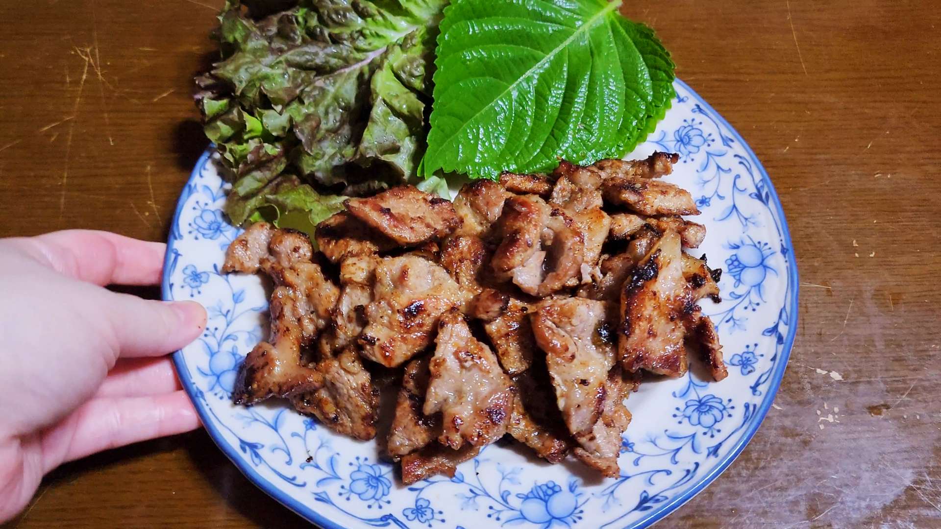 그릇에 상추, 깻잎, 양념돼지갈비를 담아줍니다.