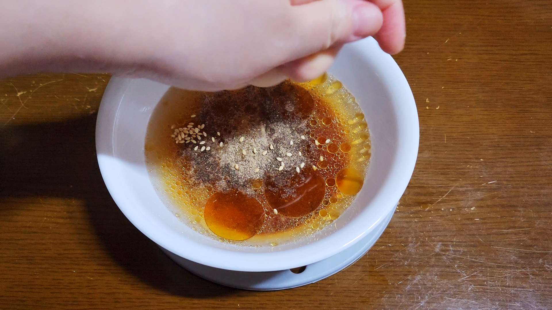 진간장 2T, 참치액 2T, 설탕 2T, 참기름 1T, 다진마늘 듬뿍 1T, 식초 0.5T, 갈아만든 배 238ml, 후추 2T, 깨 1T, 대파 넣고 섞어 양념장을 만들어줍니다.