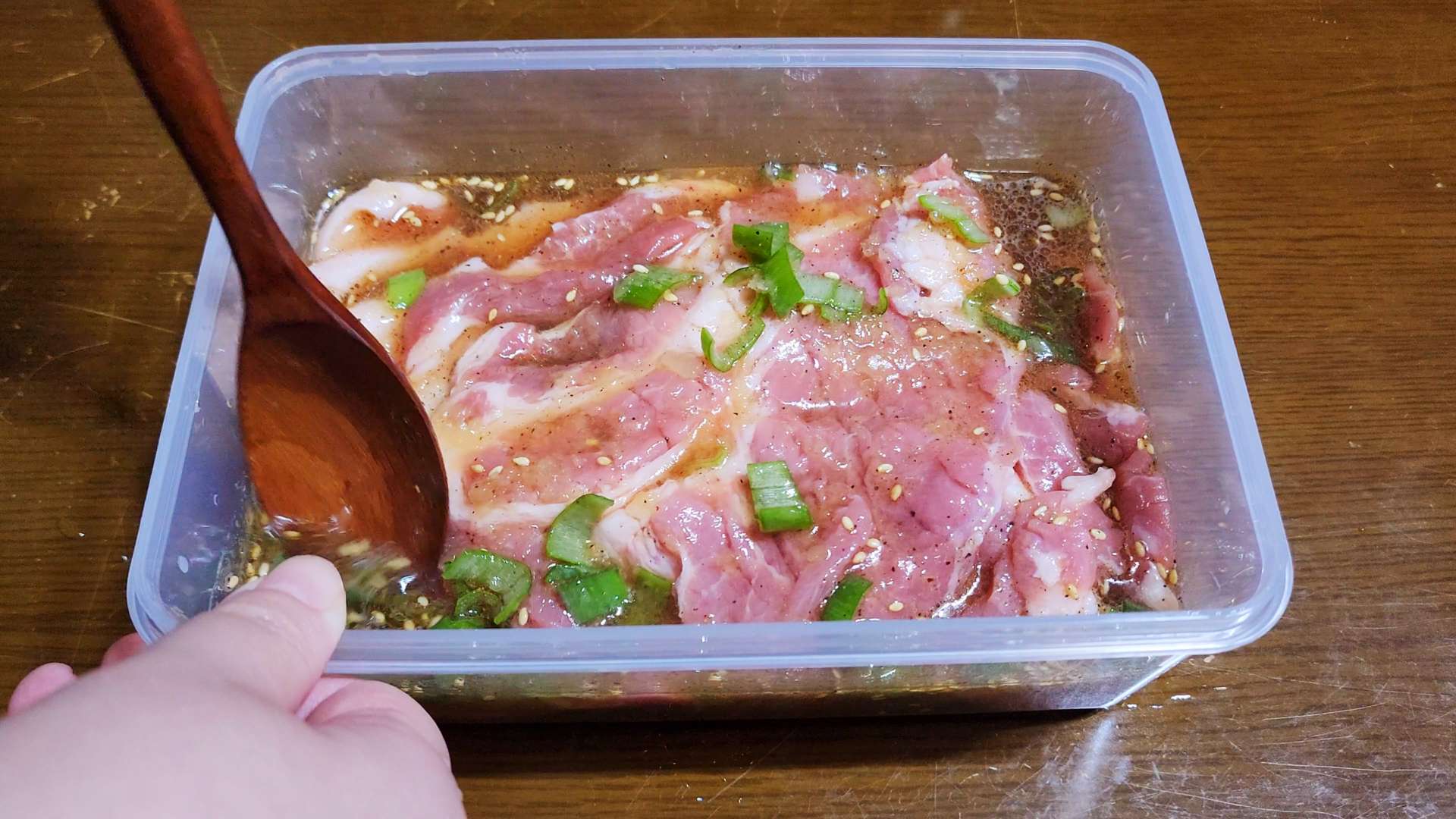 밀폐용기에 목살을 겹겹이 쌓아 넣고 양념장을 부어 재워줍니다. 4시간 이상 숙성시켜주세요.
