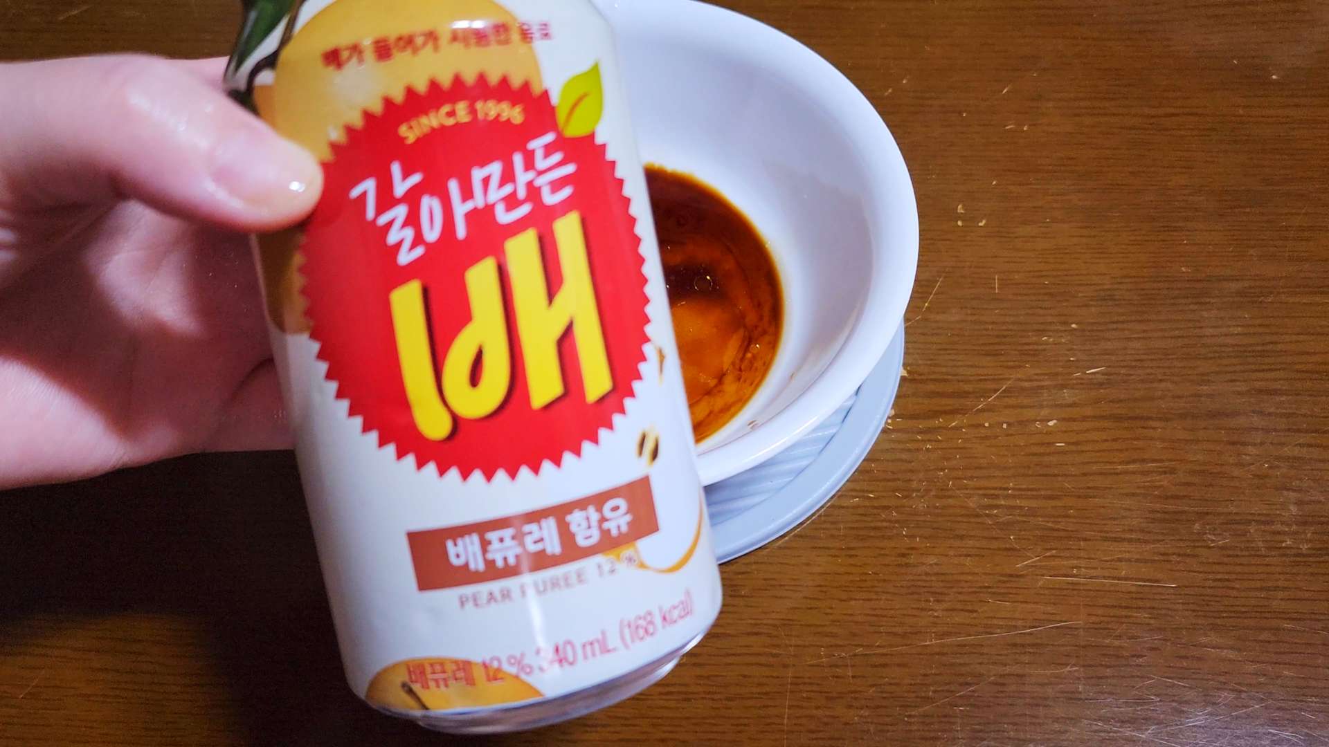 재료: 돼지목살 400g, 대파 1/2대, 진간장 2T, 참치액 2T, 설탕 2T, 참기름 1T, 다진마늘 듬뿍 1T, 식초 0.5T, 갈아만든 배음료 238ml,