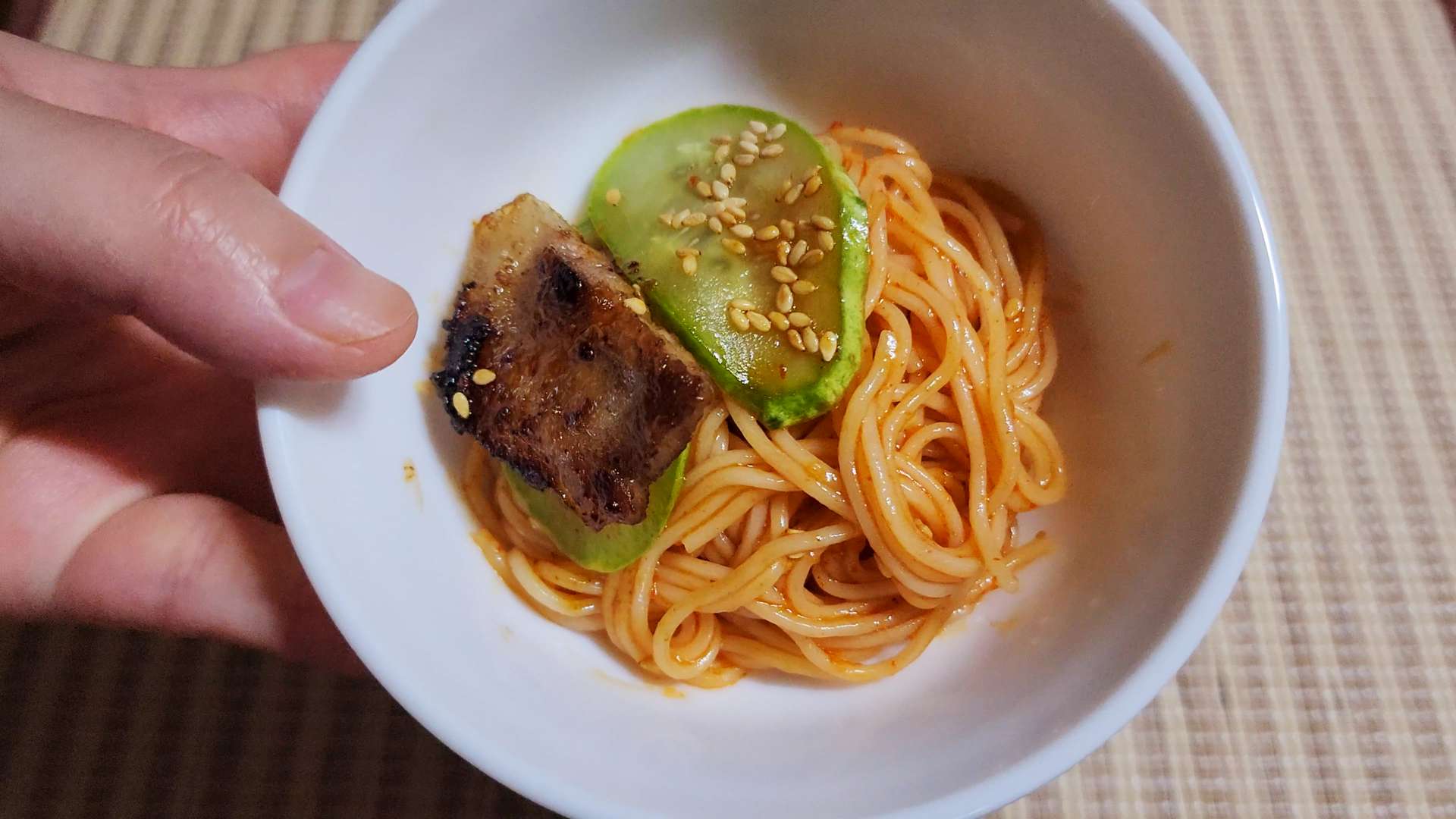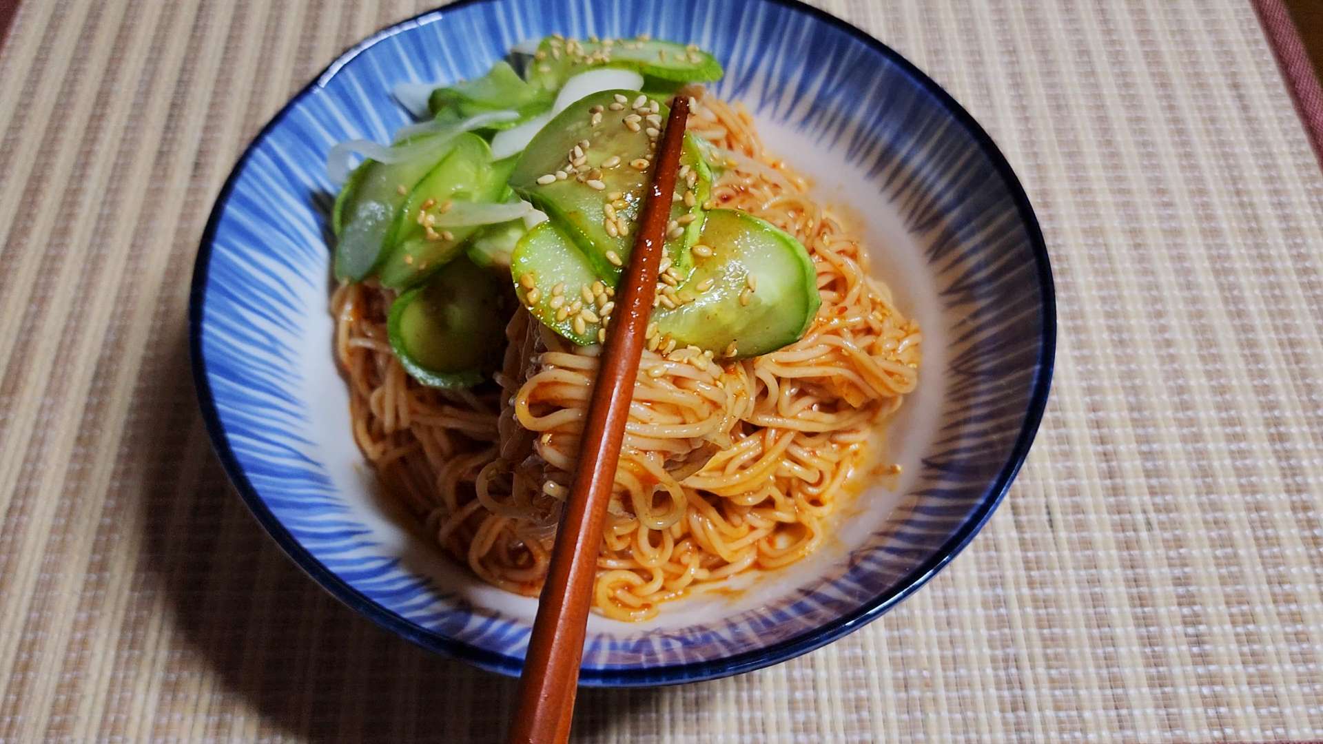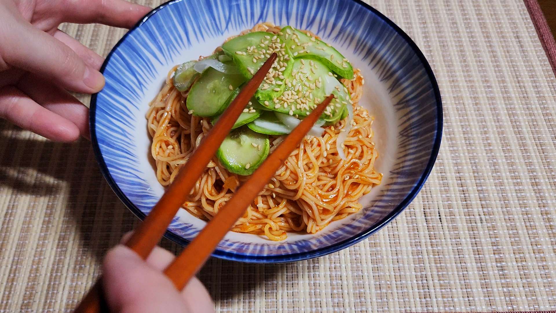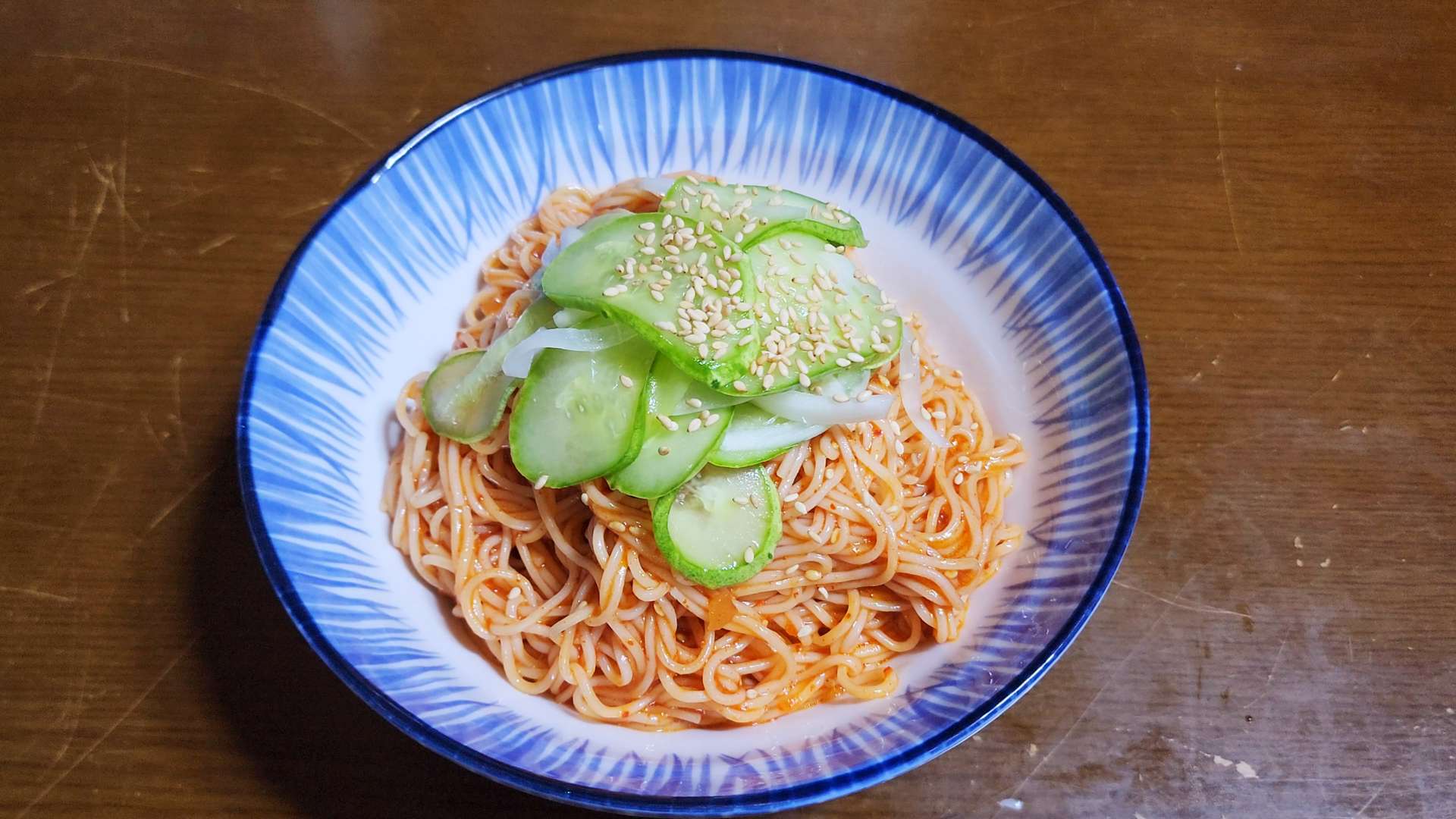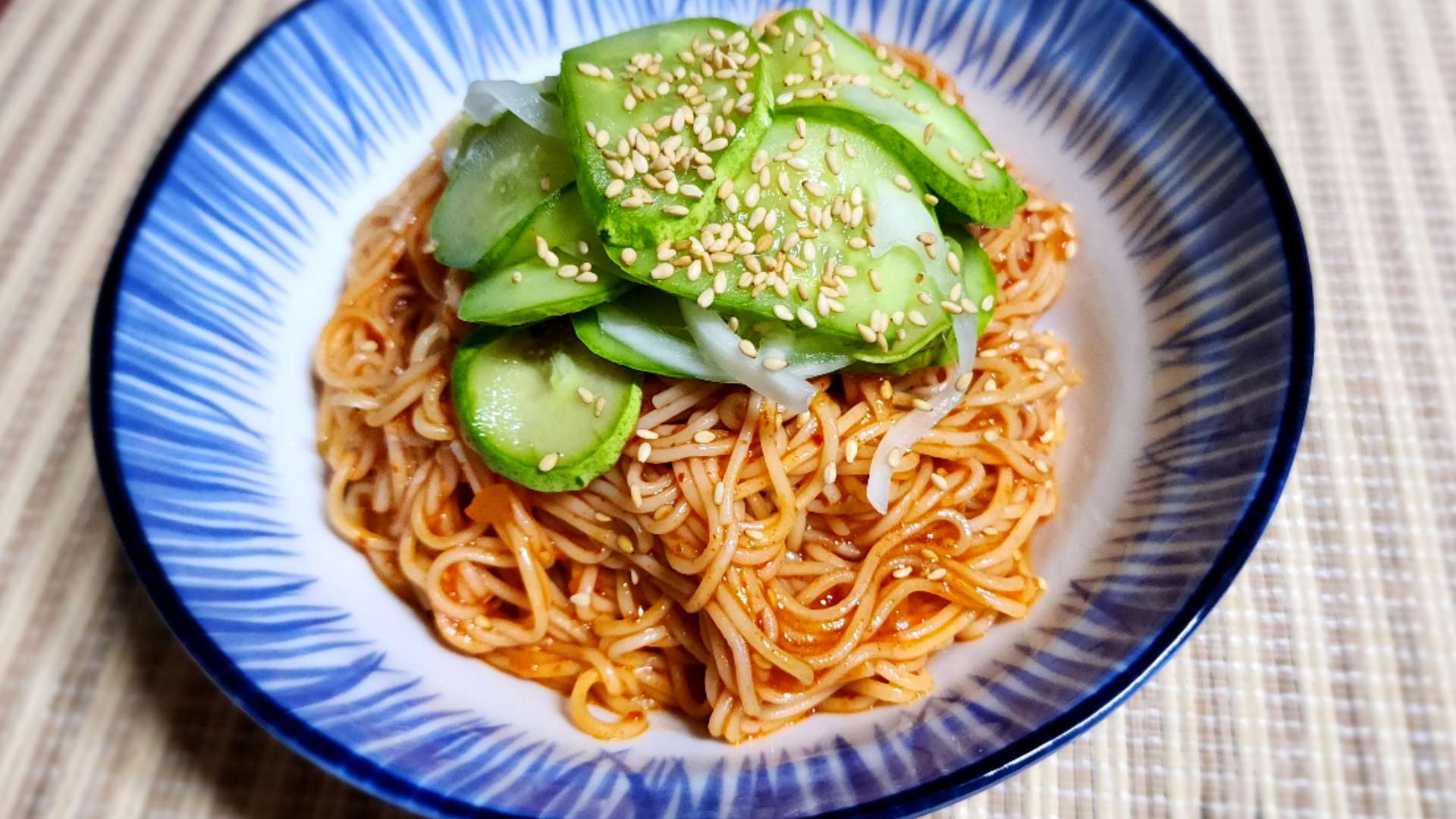 그릇에 비빔면을 담고 오이양파절임 올리고 통깨를 뿌려줍니다.