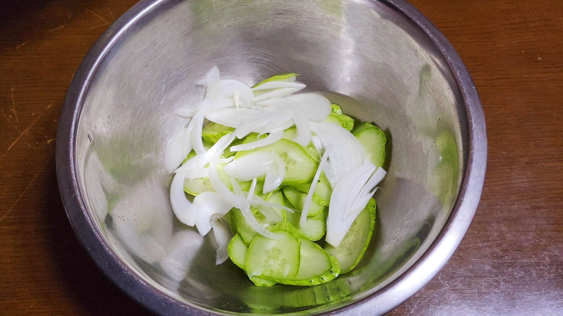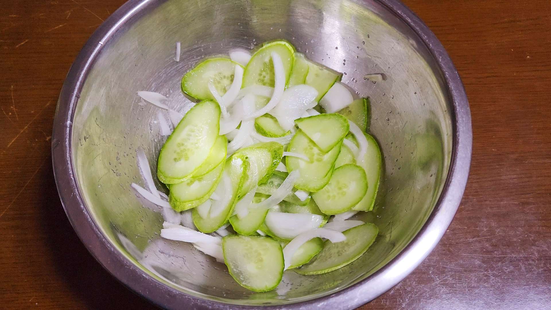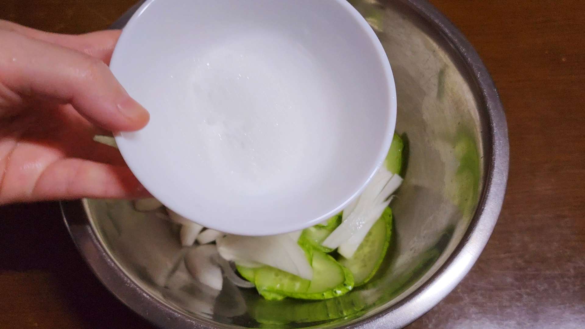 오이, 양파, 식초 4T, 설탕 2T, 맛소금 4꼬집