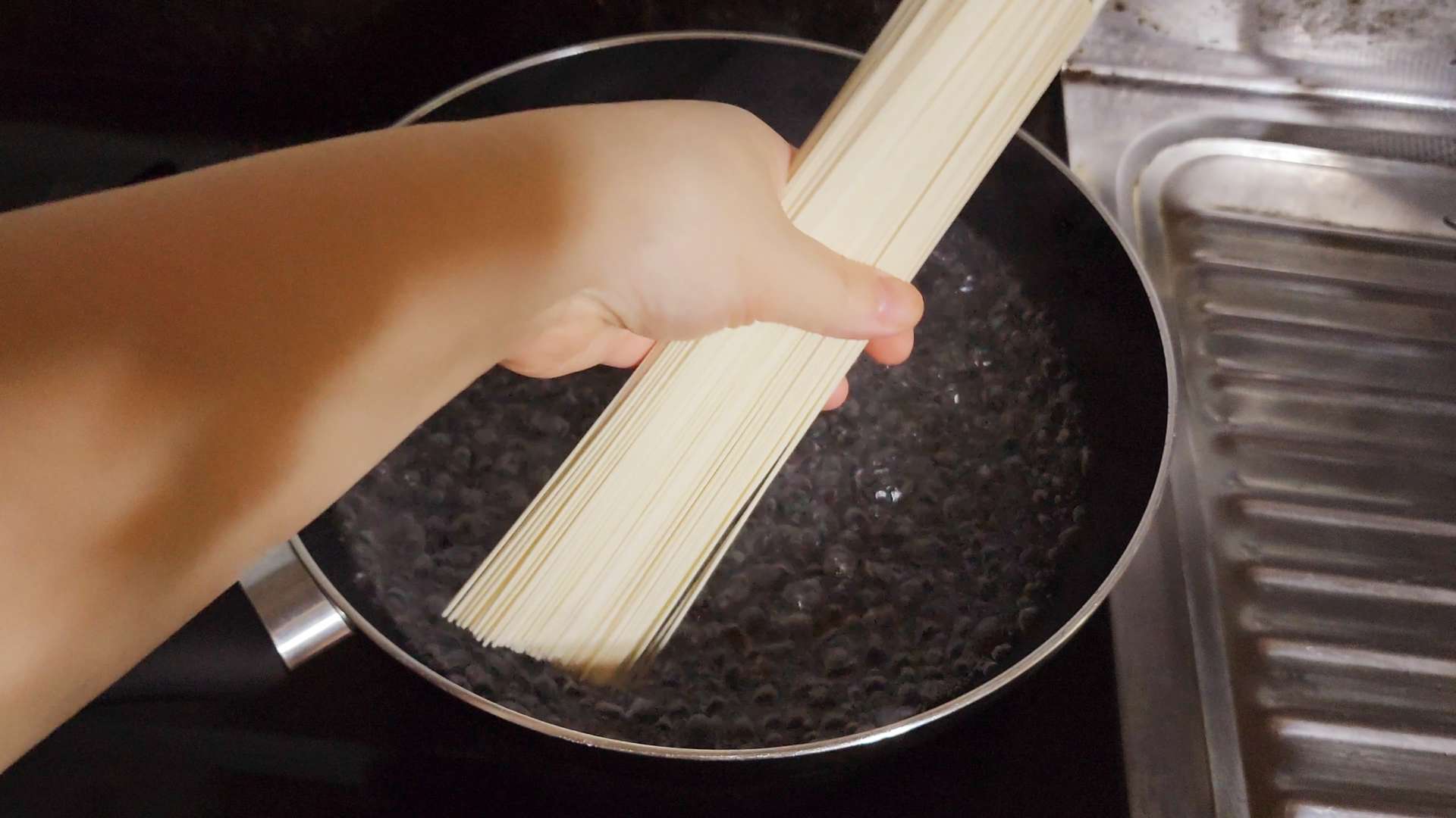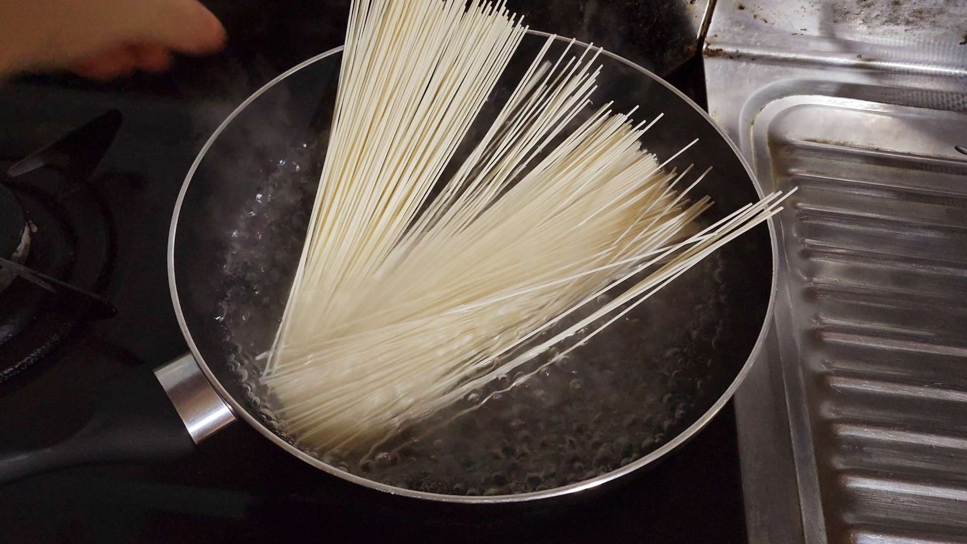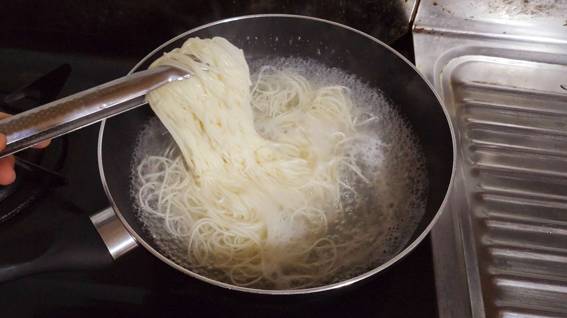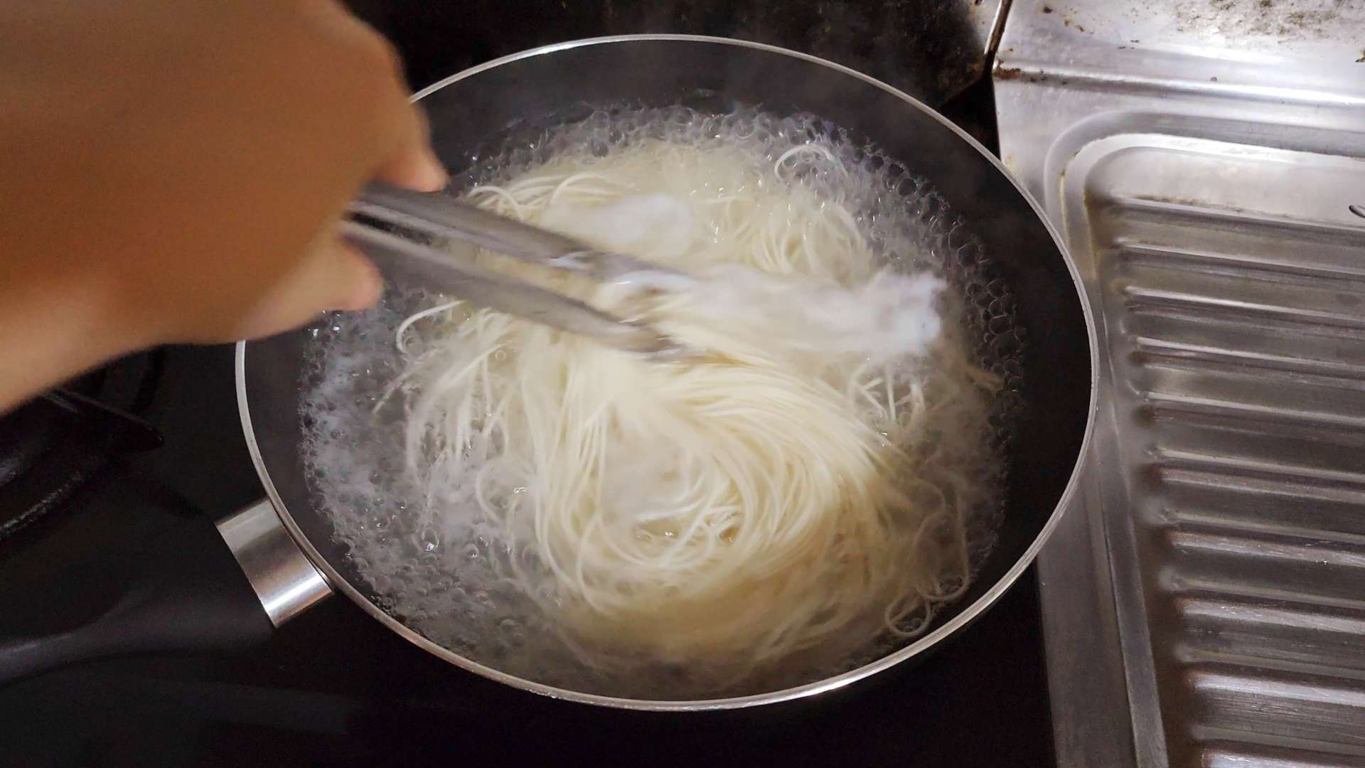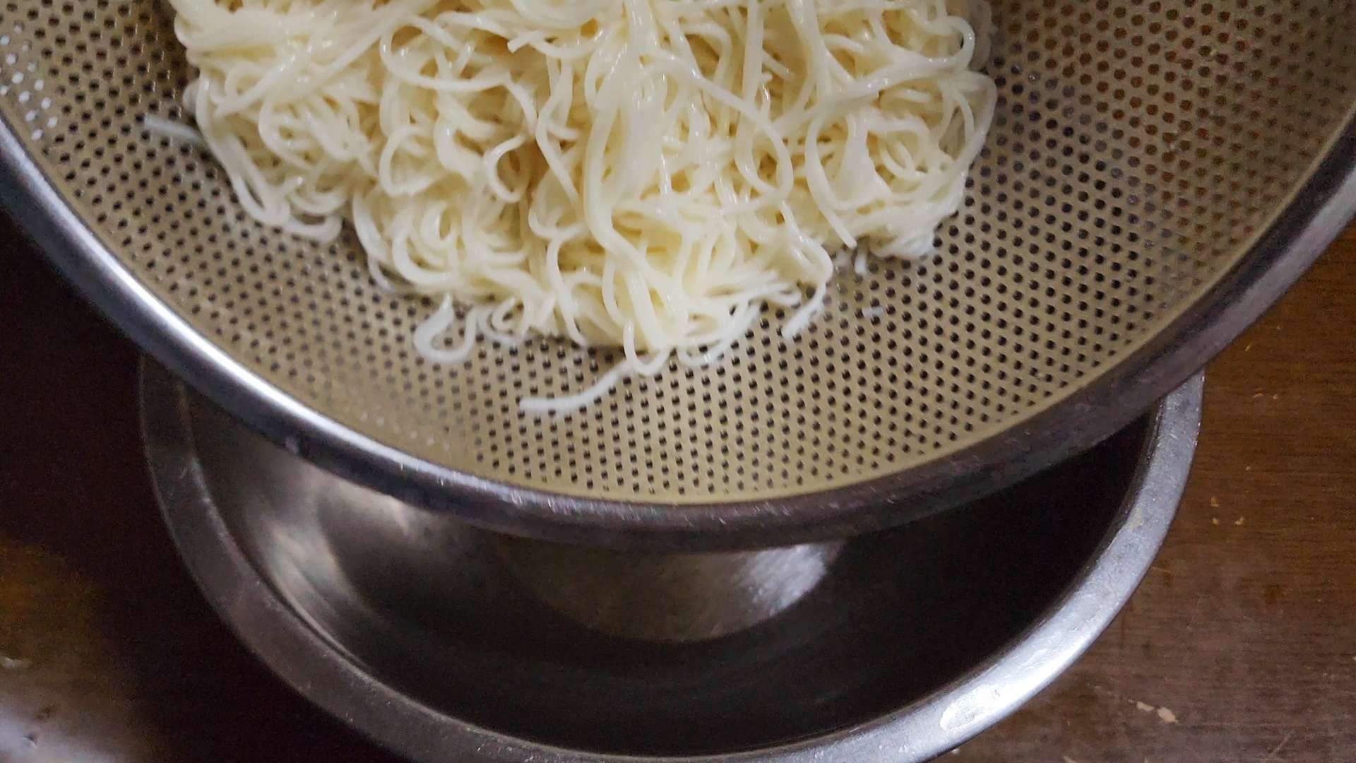 끓는 물에 소면 넣고 3분간 삶아 찬물에 헹구고 물기를 제거해줍니다.
