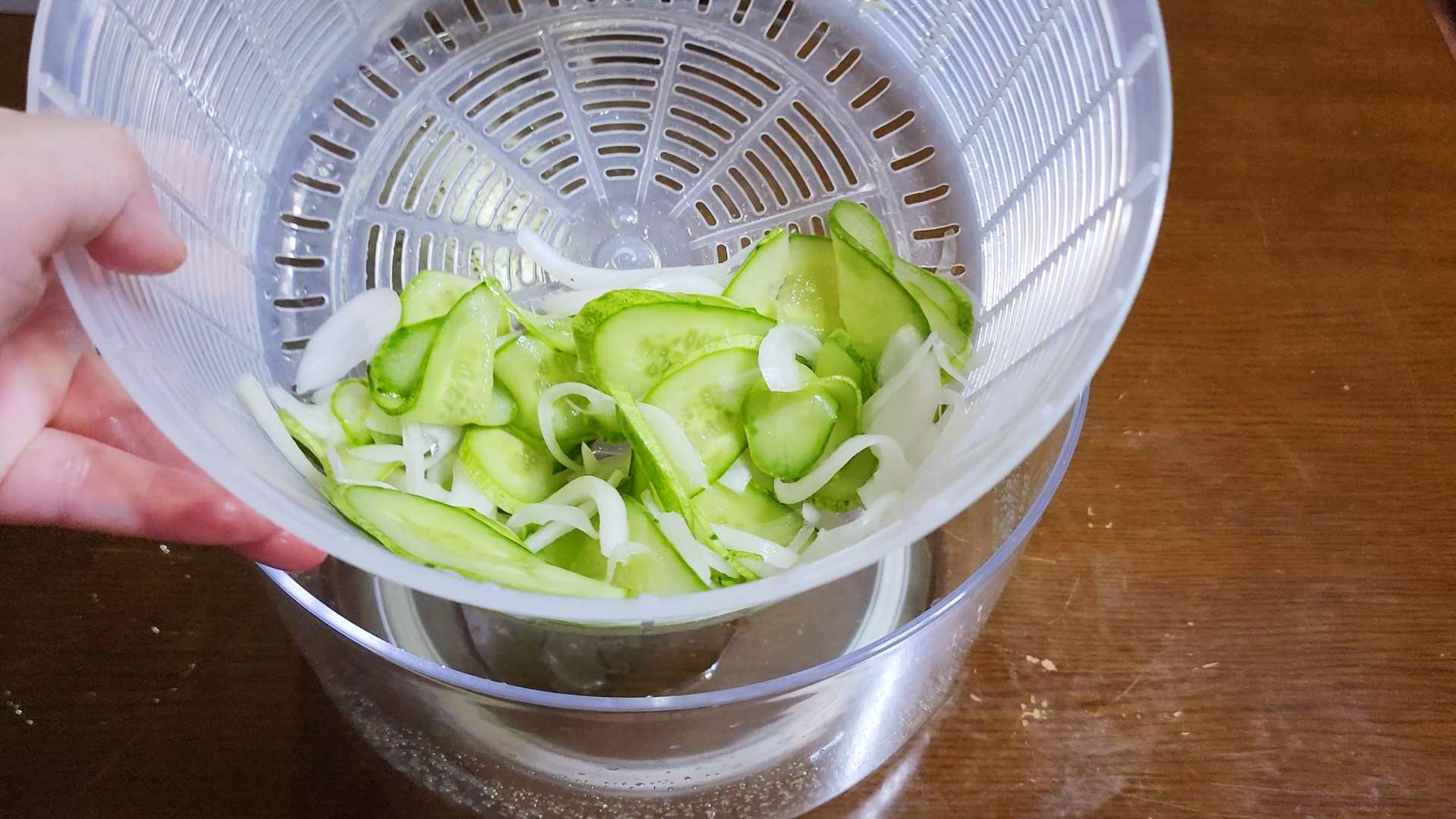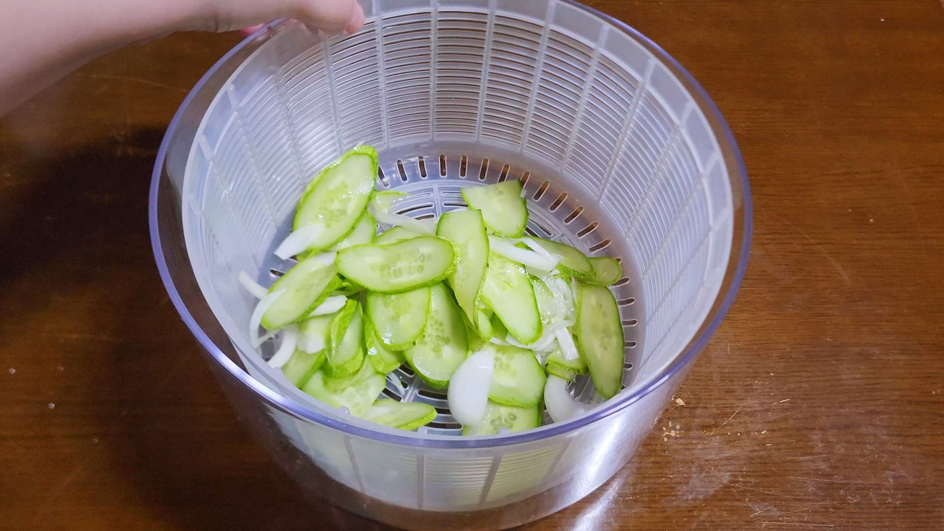 절인 오이, 양파는 물기를 꼭 짜줍니다.