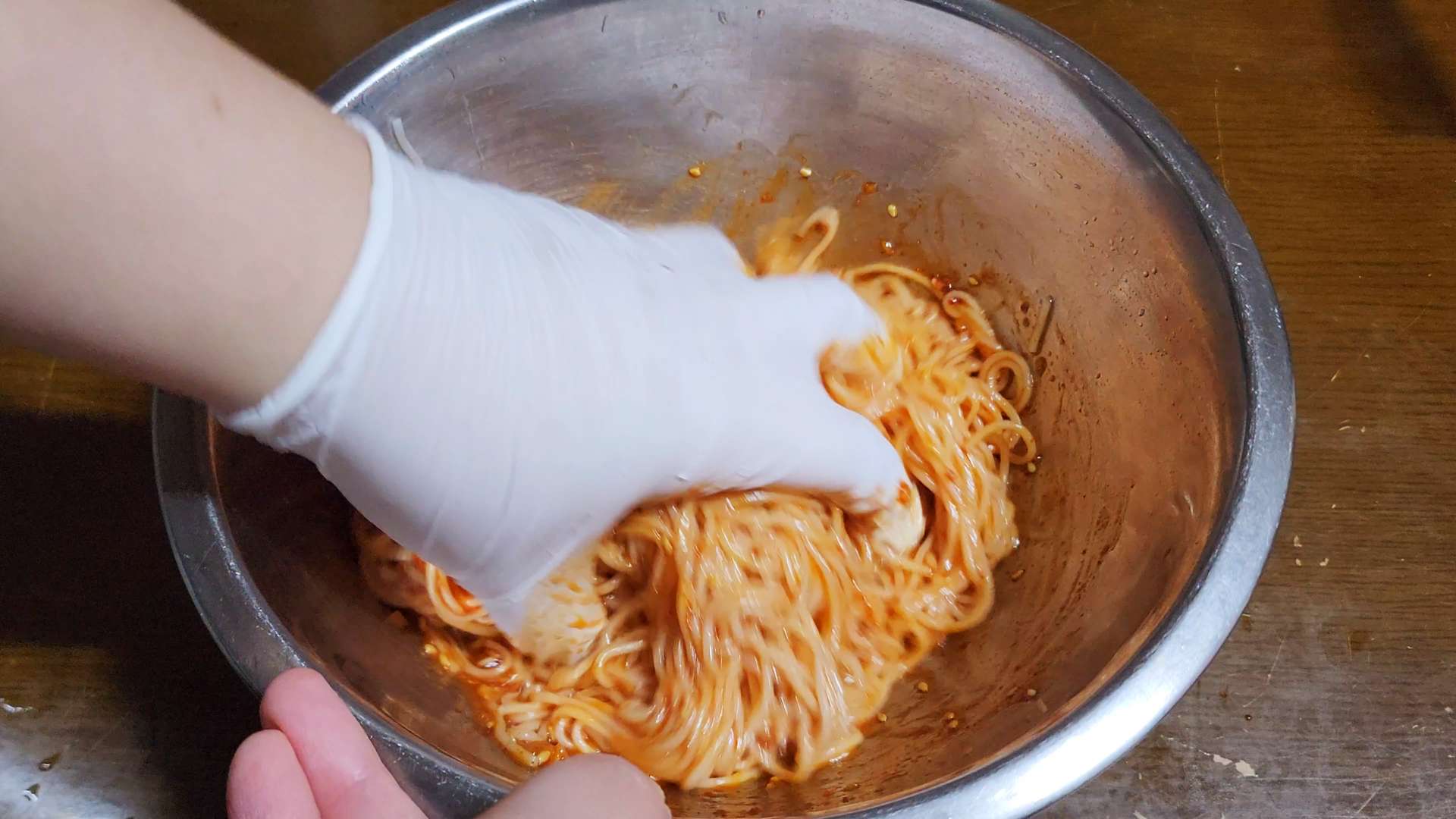 볼에 삶은 면, 비빔 양념장을 넣고 버무려줍니다.