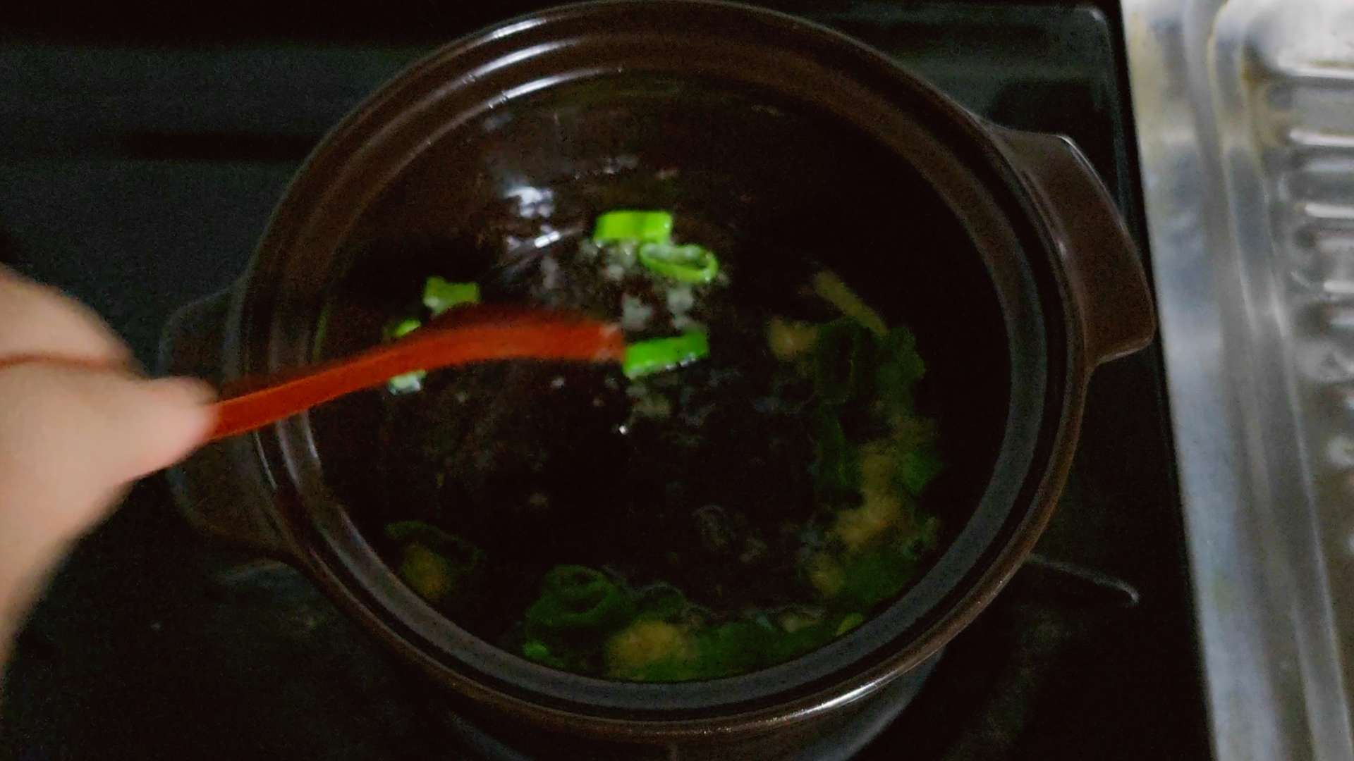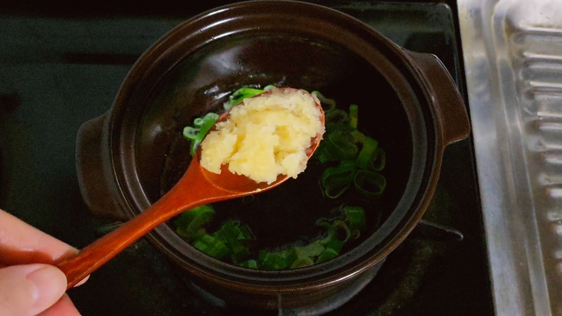 강불로 예열한 뚝배기에 식용유 2바퀴, 대파, 다진마늘 넣고 볶아줍니다.