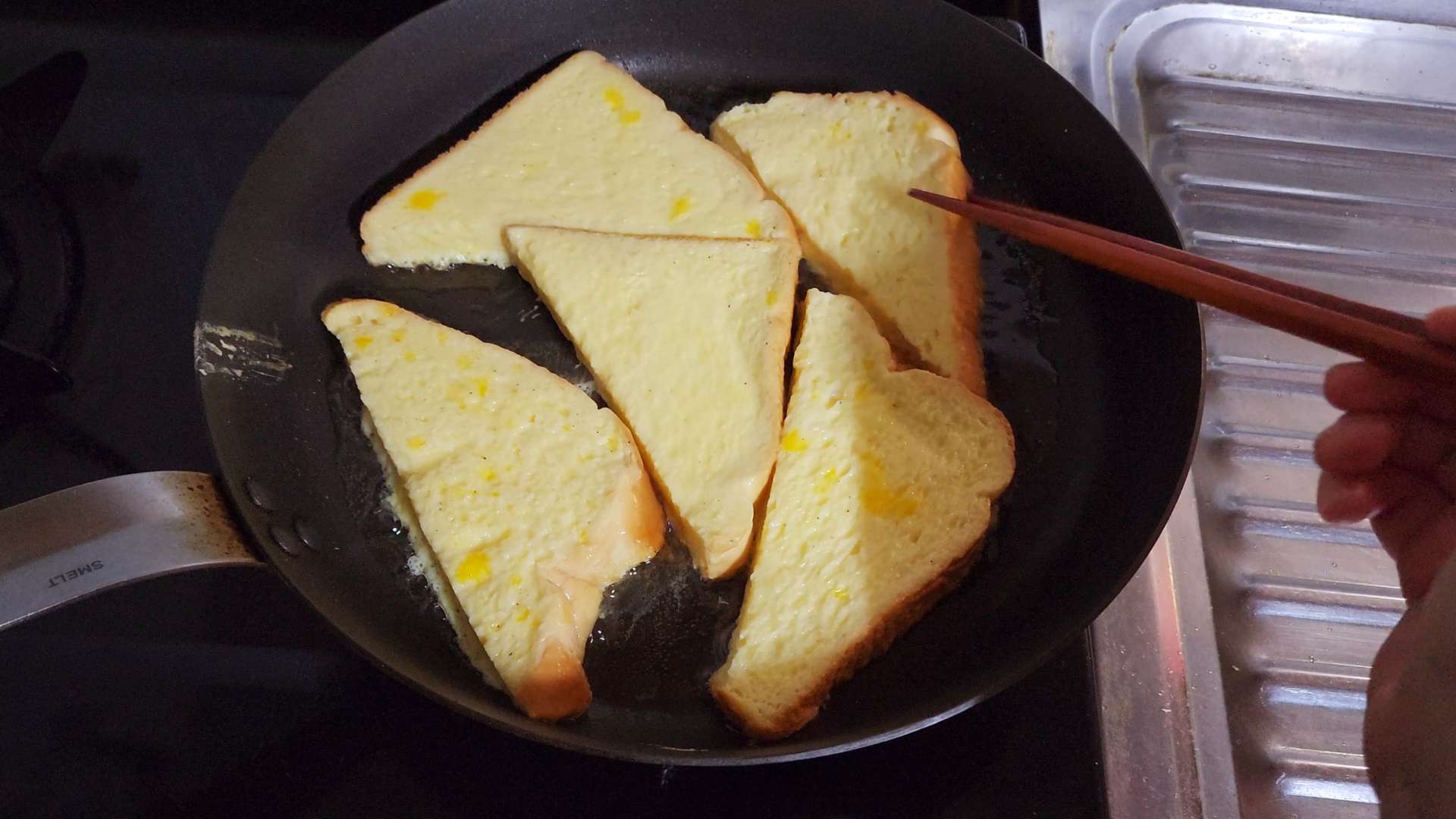 중불로 예열한 팬에 식용유을 넣고 식빵을 올려 중불에서 앞뒤로 노릇하게 구워줍니다.