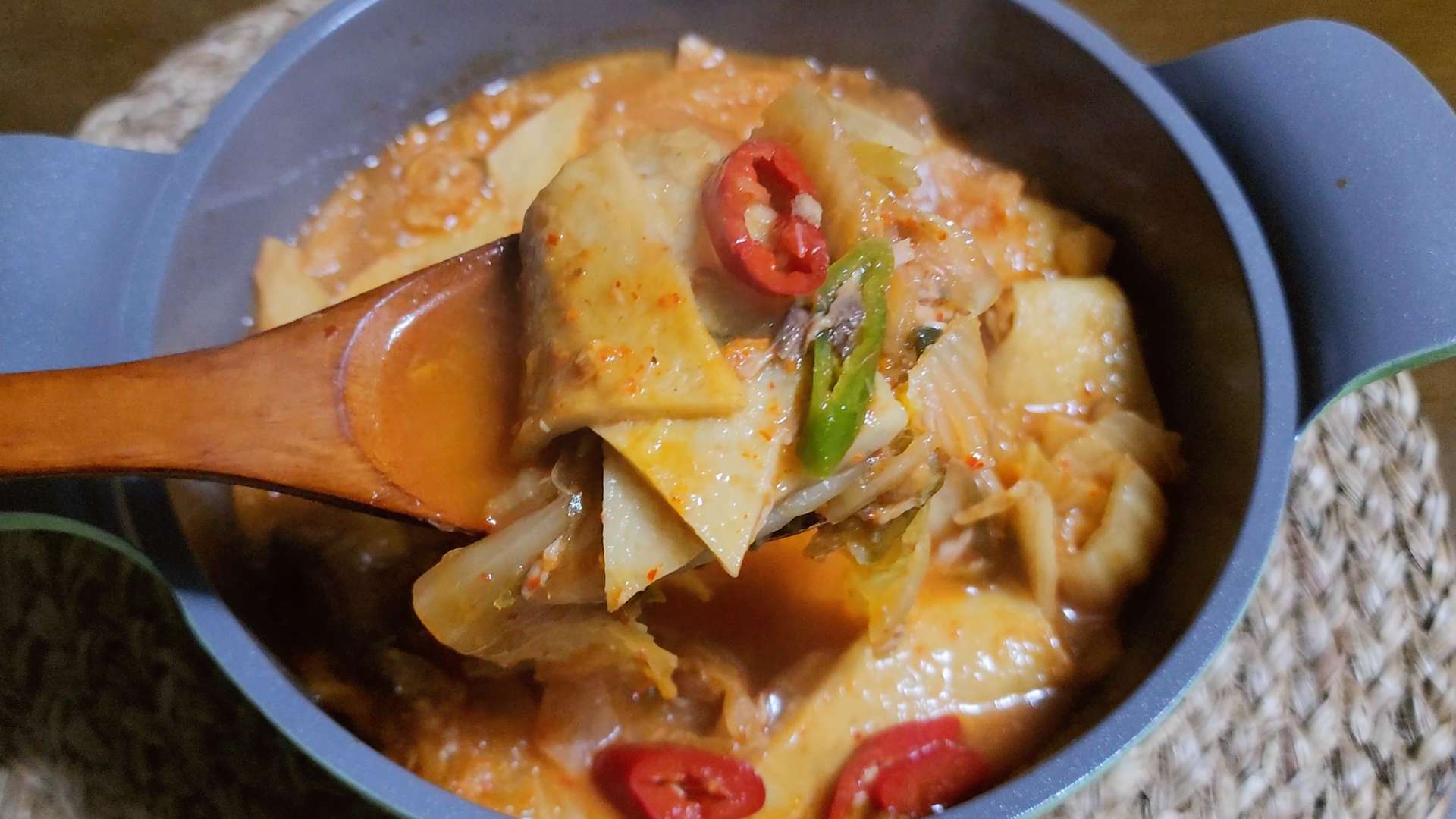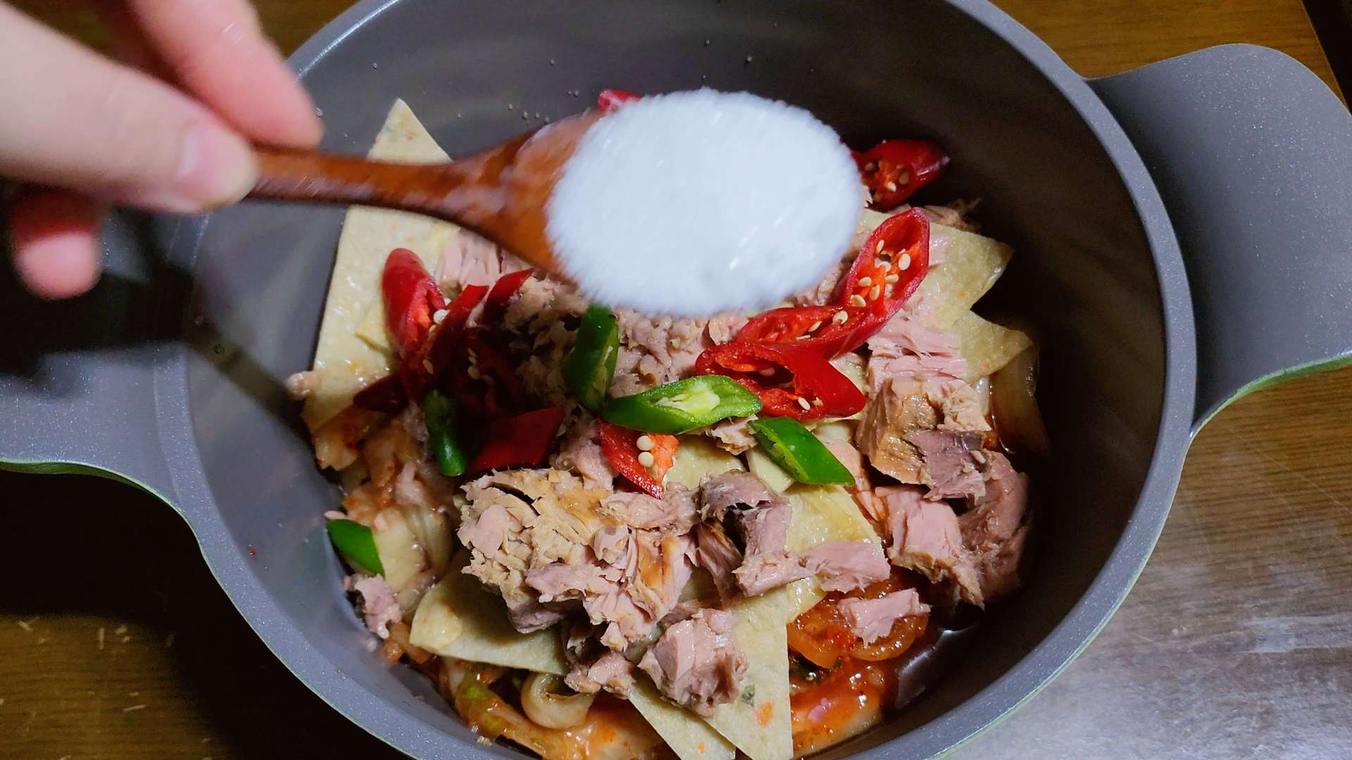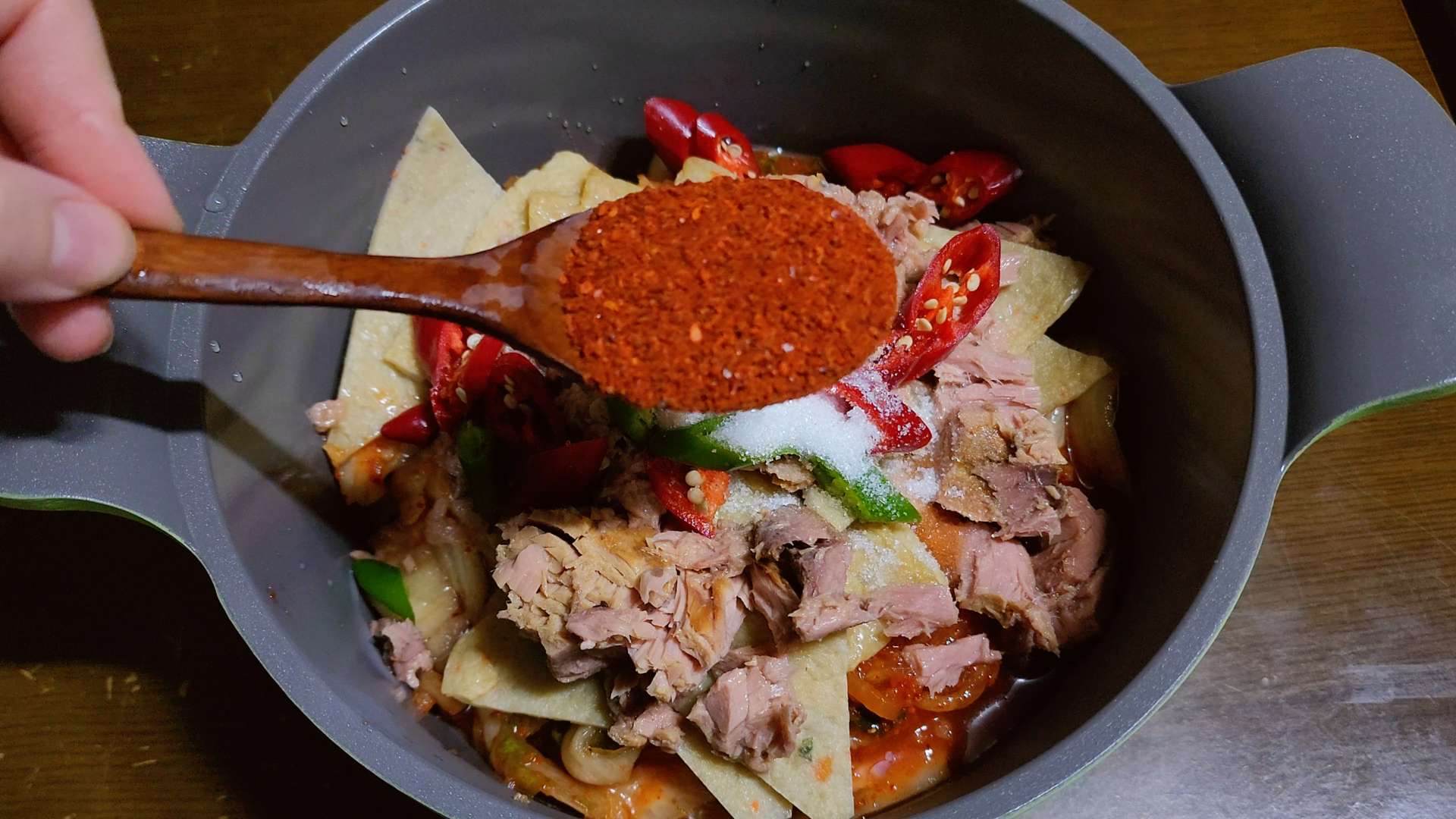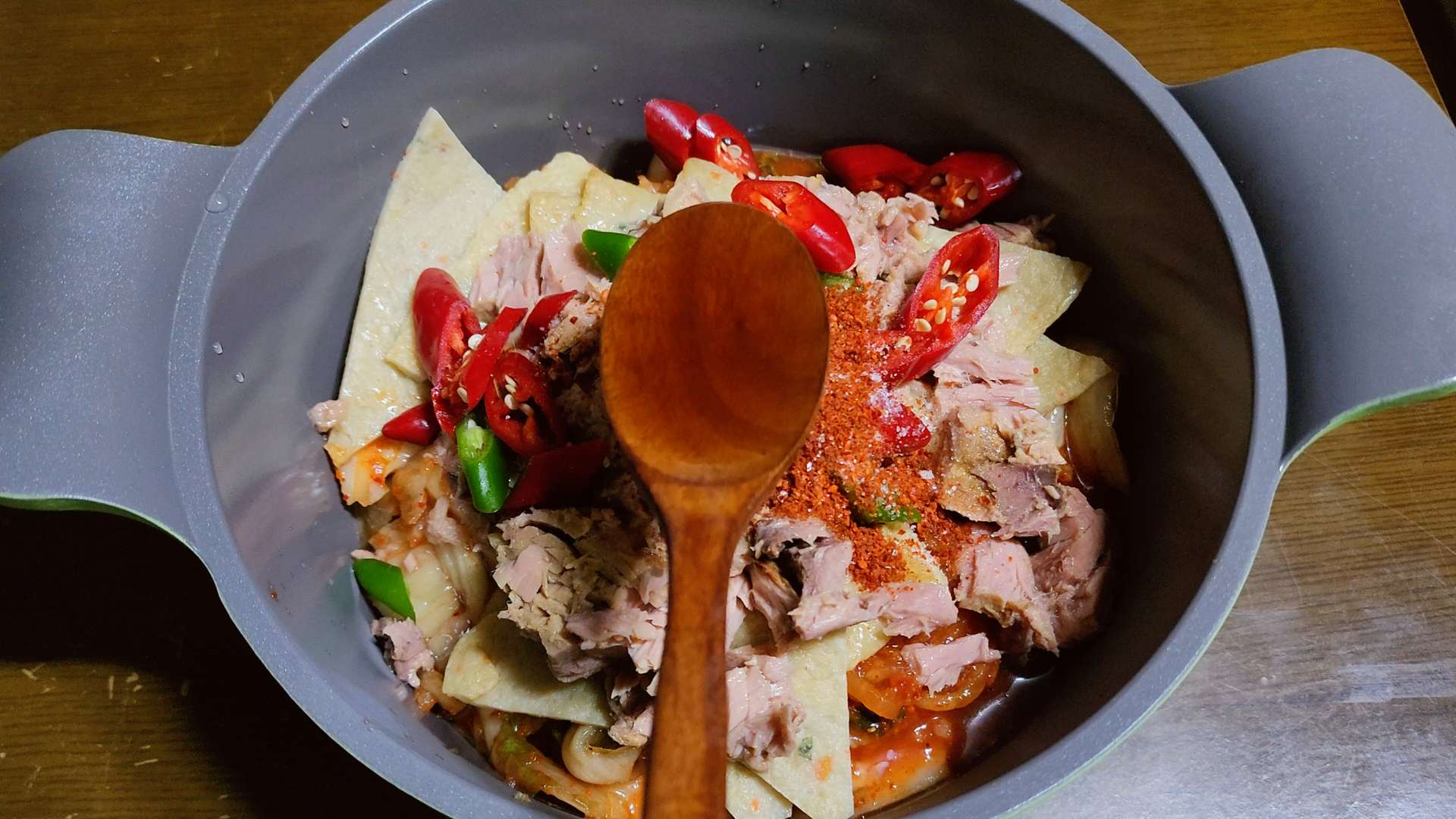 재료: 김치 1/4포기 사각어묵 3장, 참치 통조림 1개, 홍고추 1개, 청양고추 1개, 물 600ml, 김칫국물 60ml, 설탕 1T, 고춧가루 1T, 참치액 1T