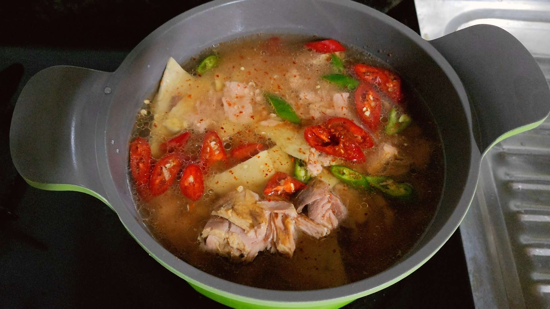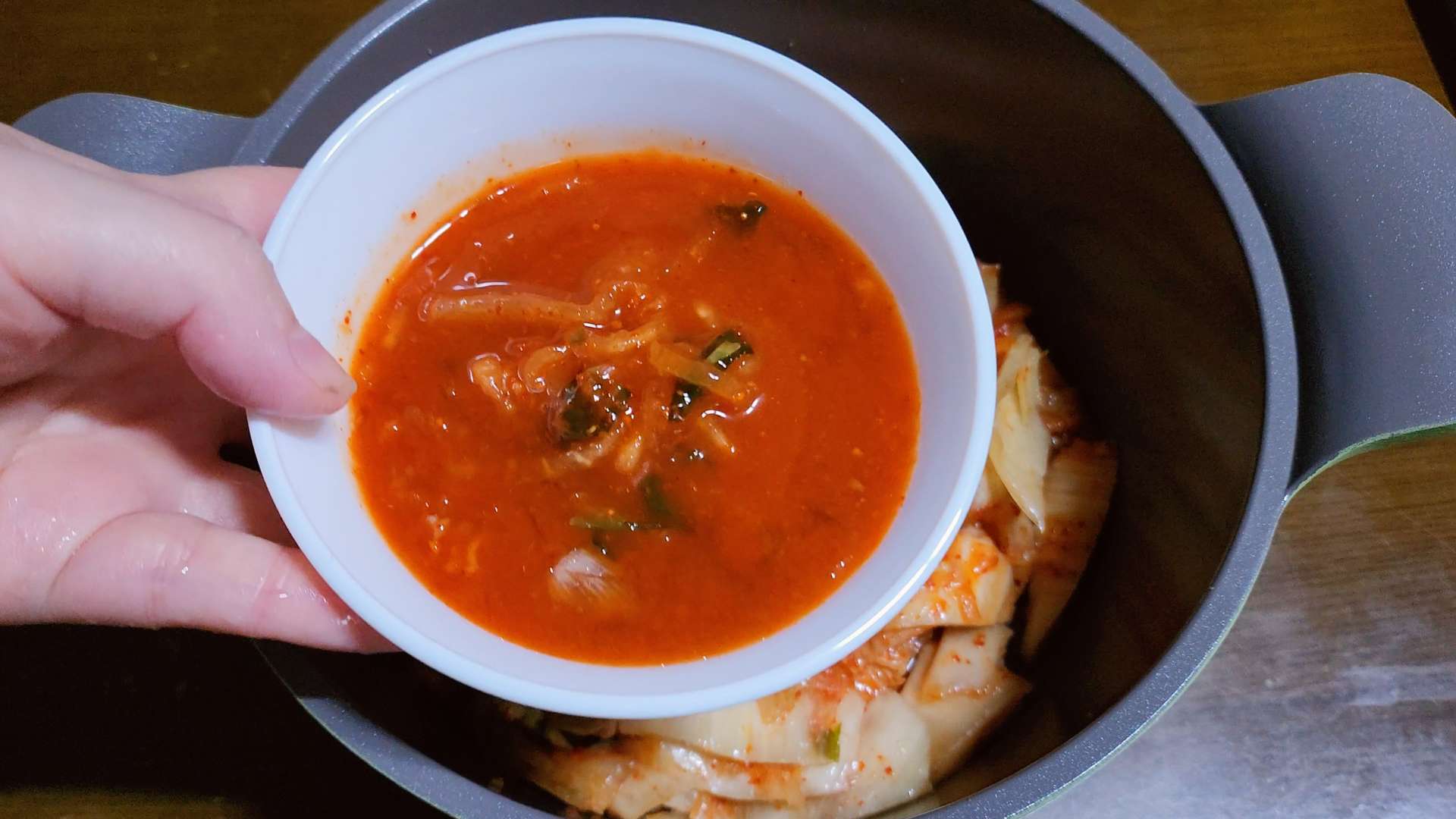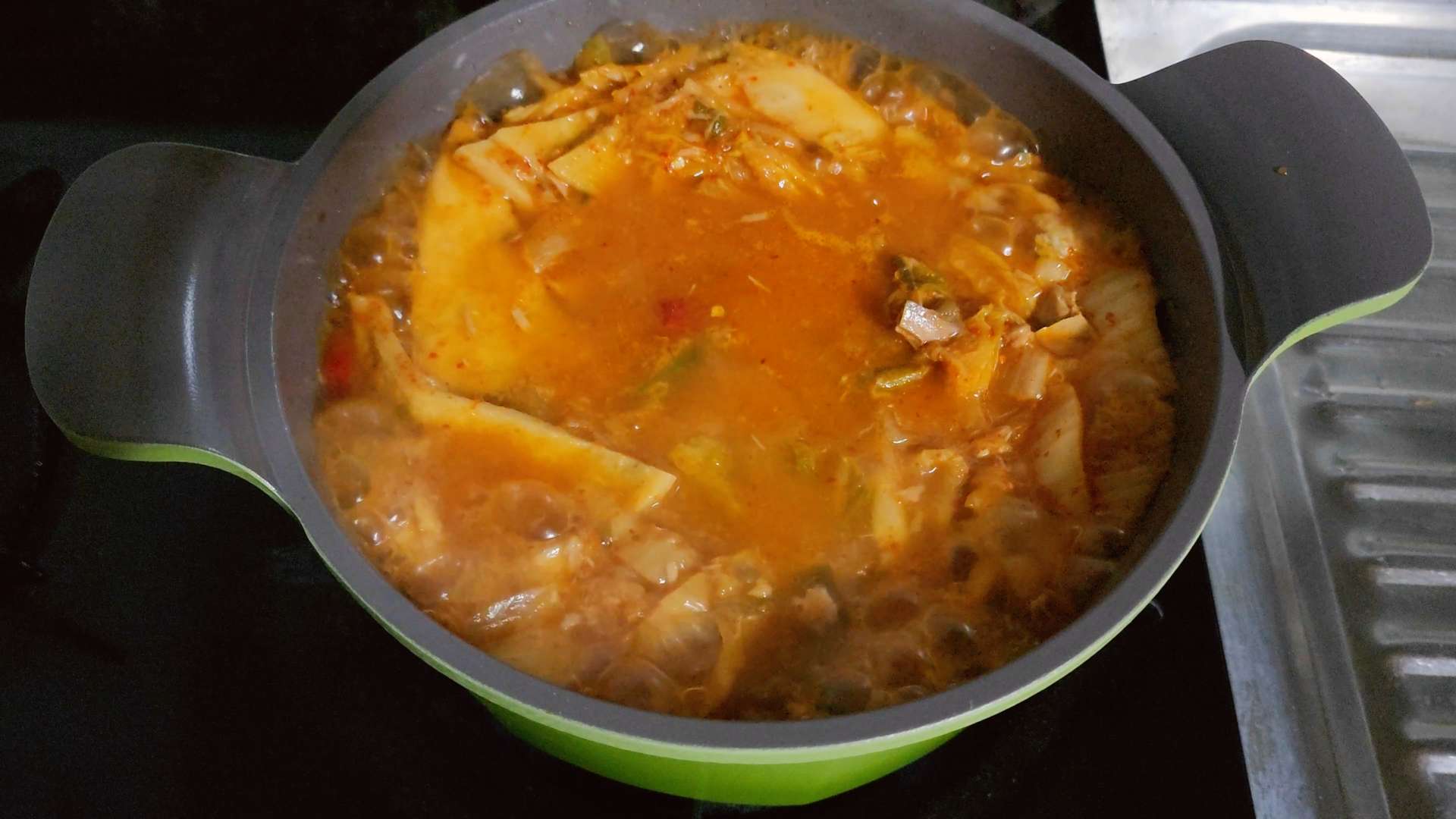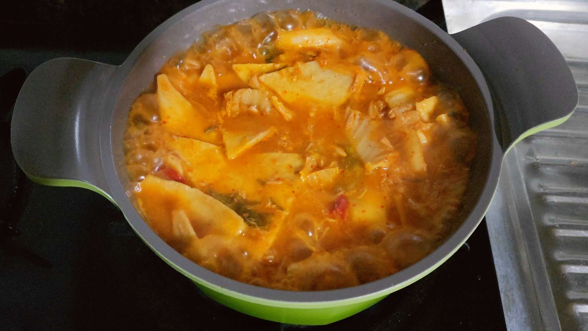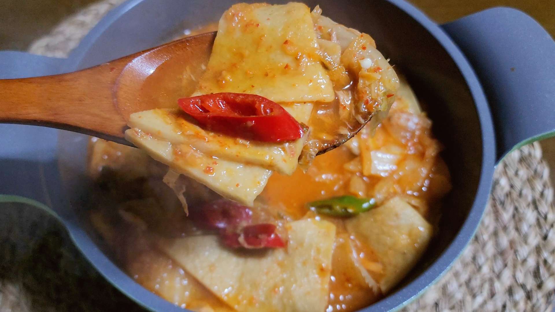 재료: 김치 1/4포기 사각어묵 3장, 참치 통조림 1개, 홍고추 1개, 청양고추 1개, 물 600ml, 김칫국물 60ml, 설탕 1T, 고춧가루 1T, 참치액 1T