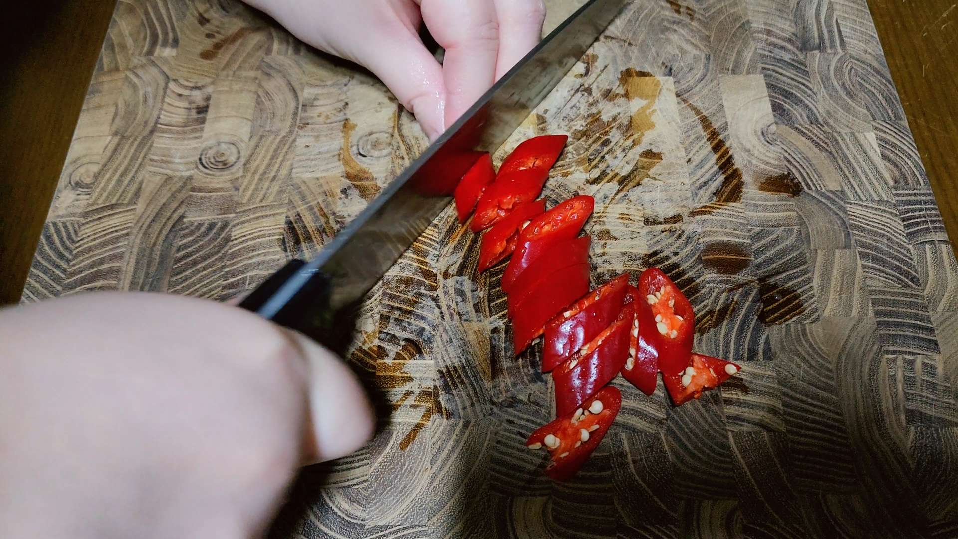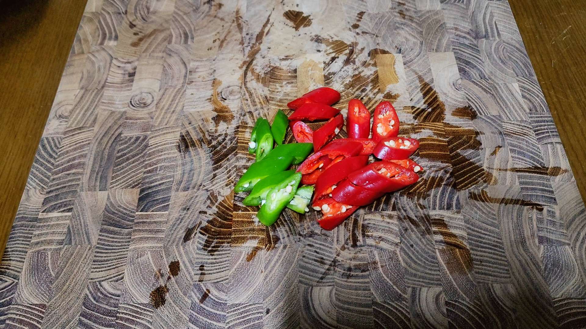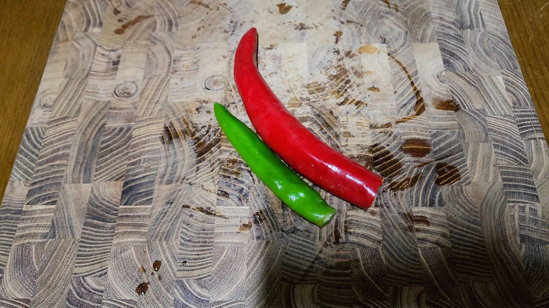 청양고추 1개, 홍고추 1개는 어슷 썰어줍니다.