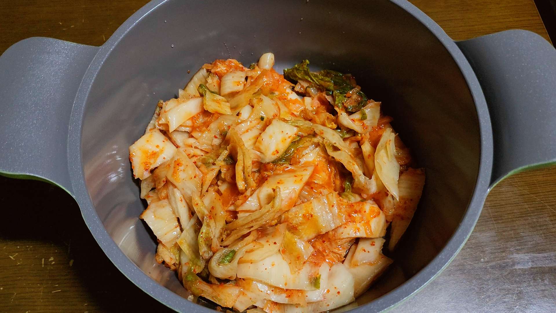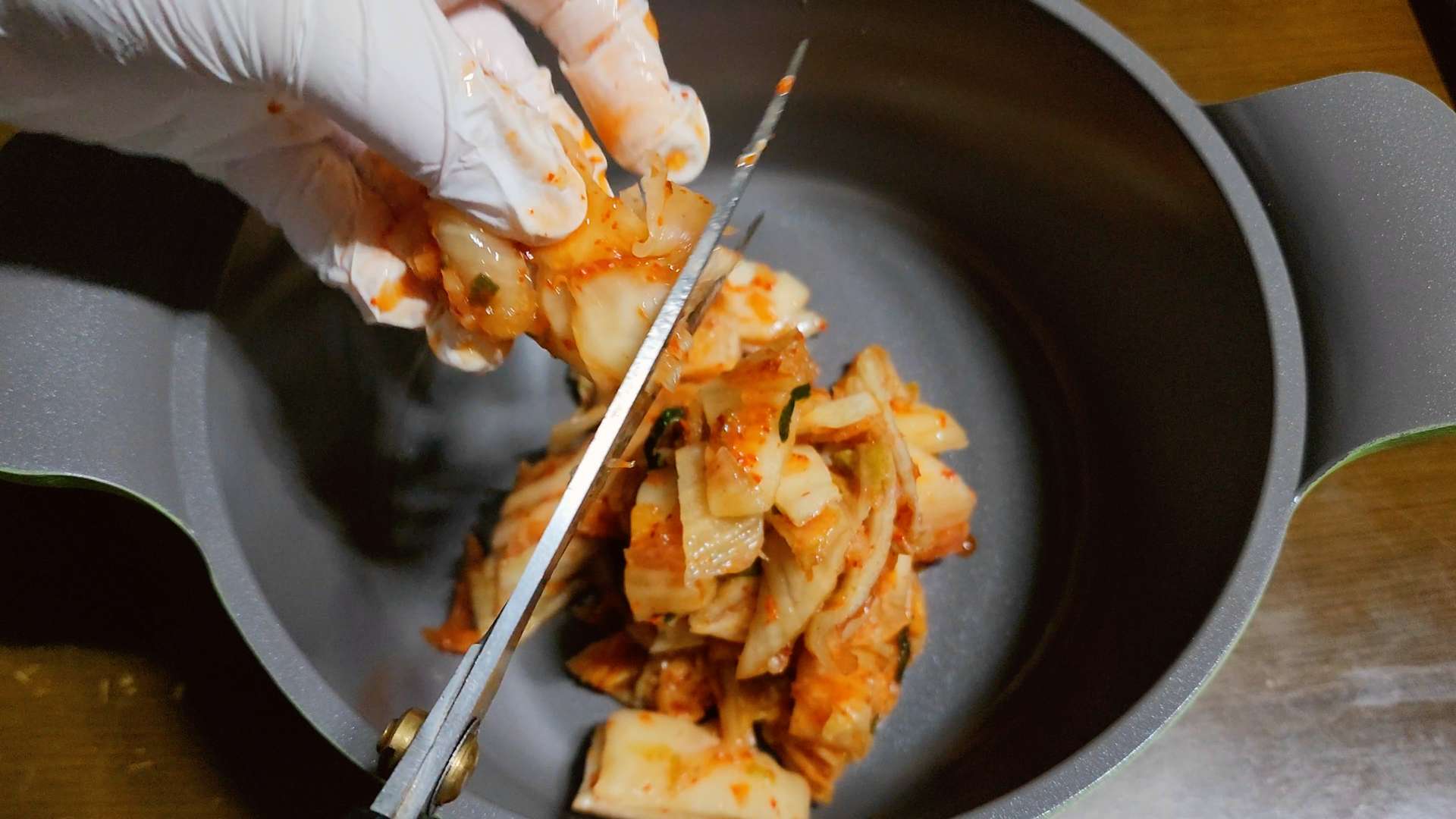 김치 1/4포기는 냄비에 김치를 먹기 좋은 크기로 잘라 넣어줍니다.