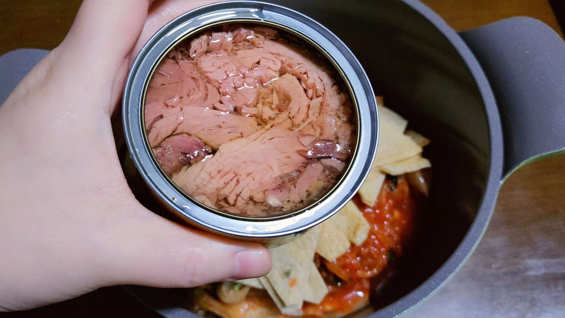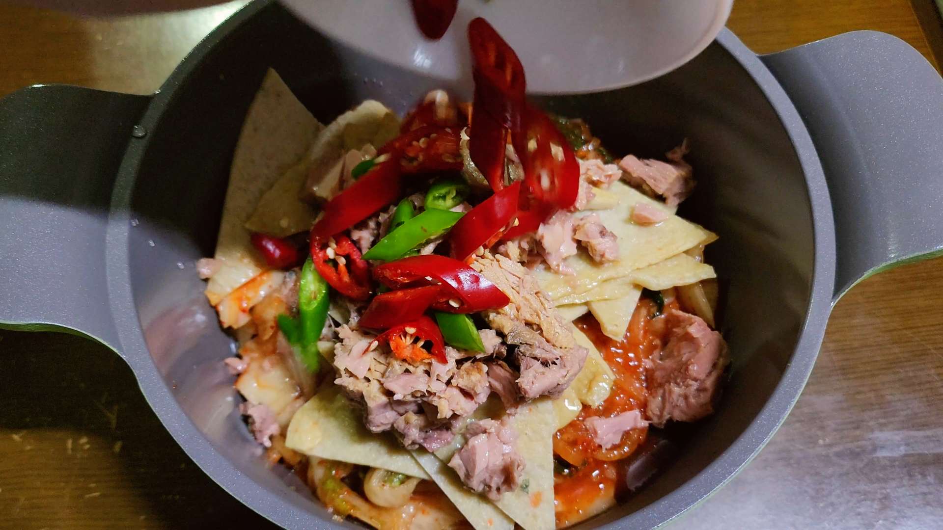 냄비에 김칫국물 60ml, 어묵, 참치 통조림, 홍고추, 청양고추를 넣어줍니다.
