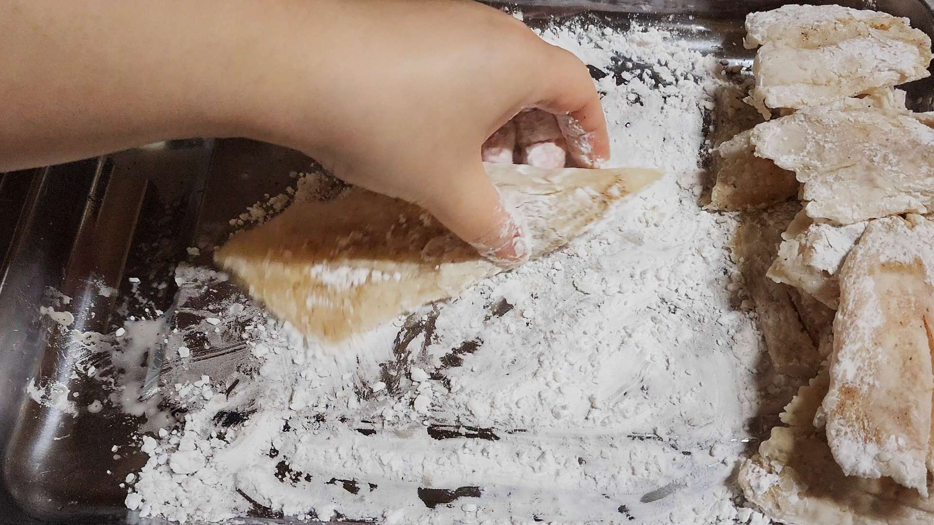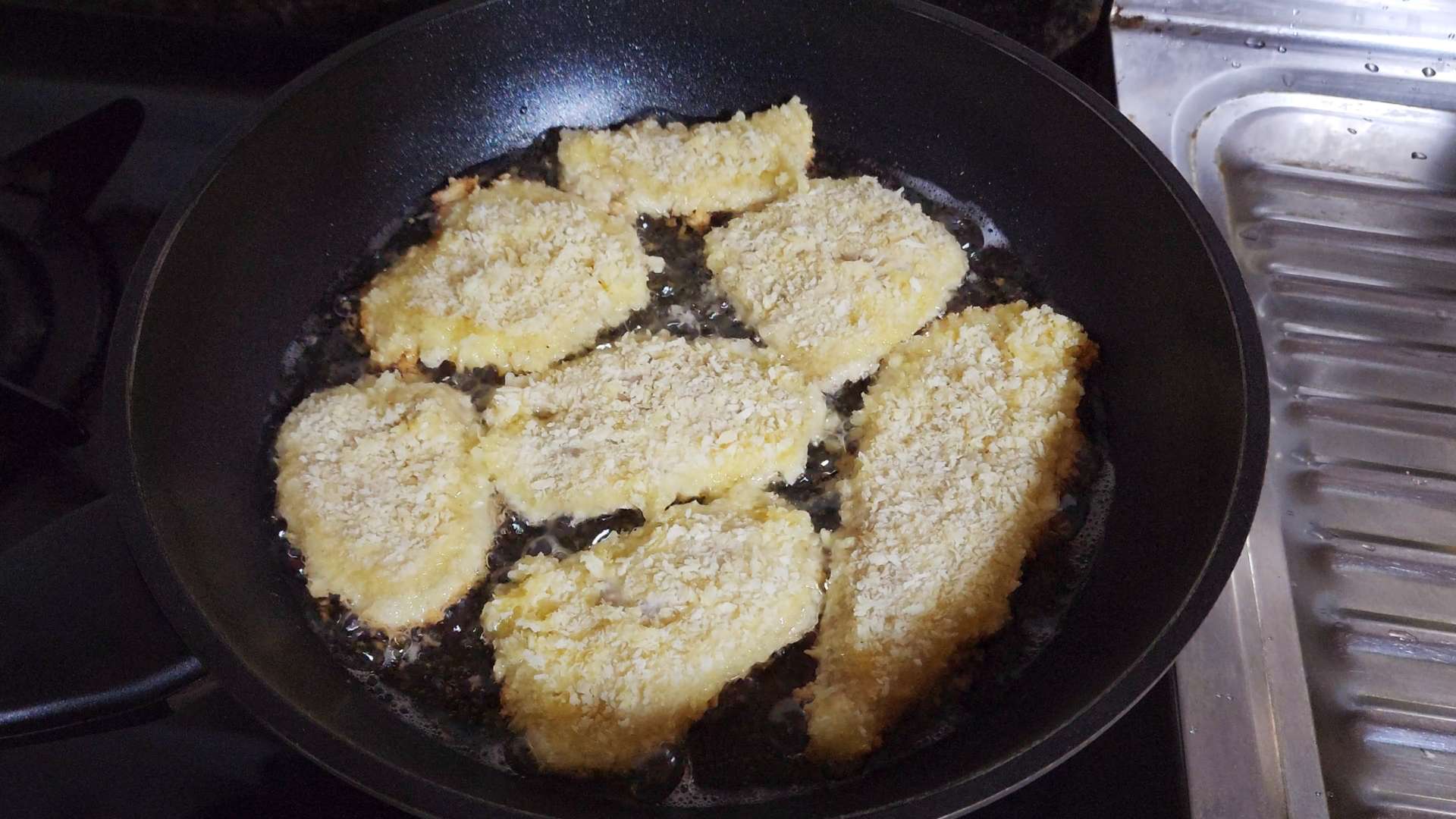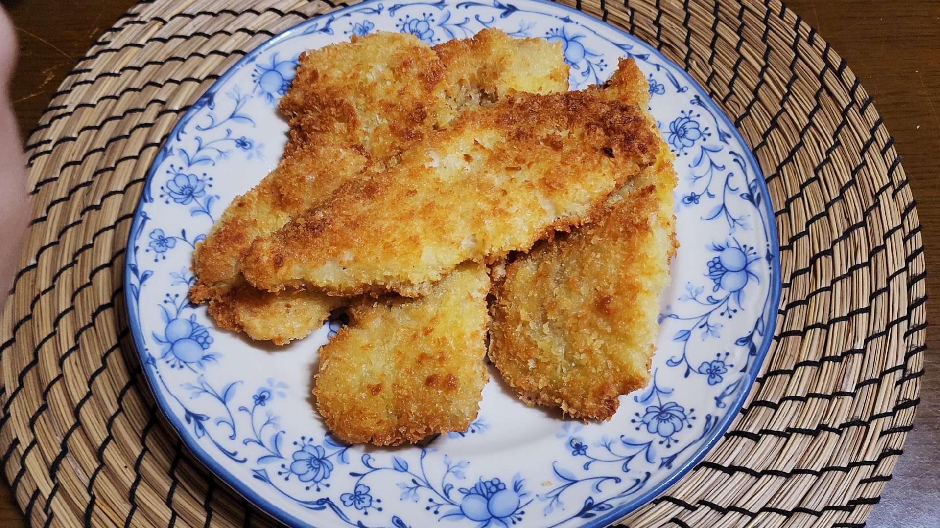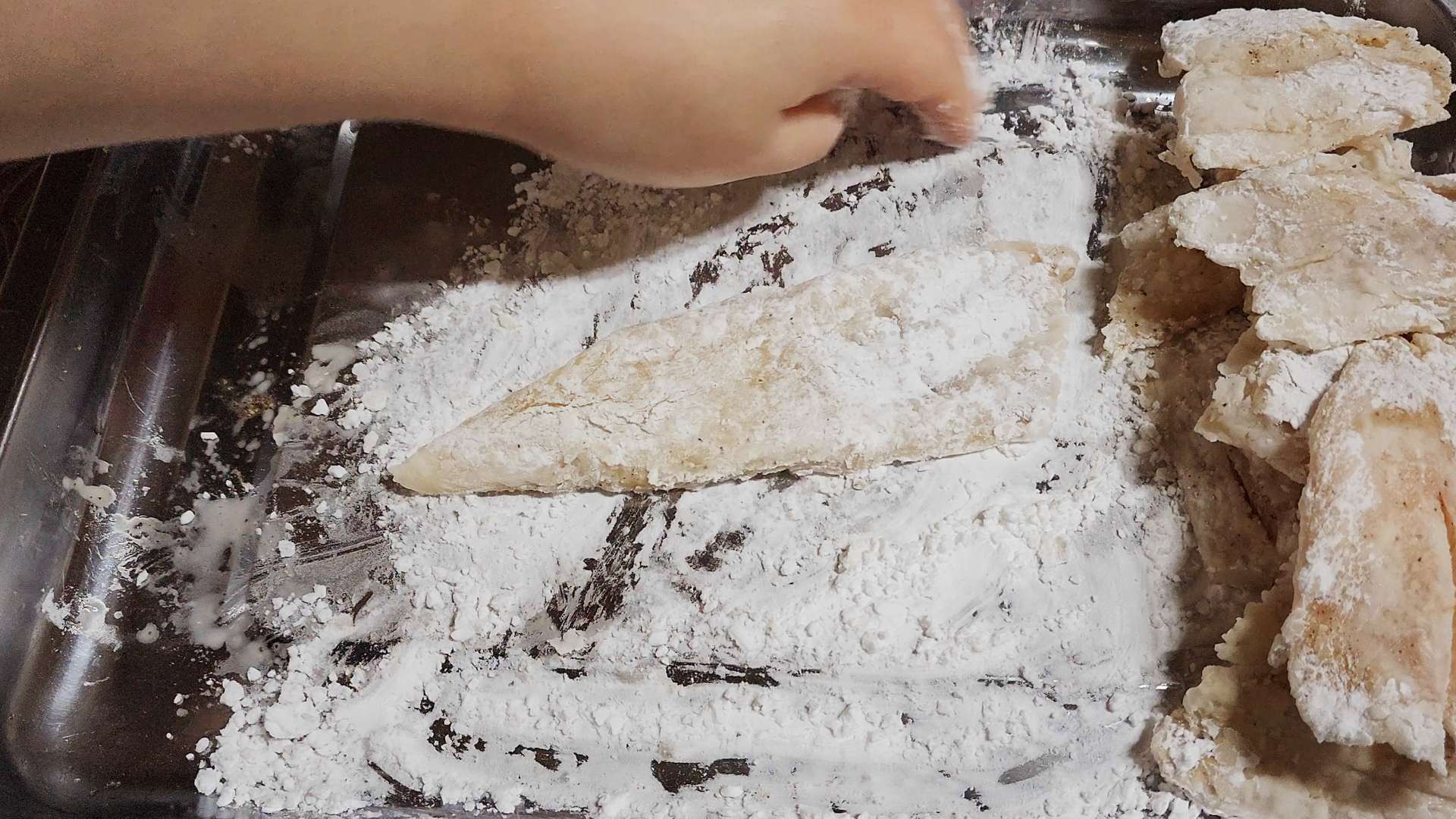 재료: 냉동 동태포 500g, 전분가루, 빵가루, 달걀 3개 소금 한꼬집, 후추, 식용유