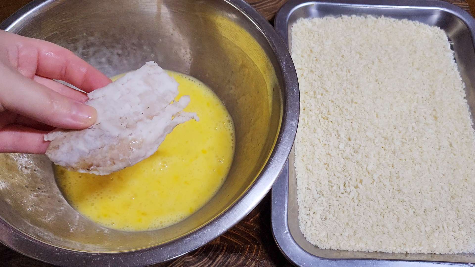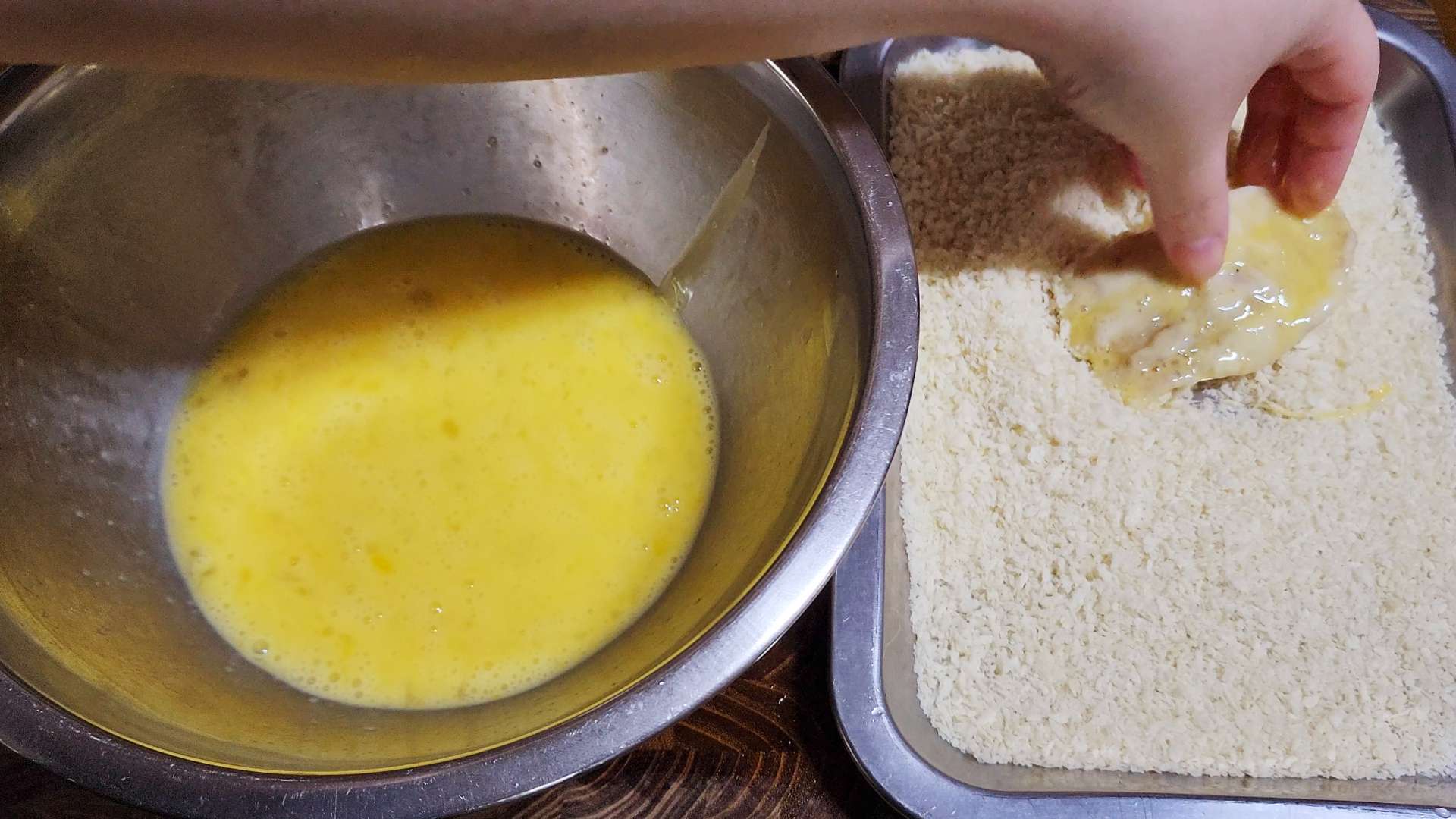전분가루 -> 달걀물 -> 빵가루 순으로 묻혀줍니다.