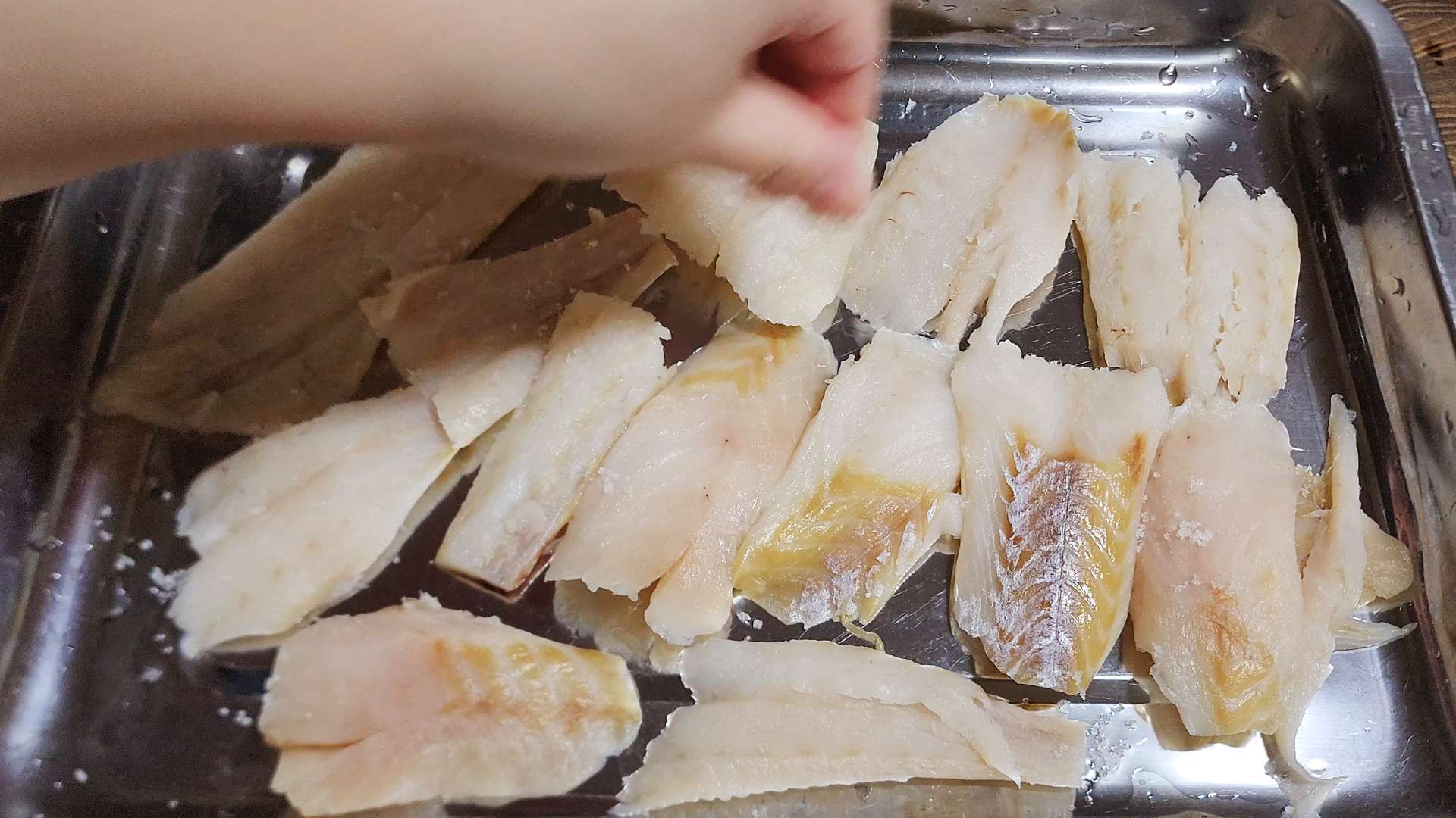 동태포에 소금 한꼬집, 후추로 밑간해 5분간 재워줍니다.