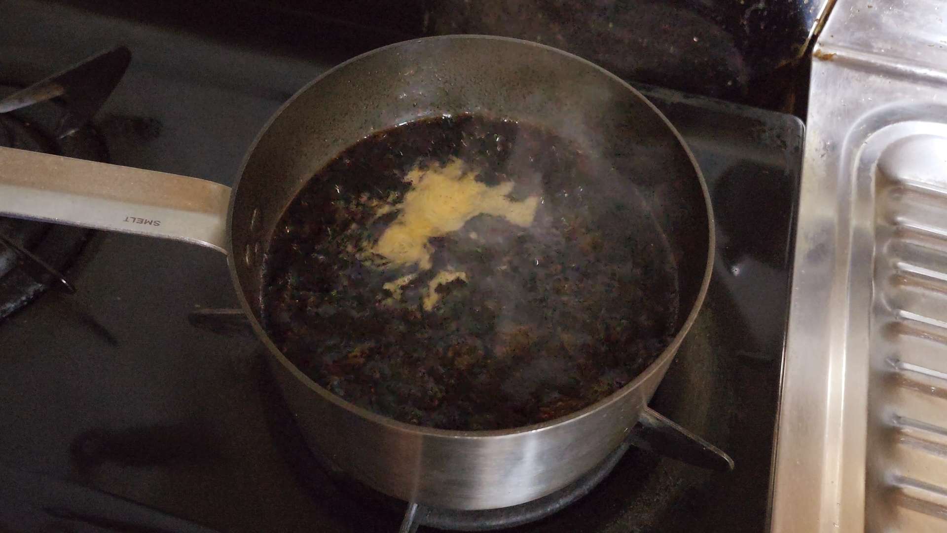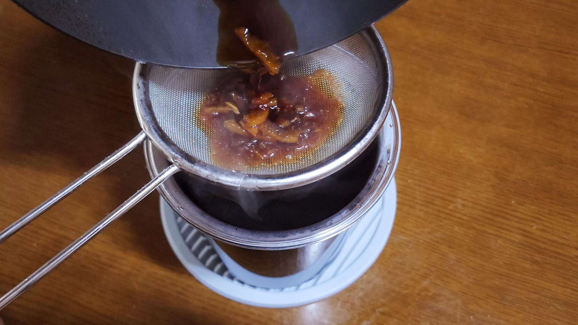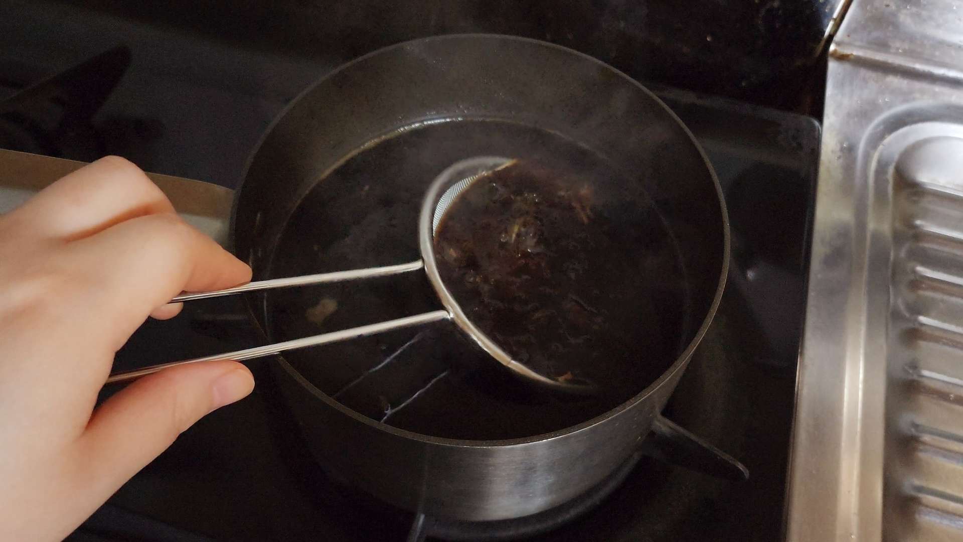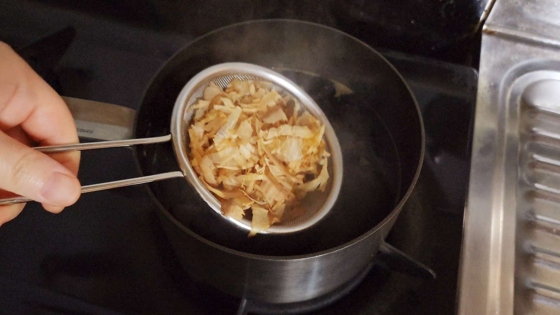 불을 끈 뒤 가쓰오부시 한 줌을 체에 넣고 2분 정도