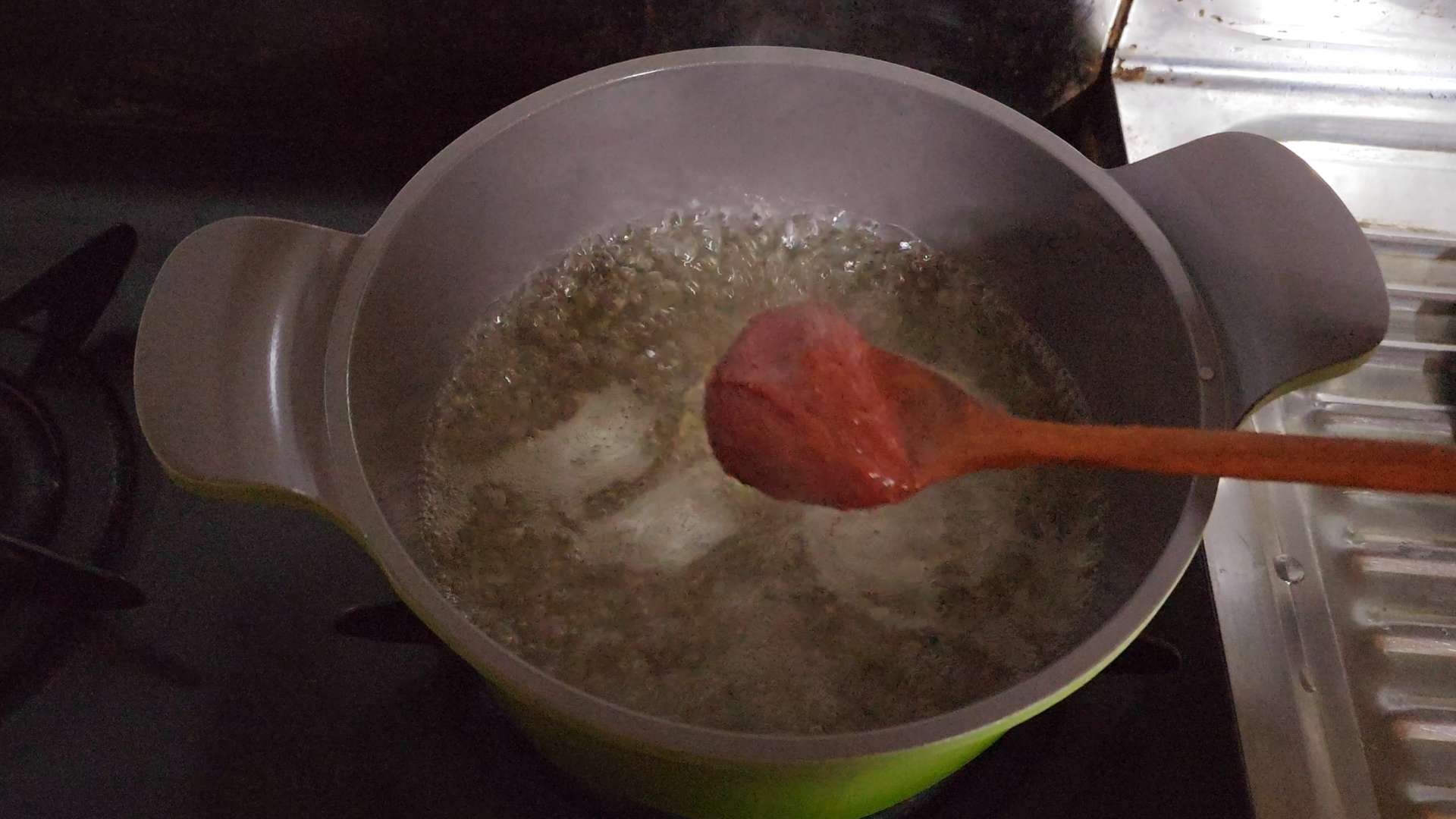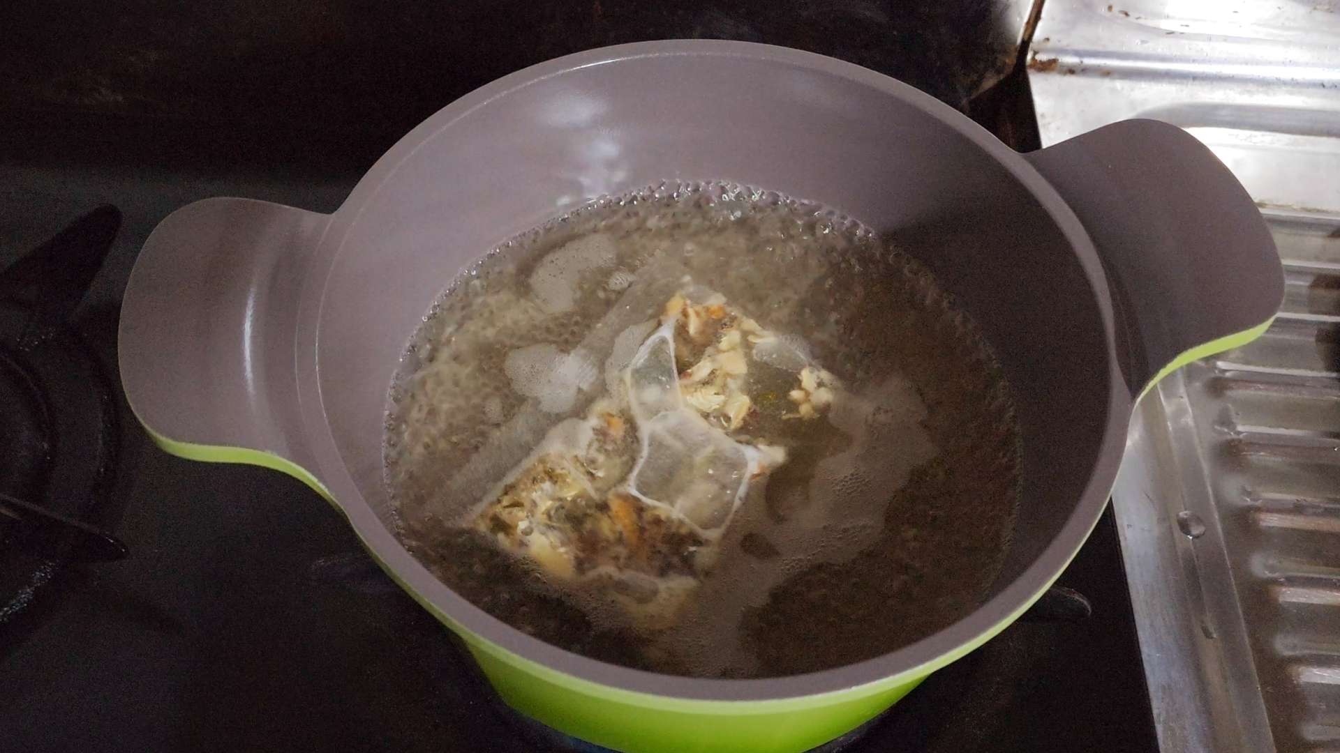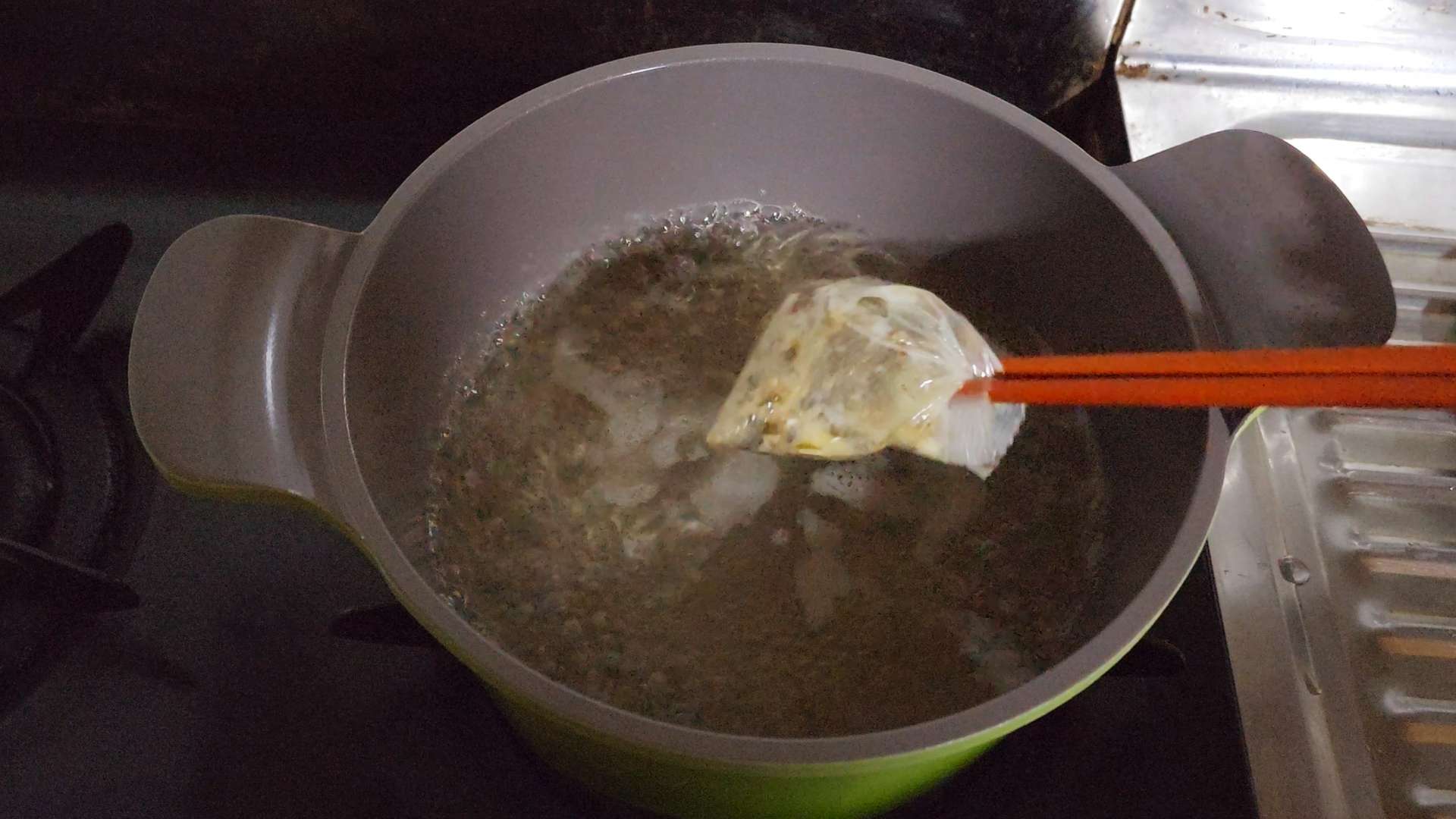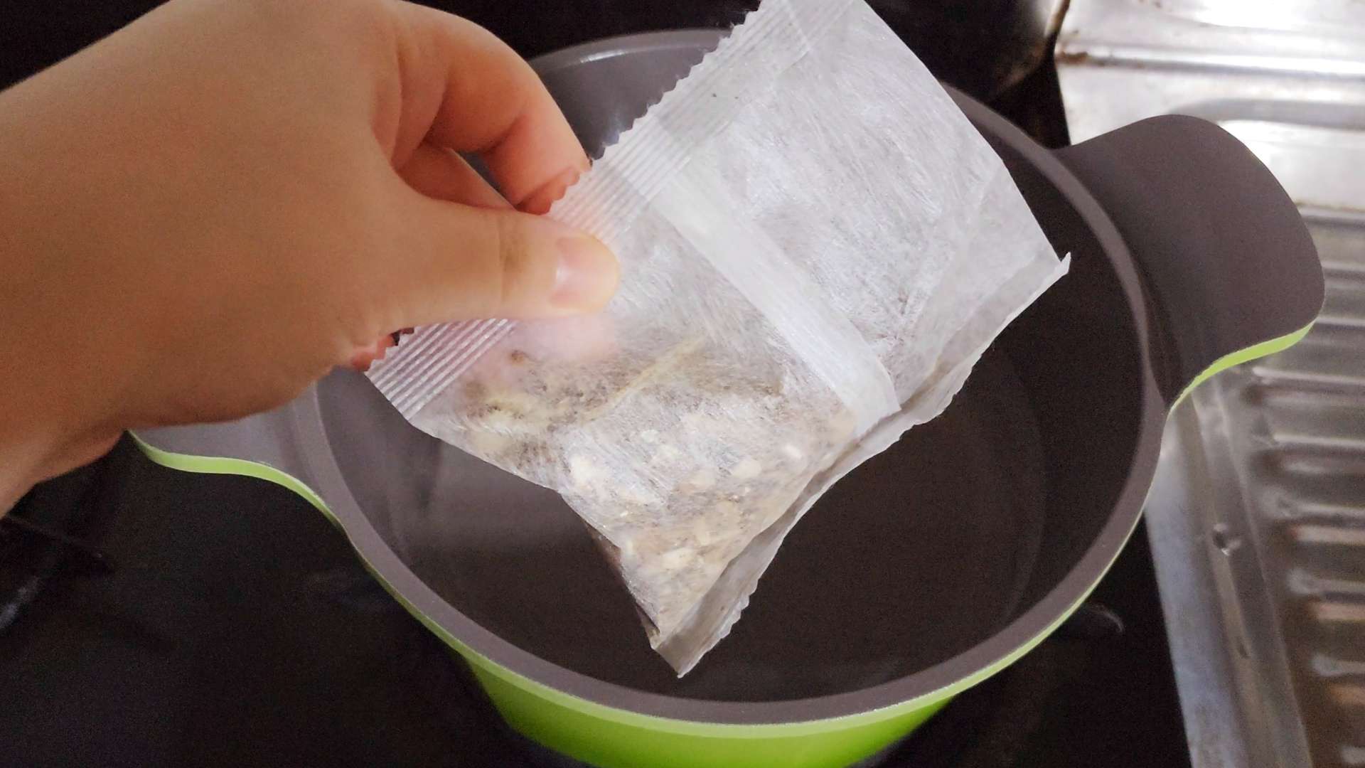 물 700ml, 멸치다시마팩 1개 넣고 강불에서 5분 정도 끓여줍니다.