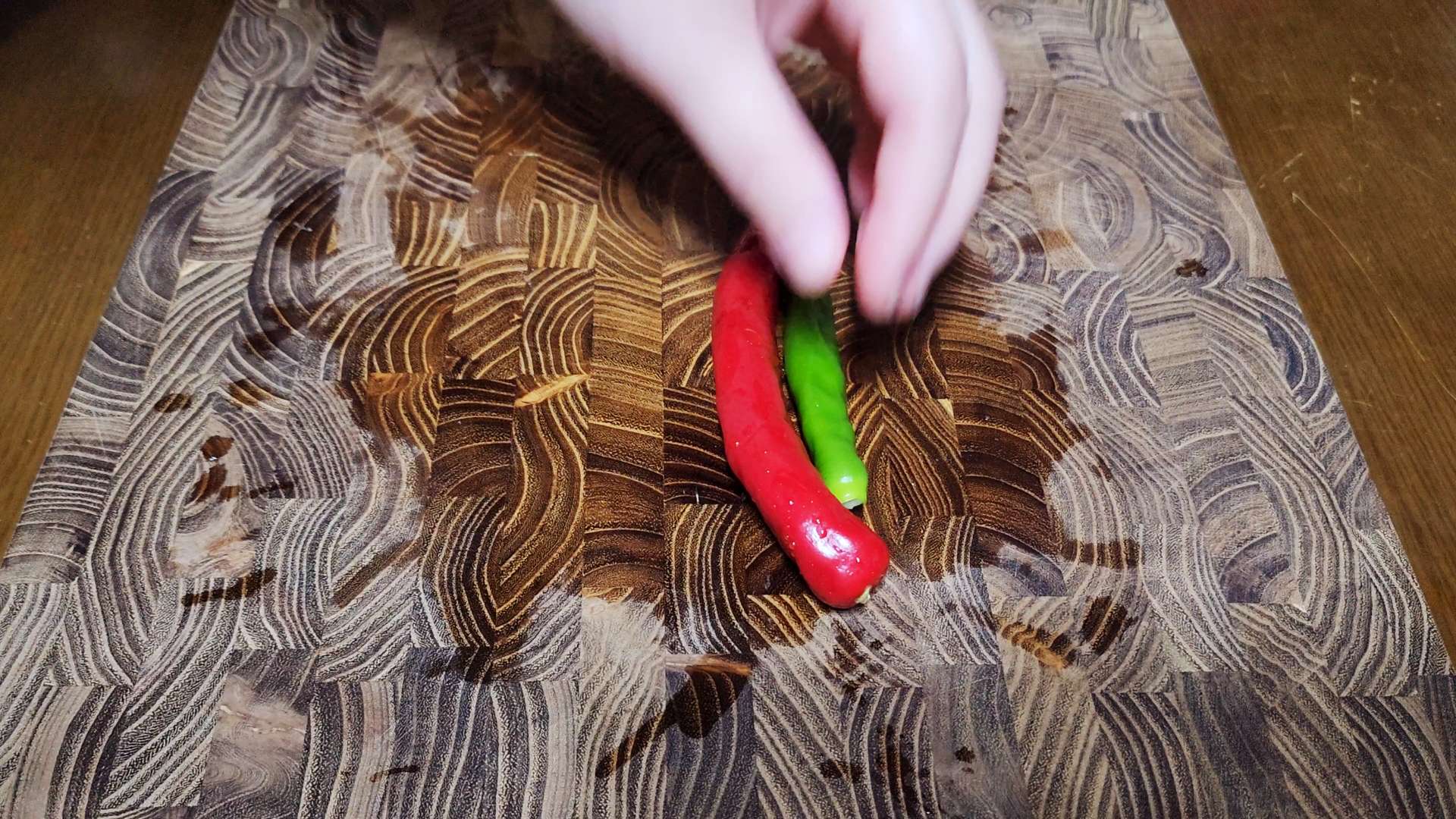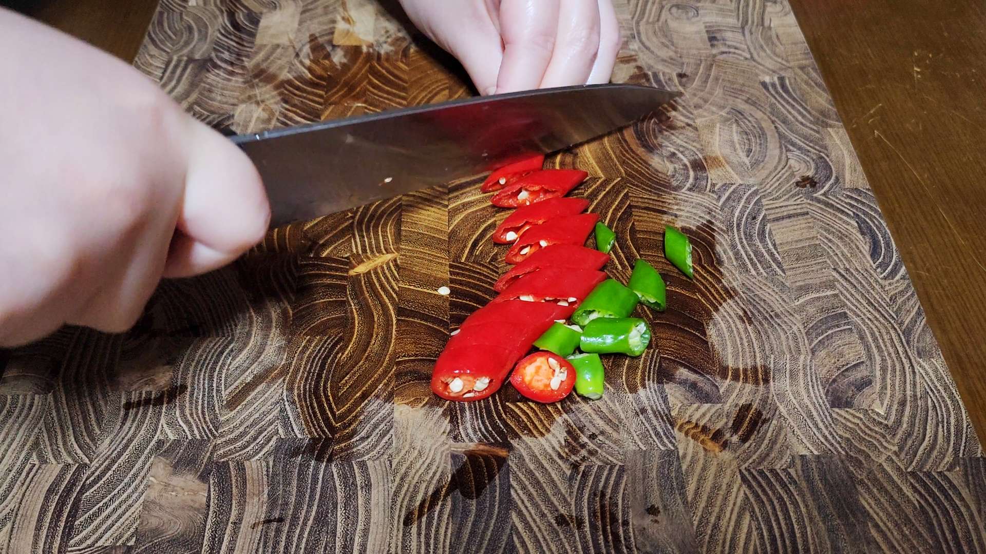 청양고추, 홍고추는 어슷 썰어줍니다.