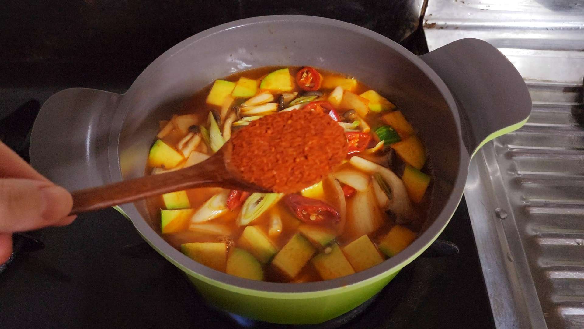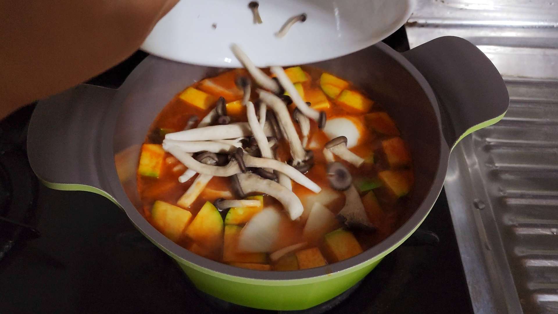 애호박, 양파, 느타리버섯, 대파, 고추를 넣어줍니다.