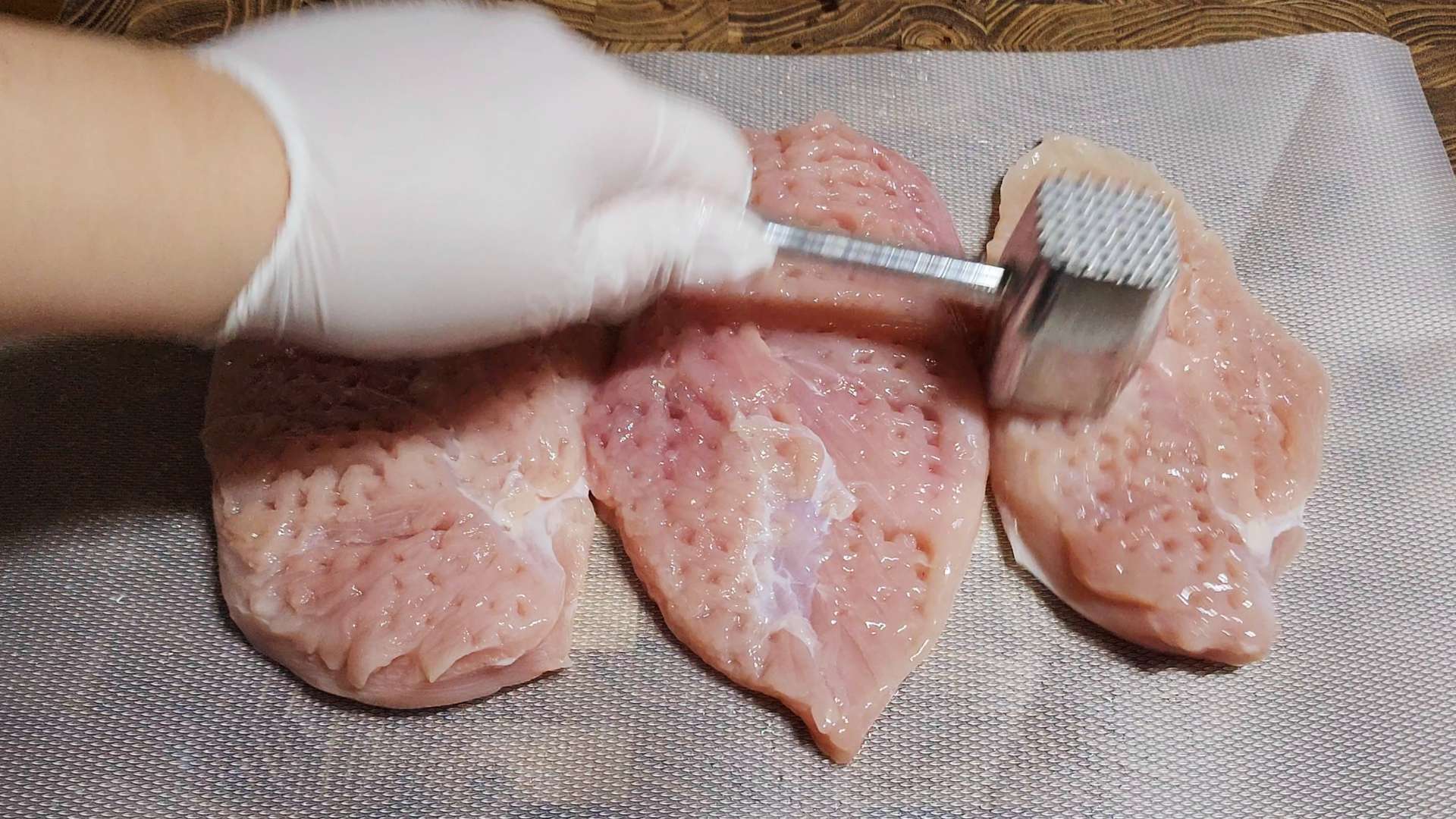 닭가슴살은 망치로 앞뒤를 두드려 넓게 펴줍니다.
