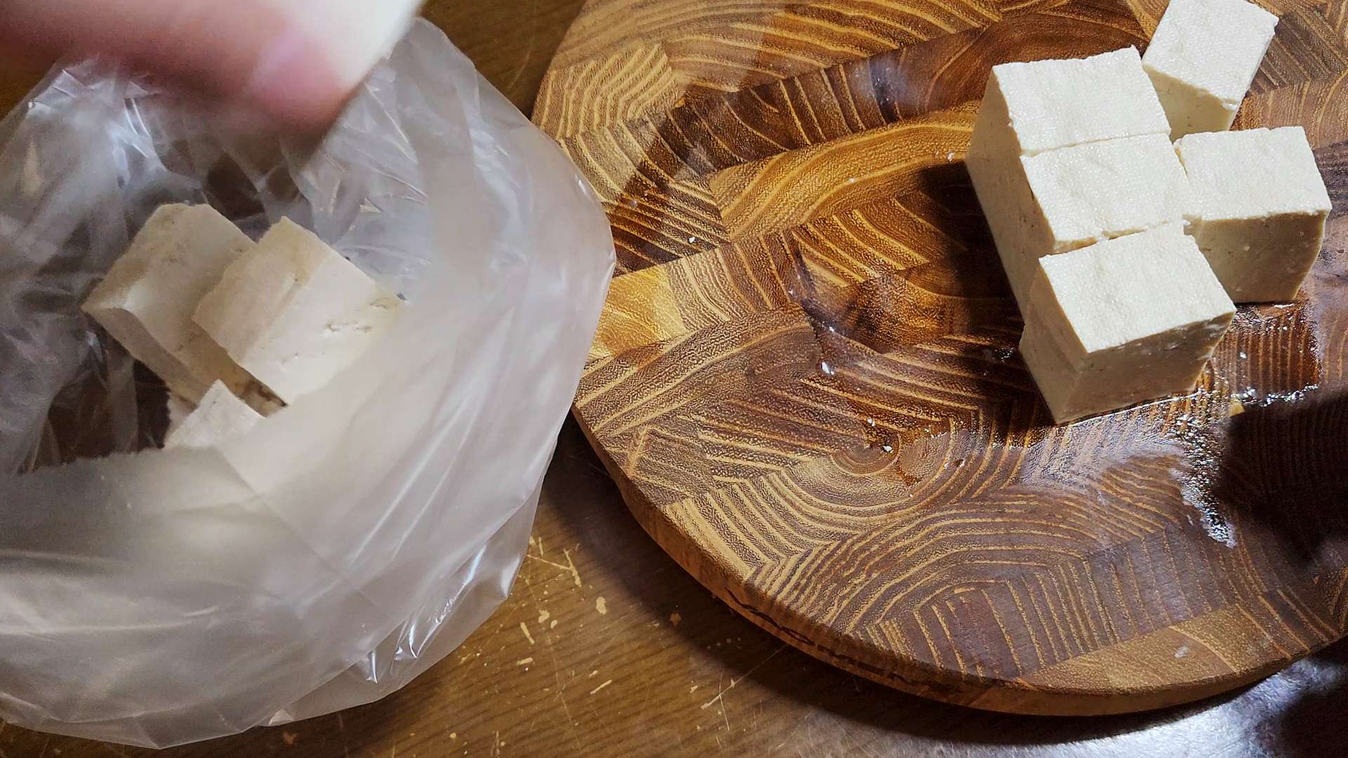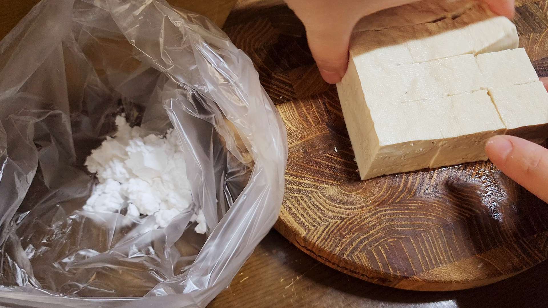 위생백에 전분가루 2T, 두부를 넣고 흔들어 섞어 골고루 묻혀줍니다.
