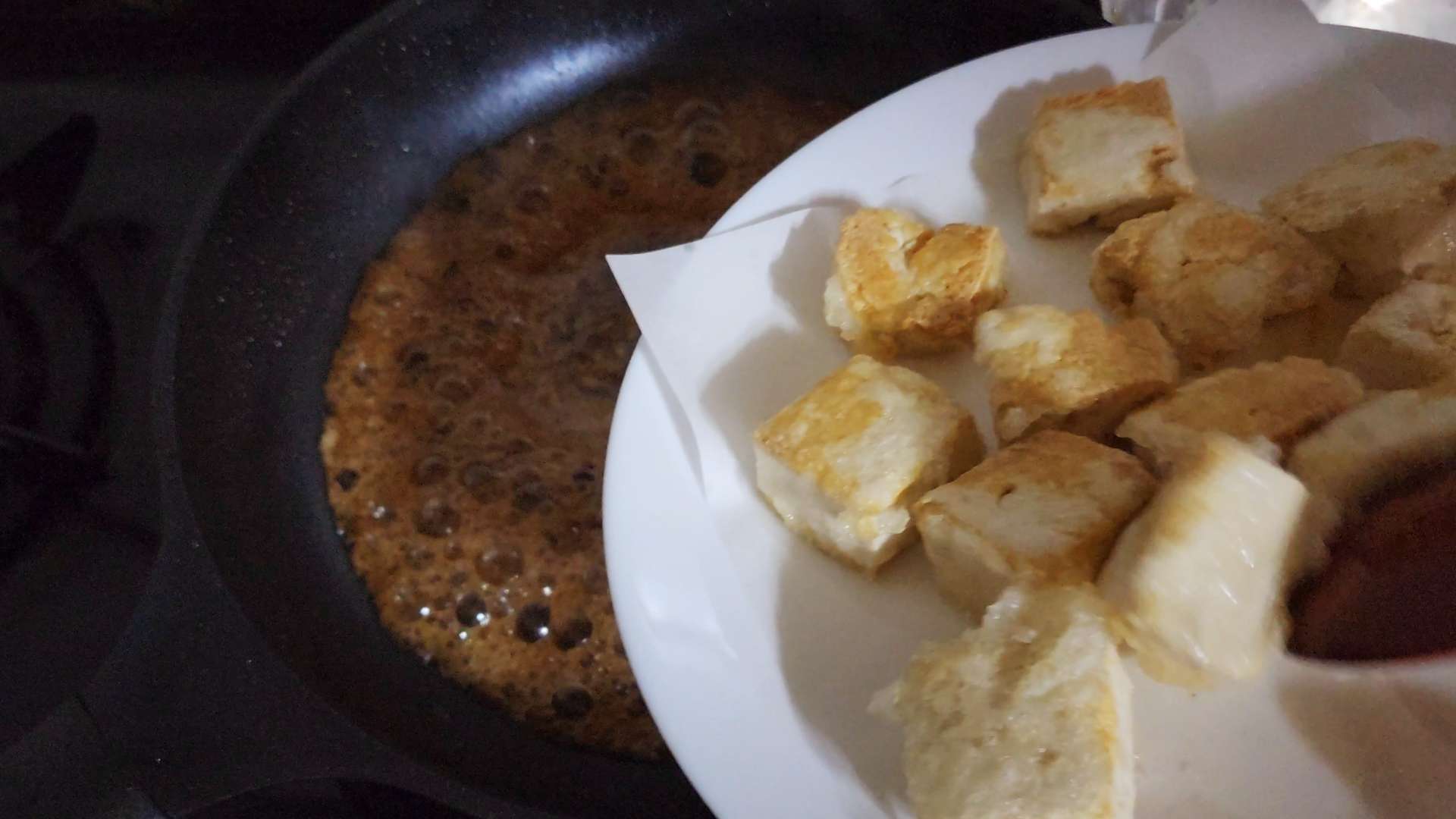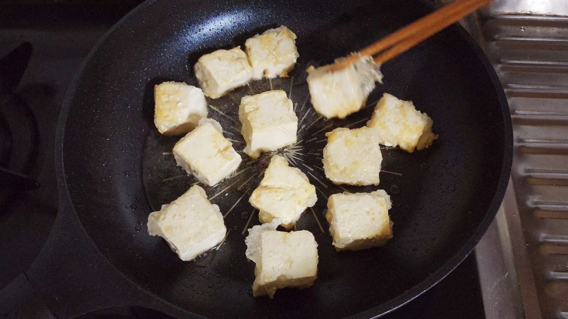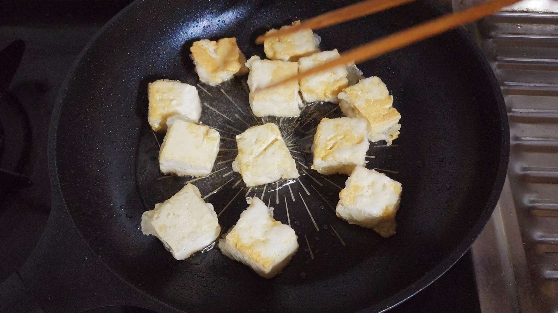 중불로 달군팬에 식용유를 넣고 감자 전분을 묻힌 두부를 넣고 튀기듯이 구워줍니다.