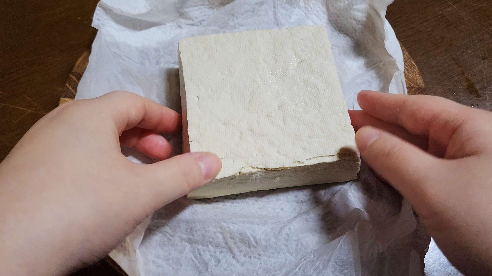 두부 1모는 키친타올로 감싸 수분을 제거해줍니다.