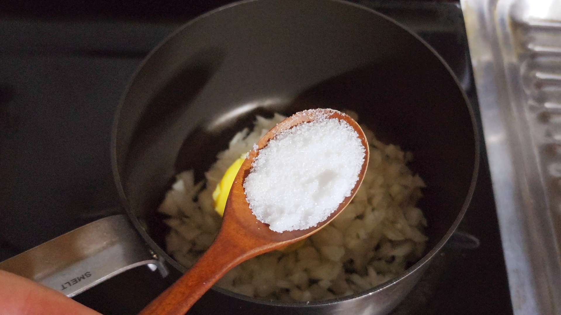 달군 냄비에 양파, 버터 60g, 설탕 1T,