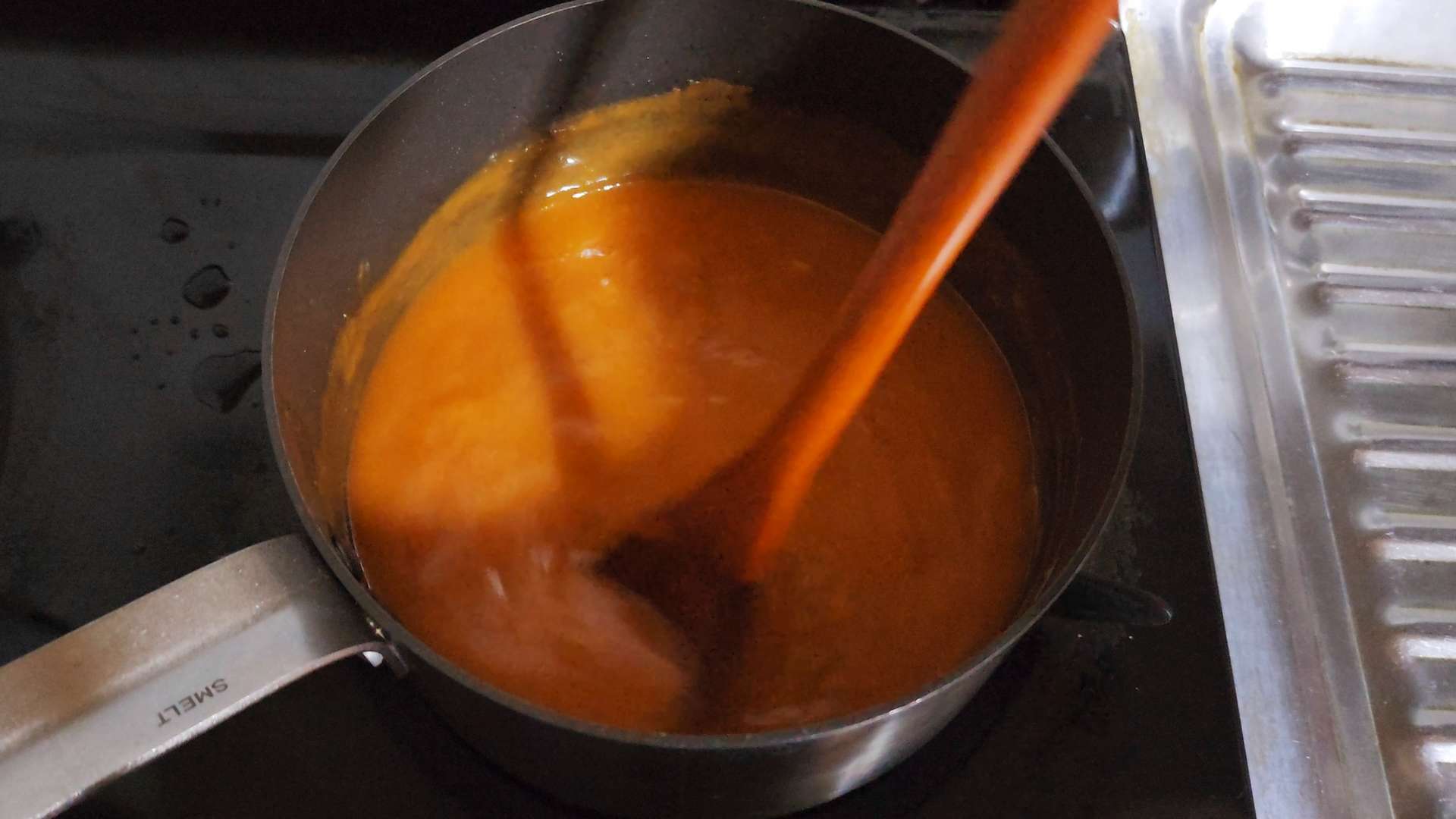 밀가루가 잘 섞이면 불을 끄고 시판 돈가스소스 10T, 케첩 5T를 넣고 섞어줍니다.