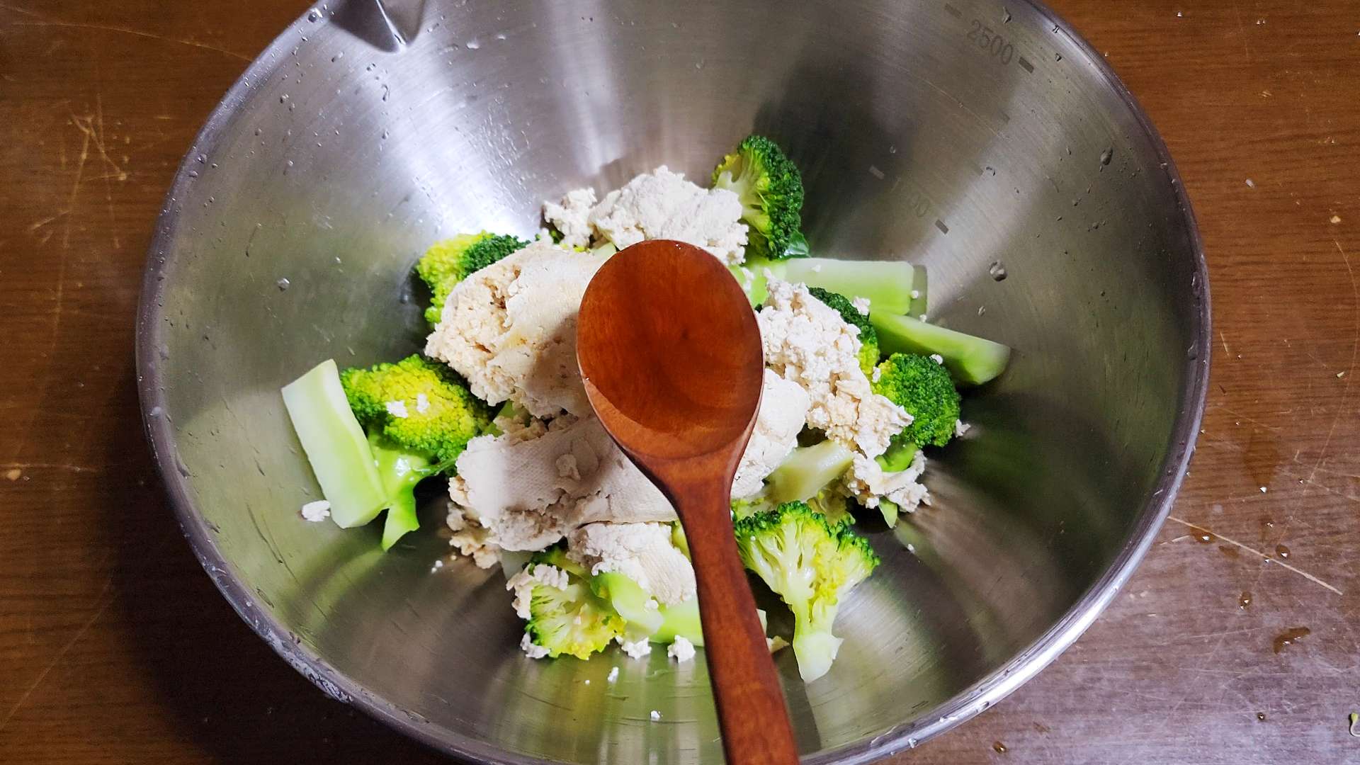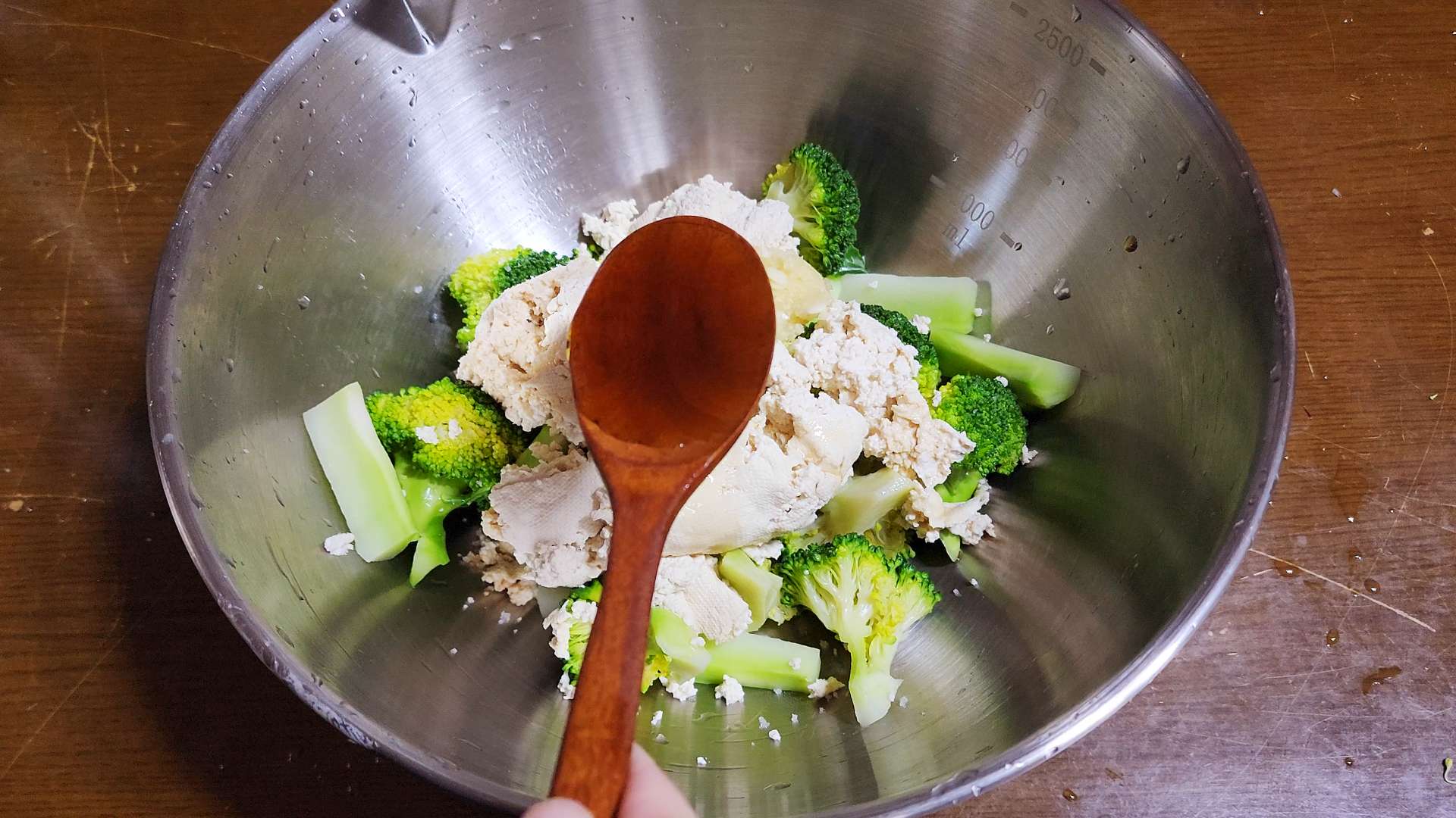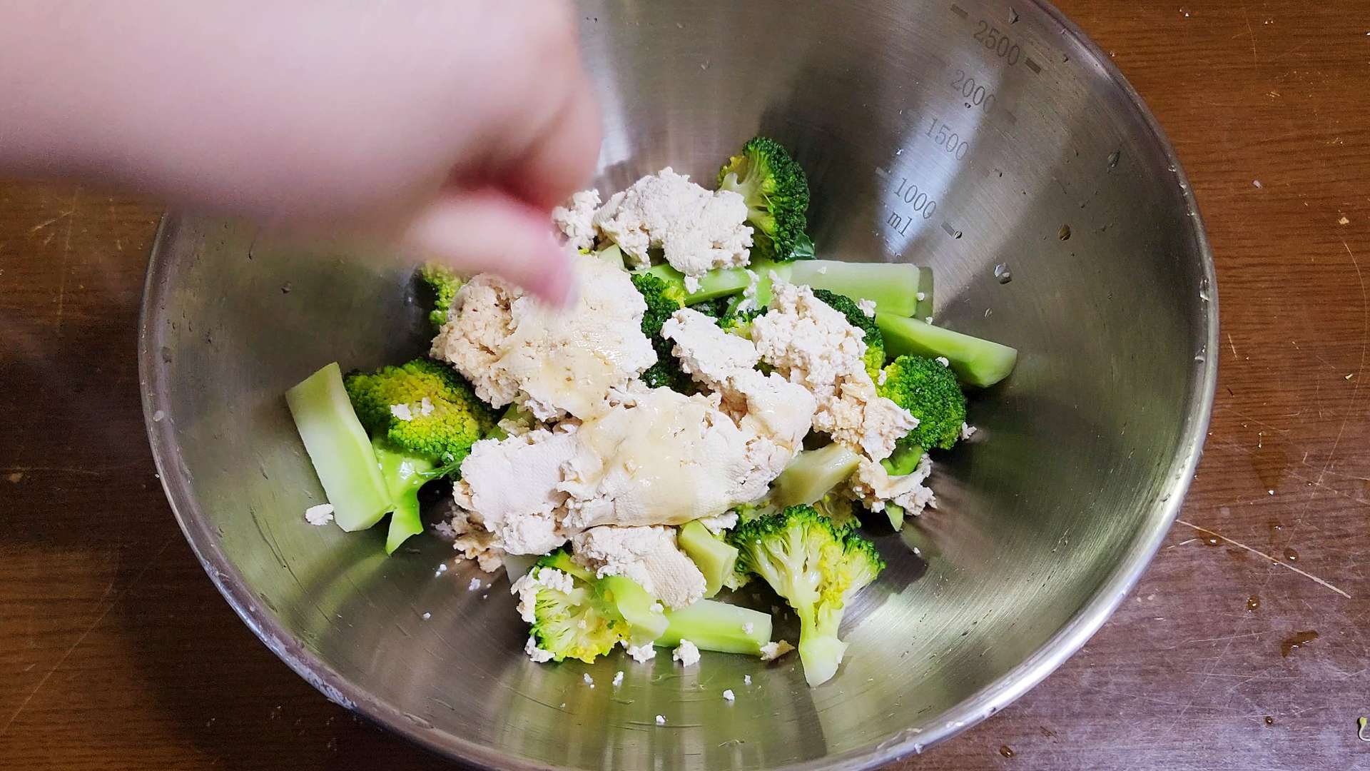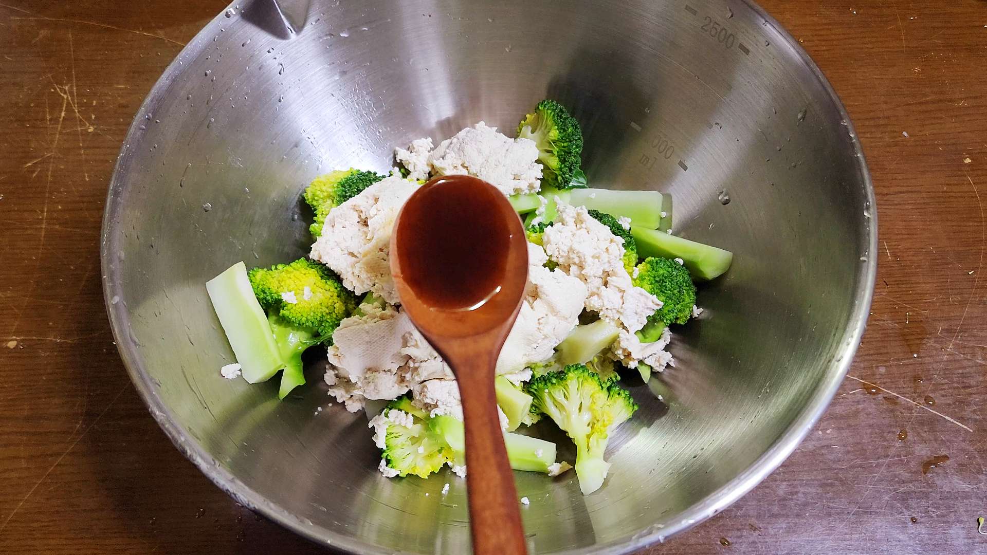 볼에 브로콜리, 두부, 국간장 0.5T, 참치액 0.5T,