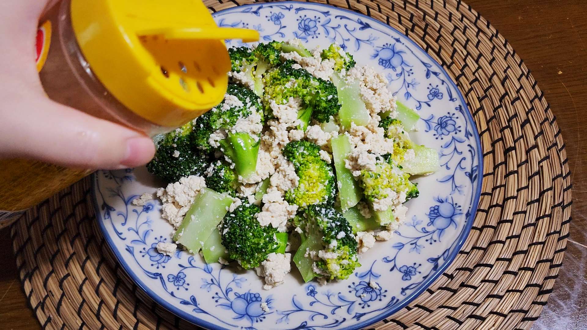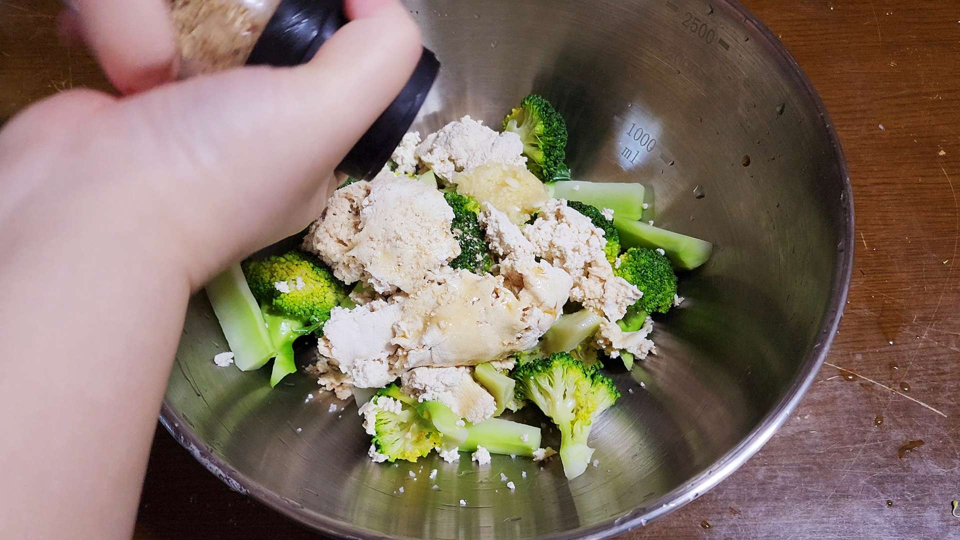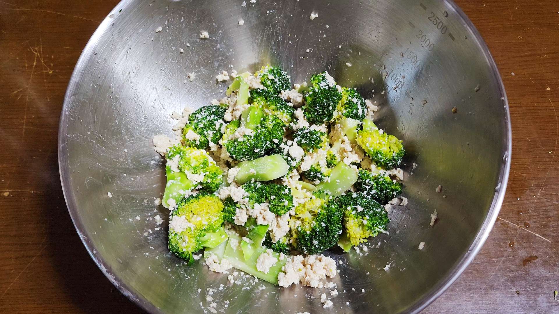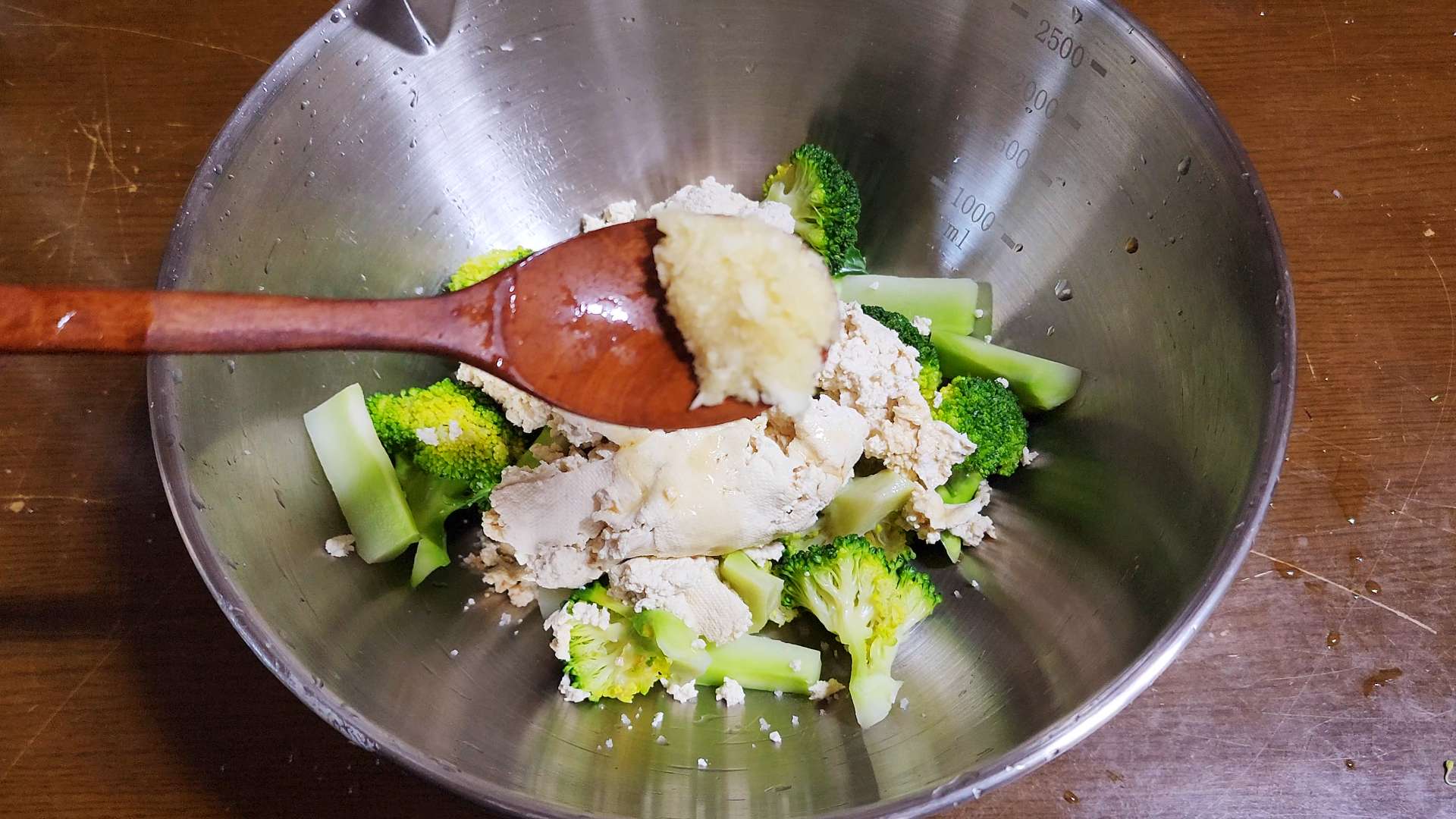 볼에 브로콜리, 두부, 국간장 0.5T, 참치액 0.5T,
