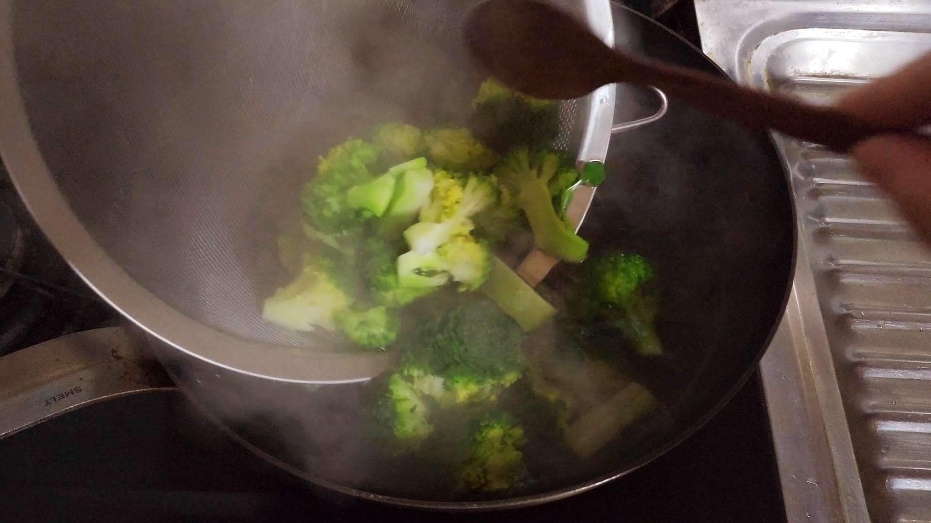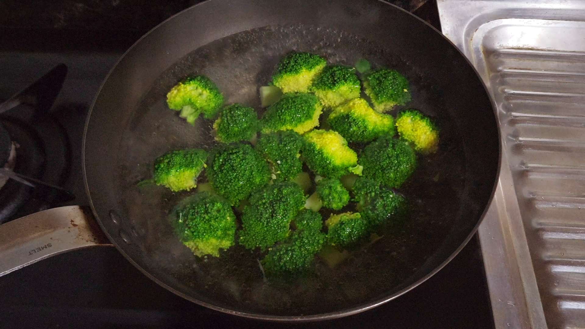 끓는물에 굵은소금 1T, 브로콜리를 넣고 2분 정도 데쳐줍니다. 삶은 브로콜리는 찬물에 헹궈줍니다.