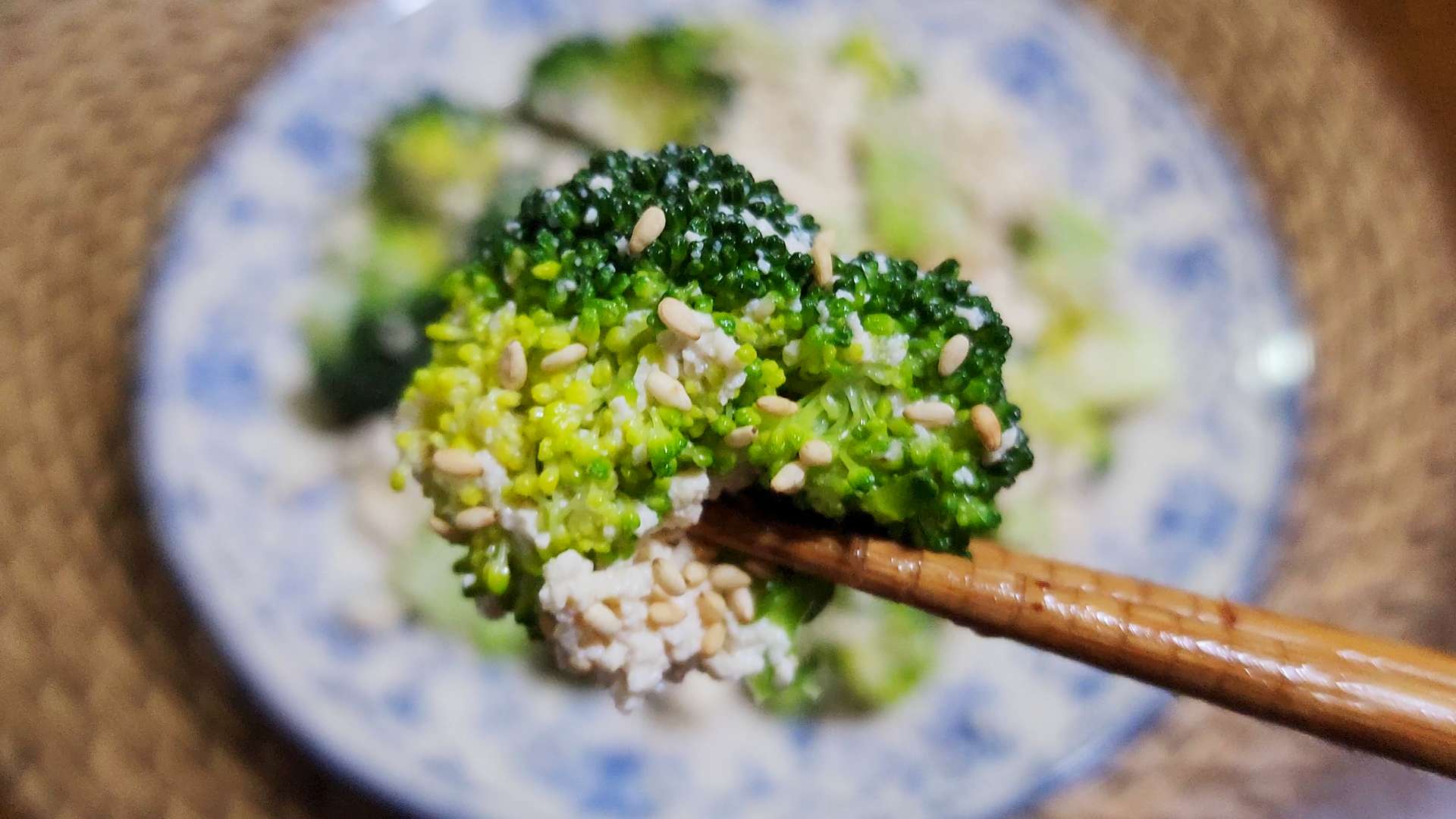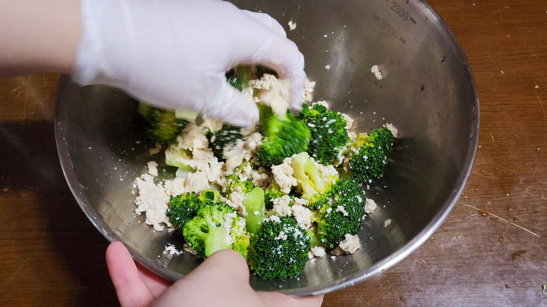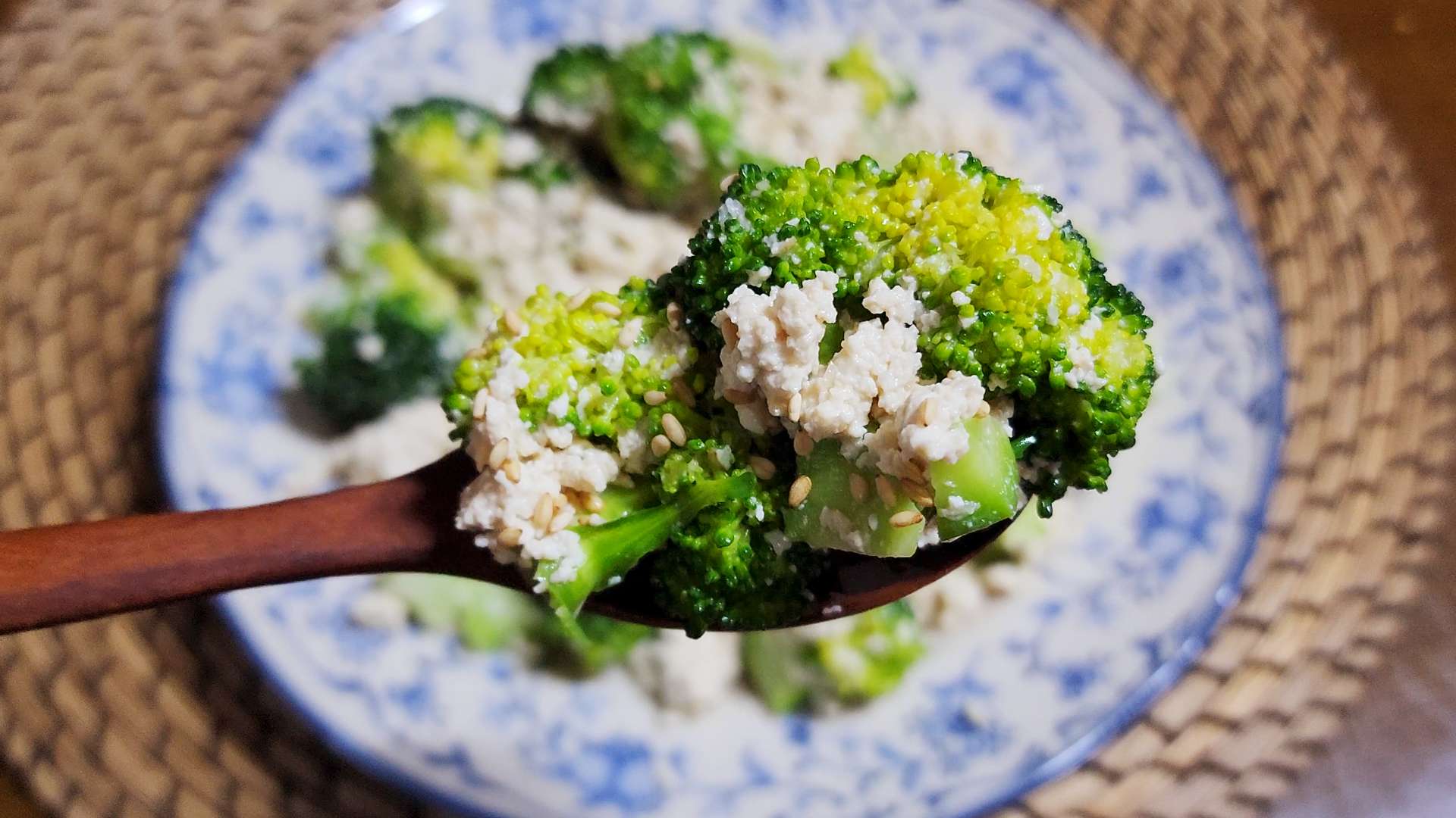 재료: 브로콜리 1송이, 식초 1T, 굵은소금 1T, 두부 1/2모, 국간장 0.5T, 참치액 0.5T, 소금 한꼬집, 다진마늘 0.5T, 참기름 1T, 통깨