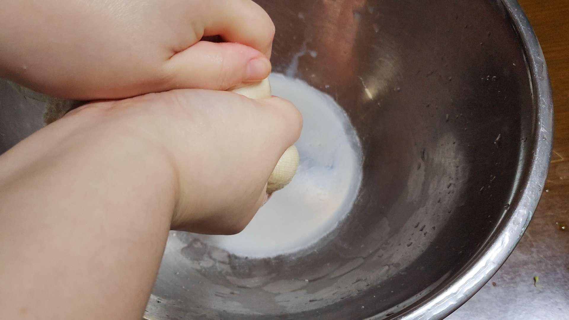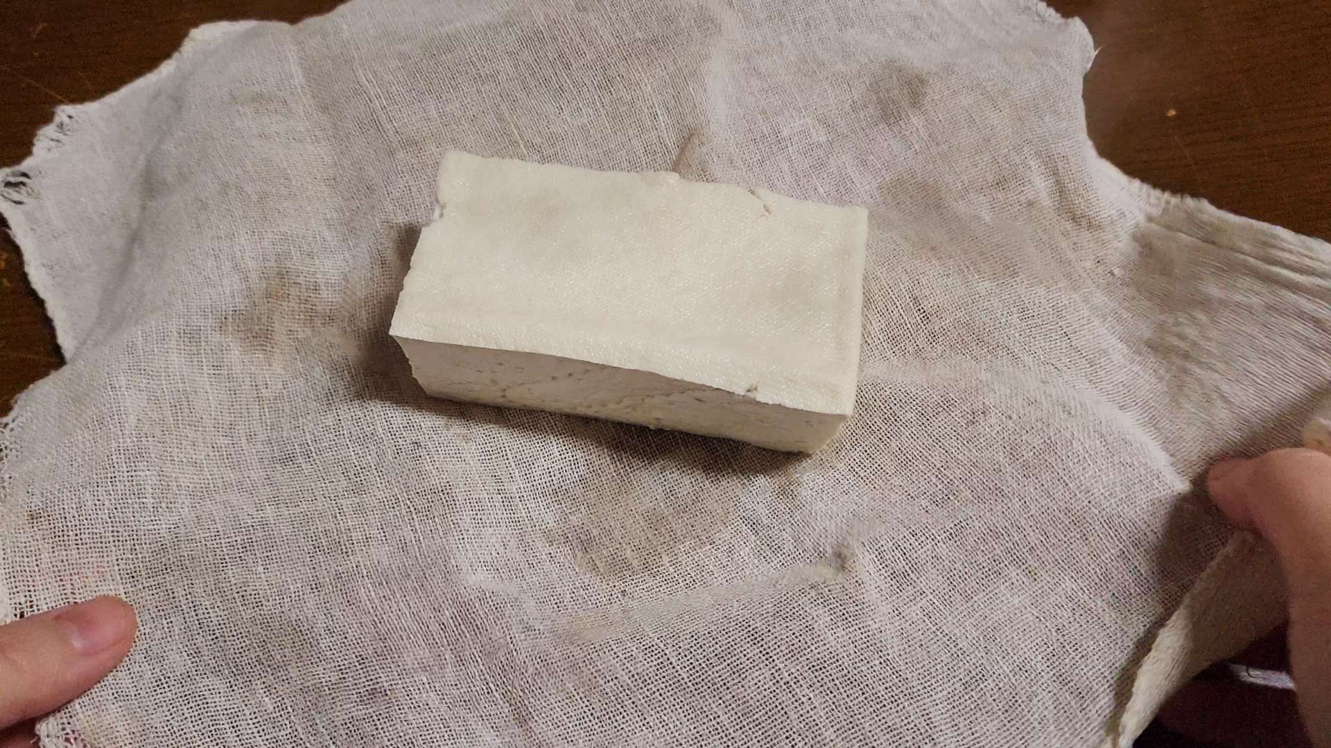 데친 두부는 한김 식히고 면포에 넣고 물기를 짜줍니다.