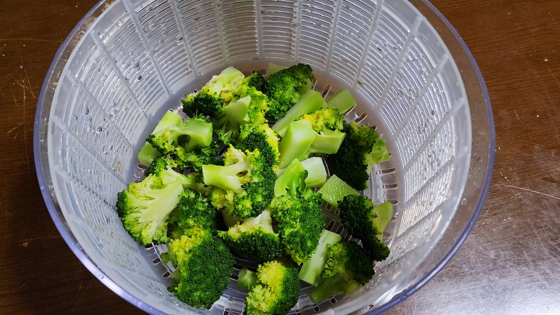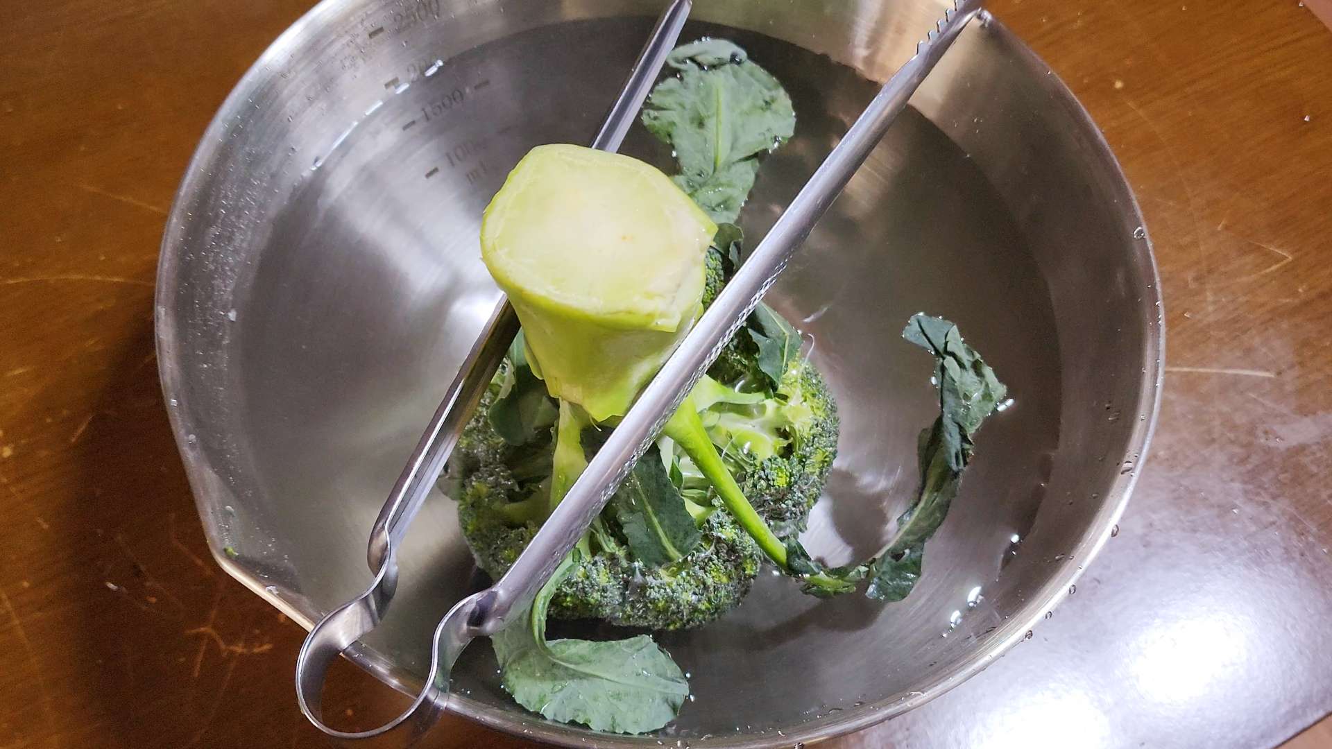 볼에 물을 넉넉히 붓고 식초 1T, 브로콜리 1송이 봉오리를 물에 넣고 10분 정도 담가줍니다.