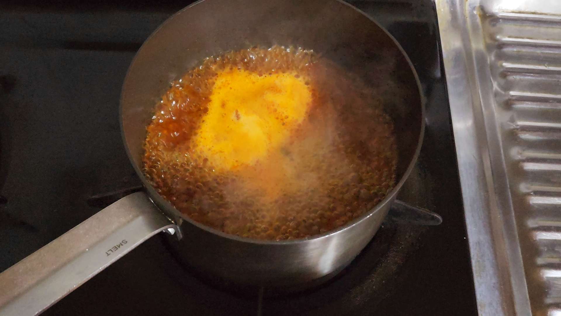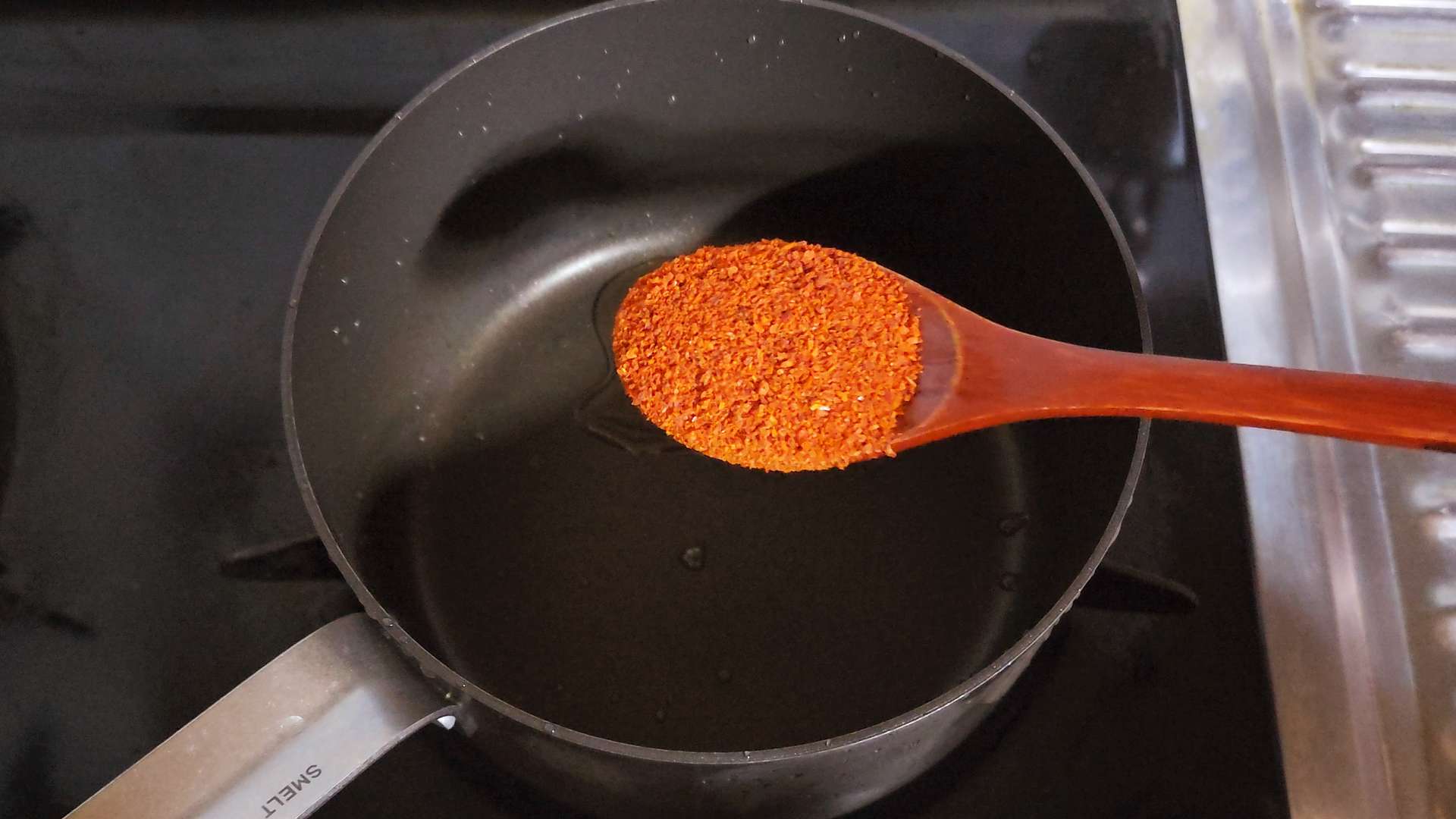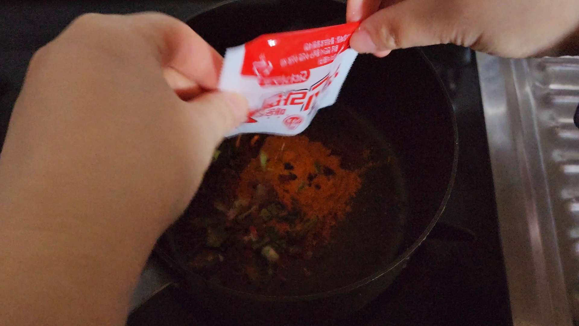 중불로 달군팬에 식용유 2T, 고춧가루 1T, 분말 스프, 건더기 스프를 넣고 약불에서 볶아줍니다.