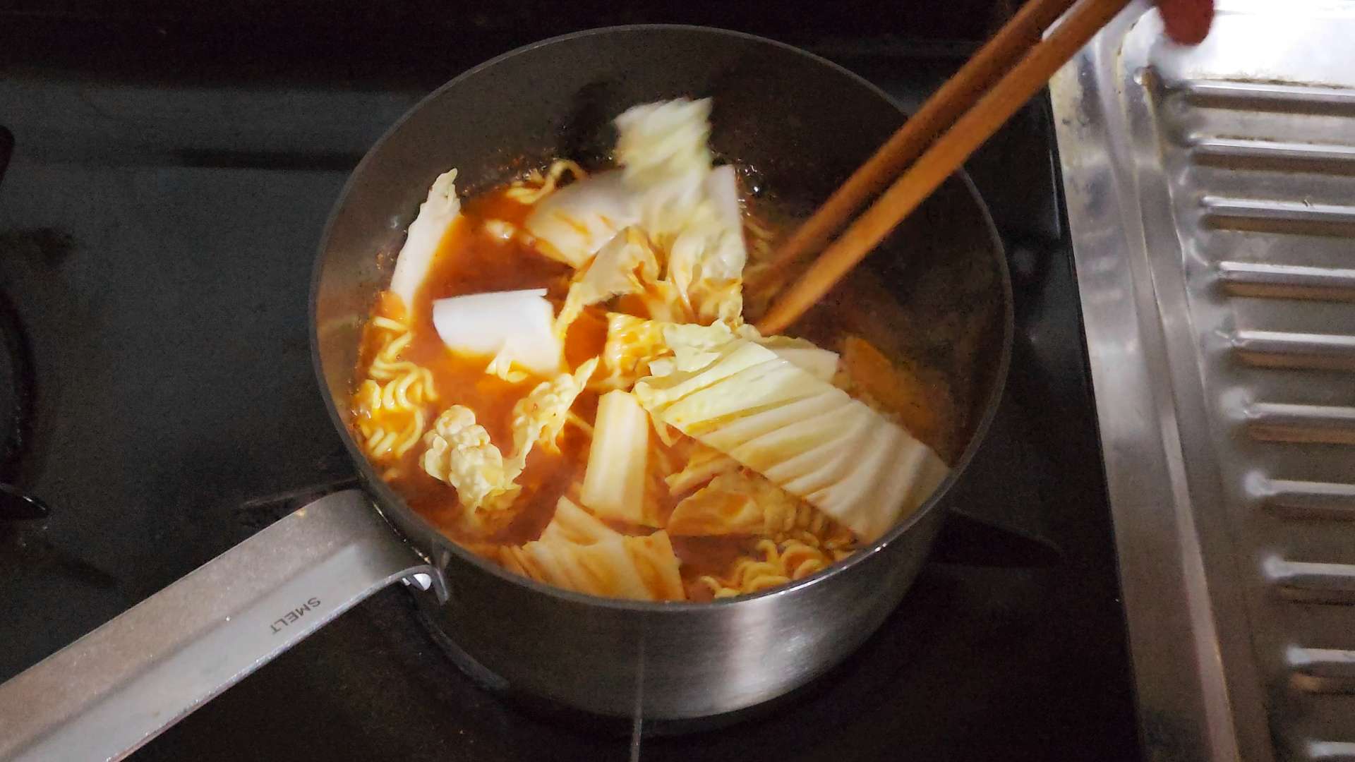 물이 끓어오르면 면과 배추를 넣고 4분 정도 끓여줍니다.