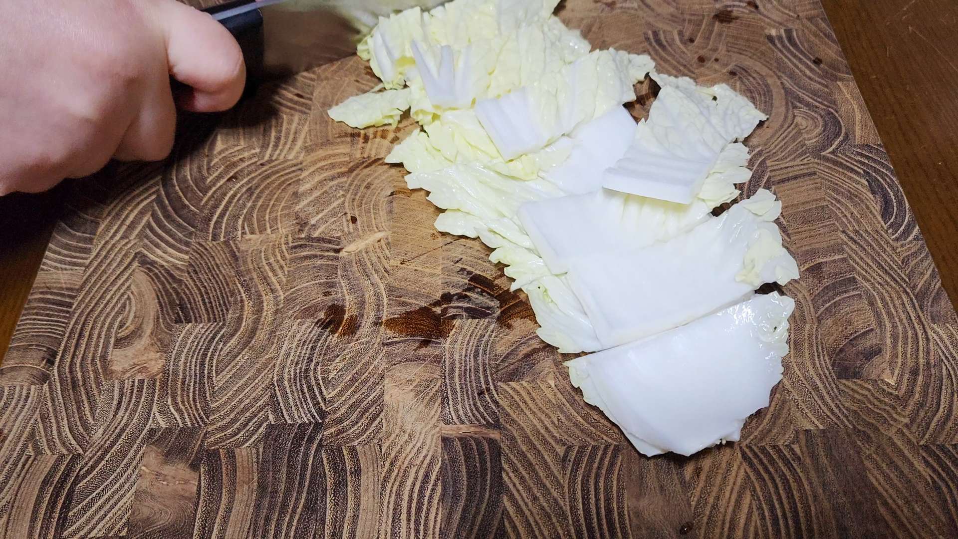 배추잎은 반으로 잘라 먹기 좋은 크기로 잘라줍니다.