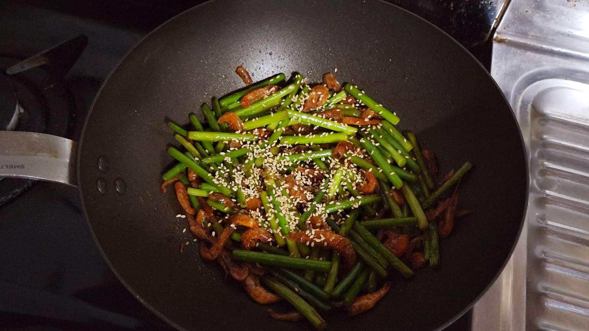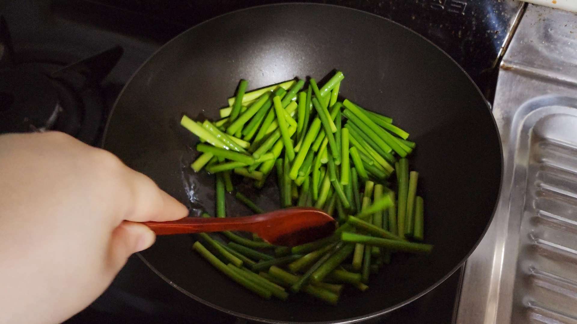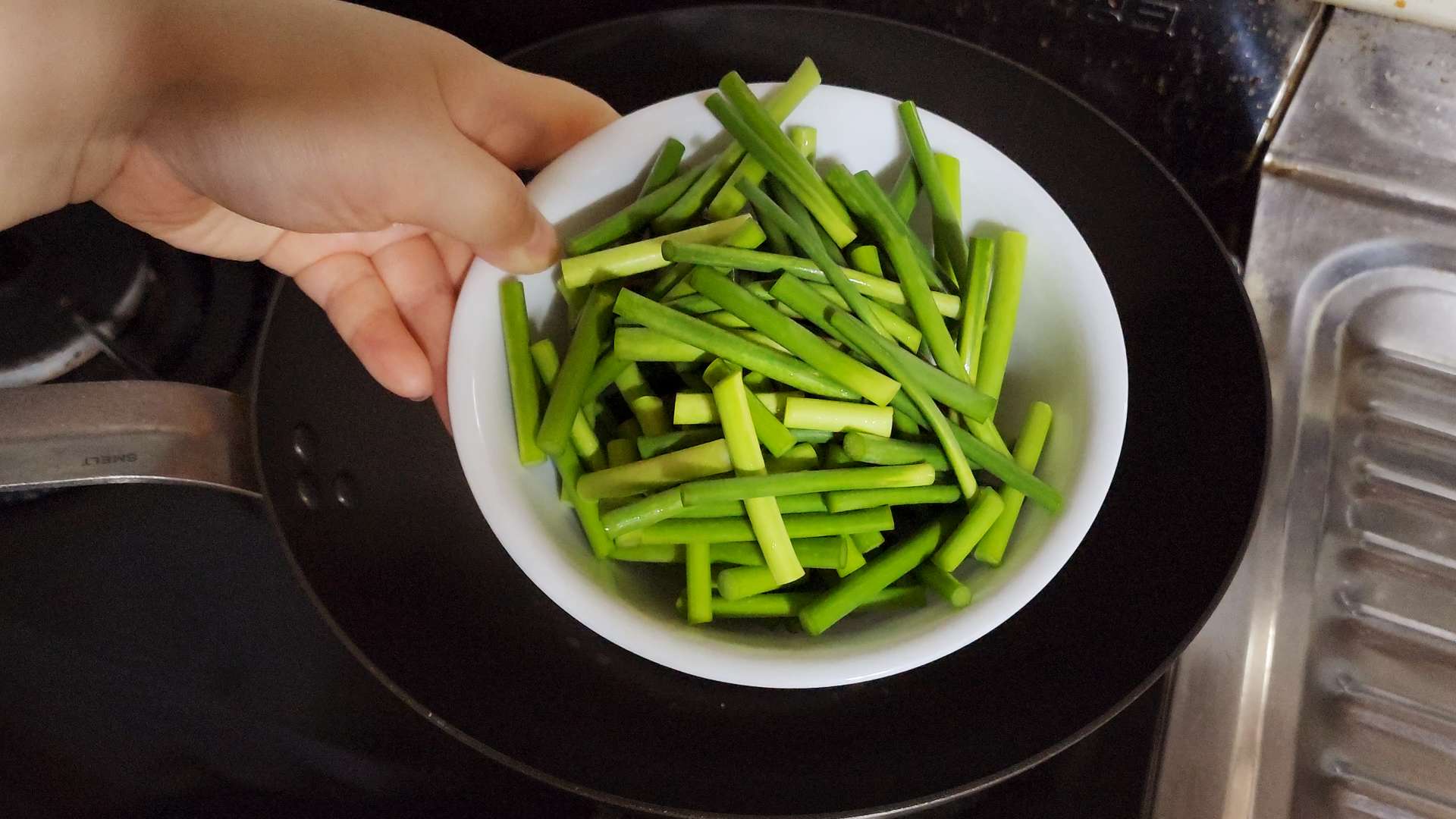 달군 팬에 식용유를 넣은 후 마늘쫑을 볶아줍니다.