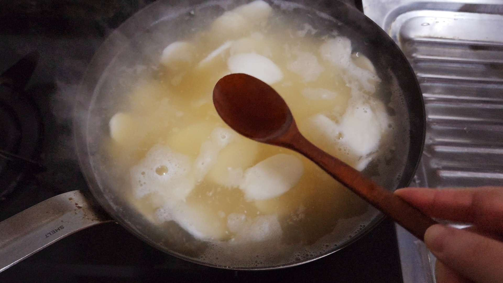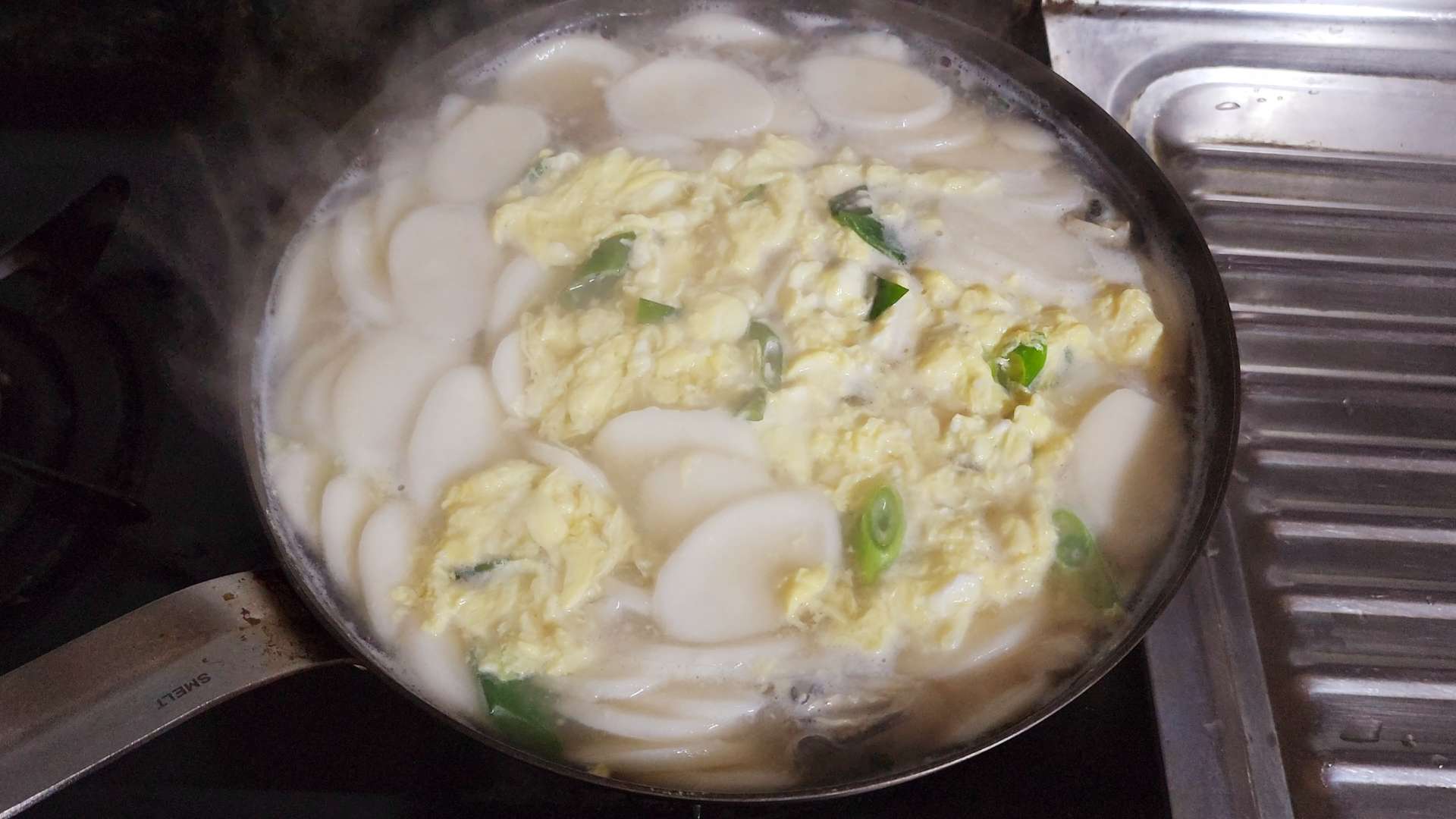 재료: 물 1L, 떡국떡 500g, 멸치다시마팩 1개, 달걀 2개, 대파 1/2대, 다진마늘 1T, 국간장 1T, 참치액 1T,