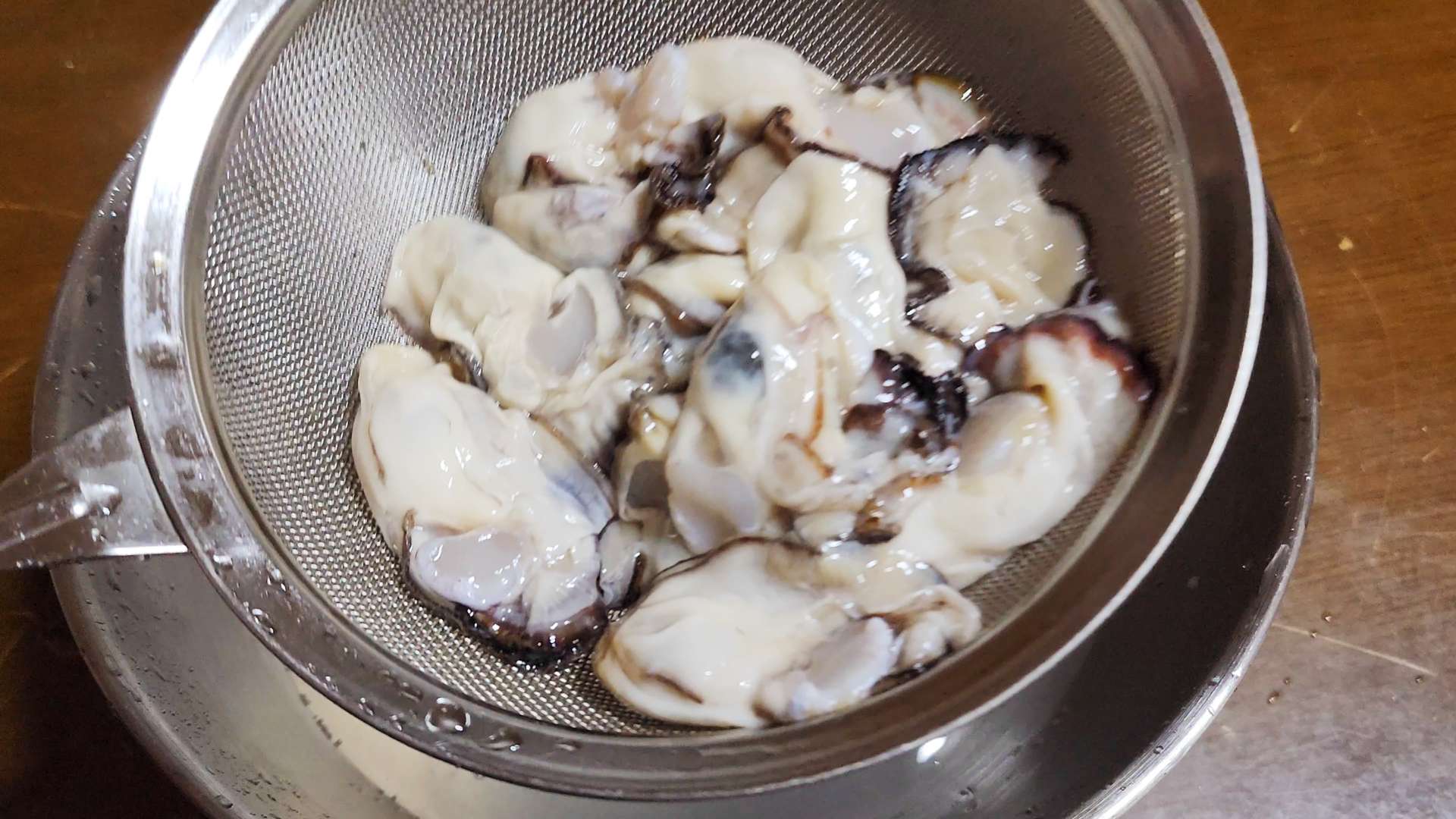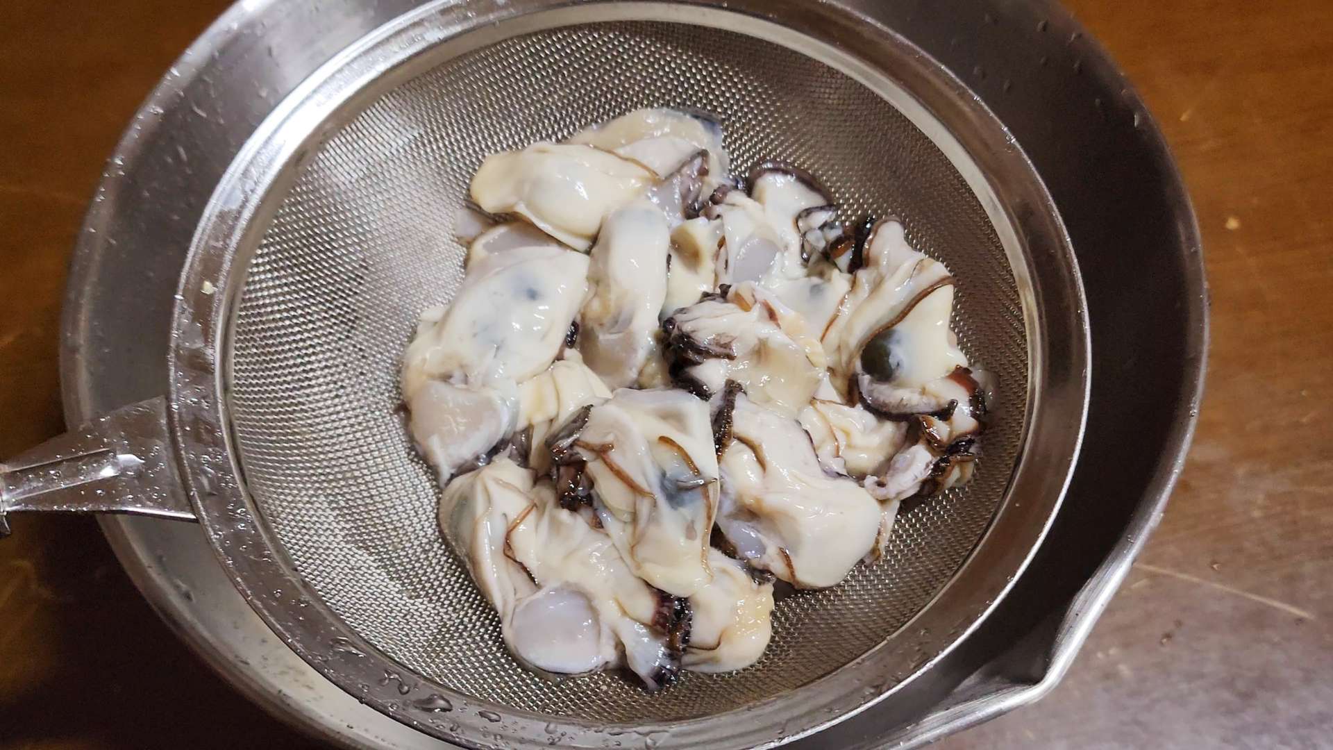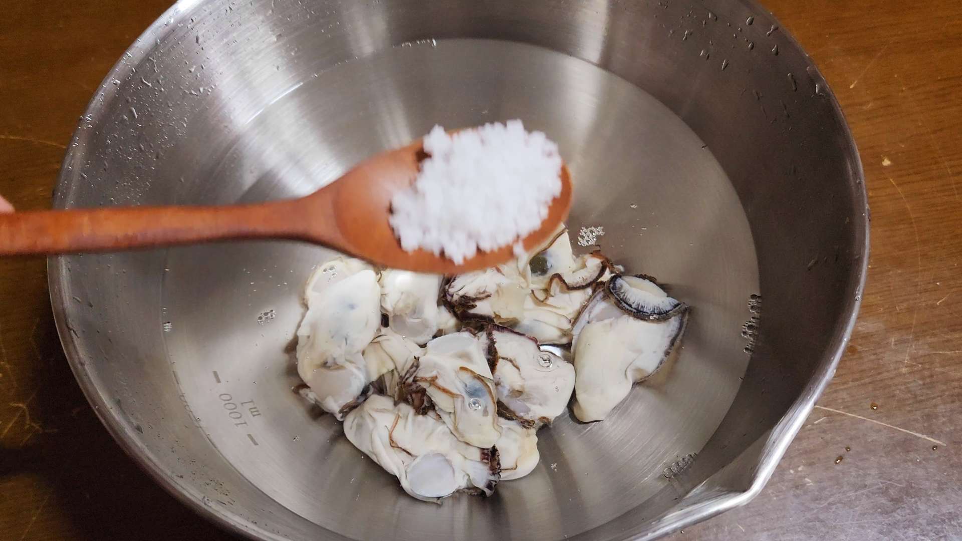 굴 150g, 굵은소금 1T 넣고 살살 흔들어 씻고 체에 밭쳐 물기를 제거해줍니다.