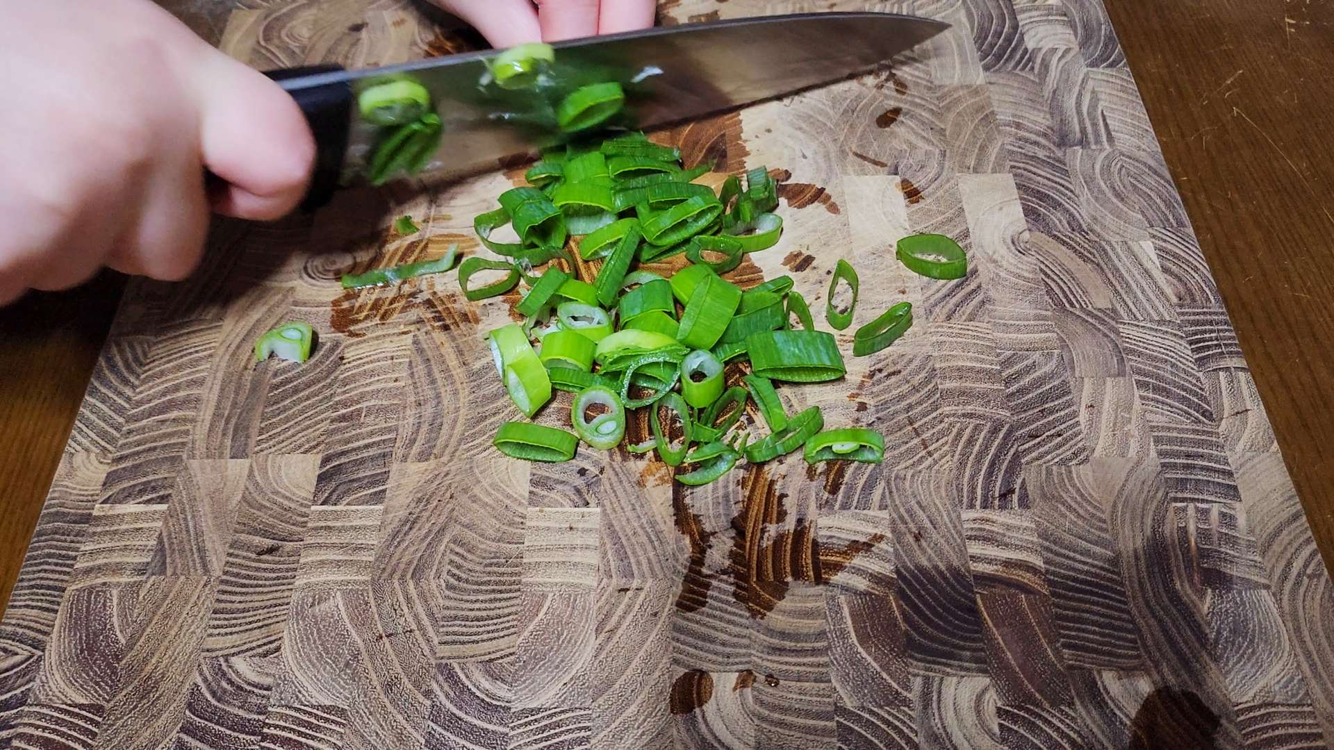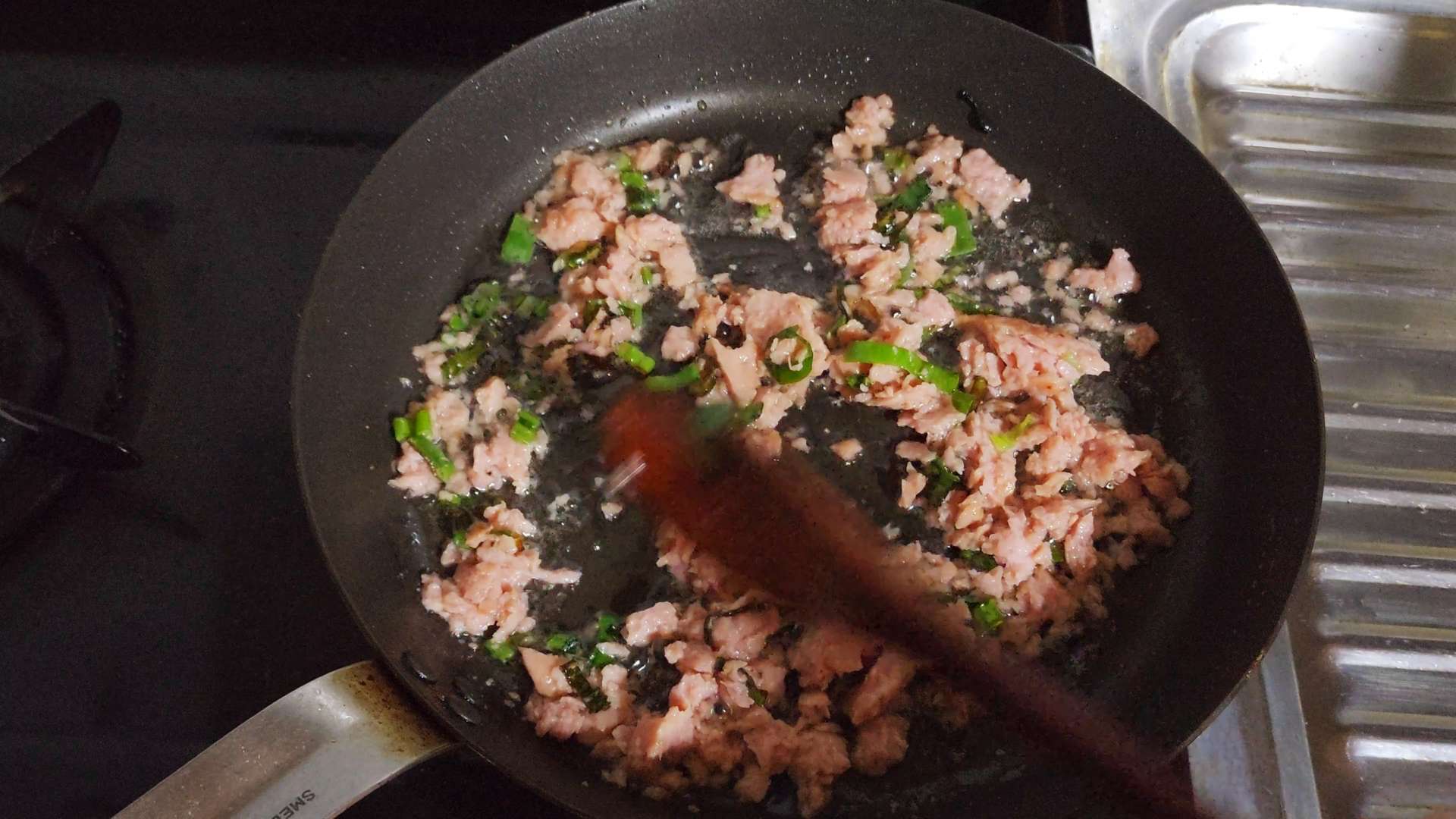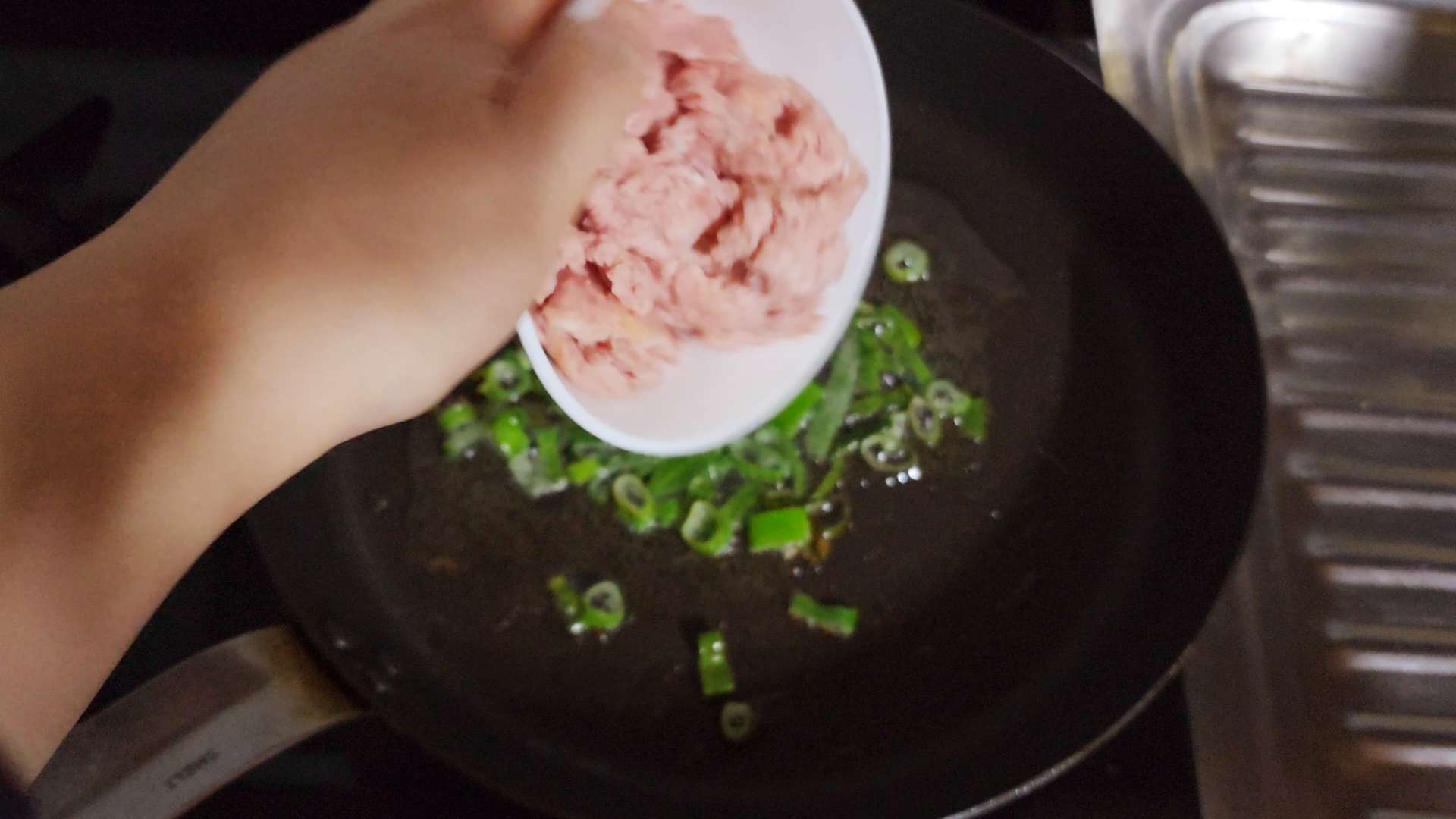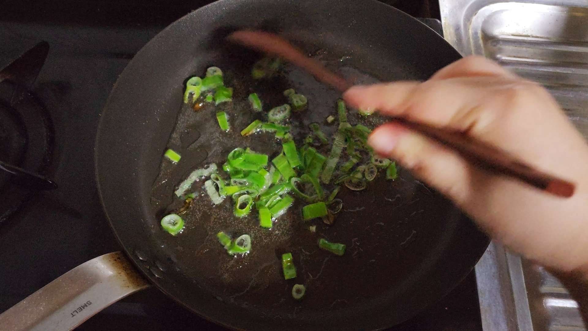 강불로 달군팬에 식용유, 대파를 넣고 노릇해질때까지