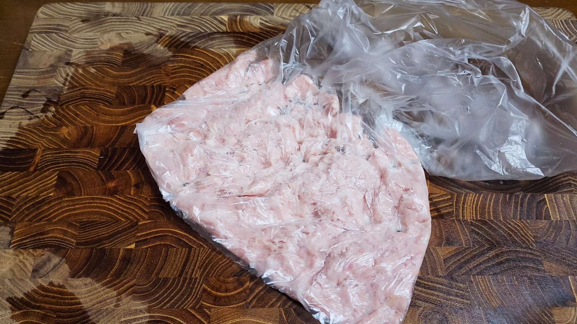 스팸은 위생백에 넣고 눌러 으깨줍니다.