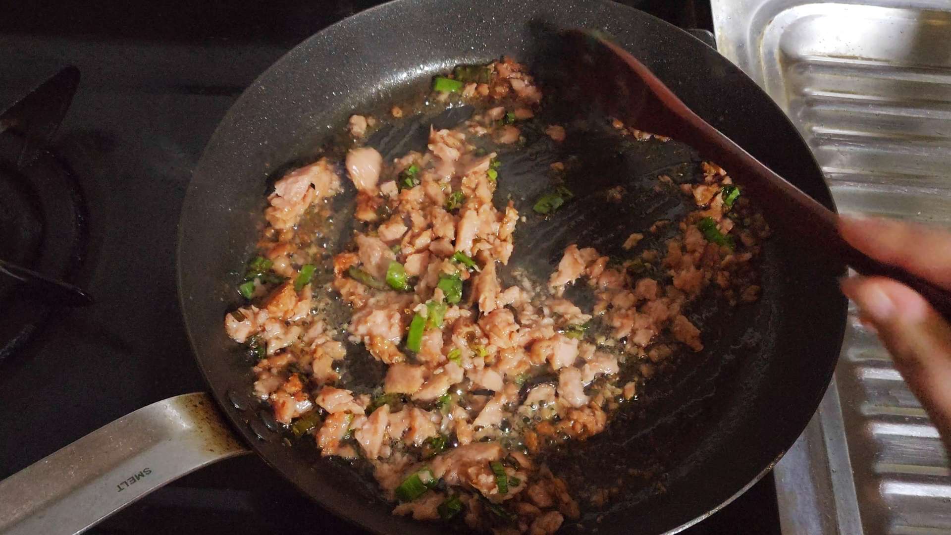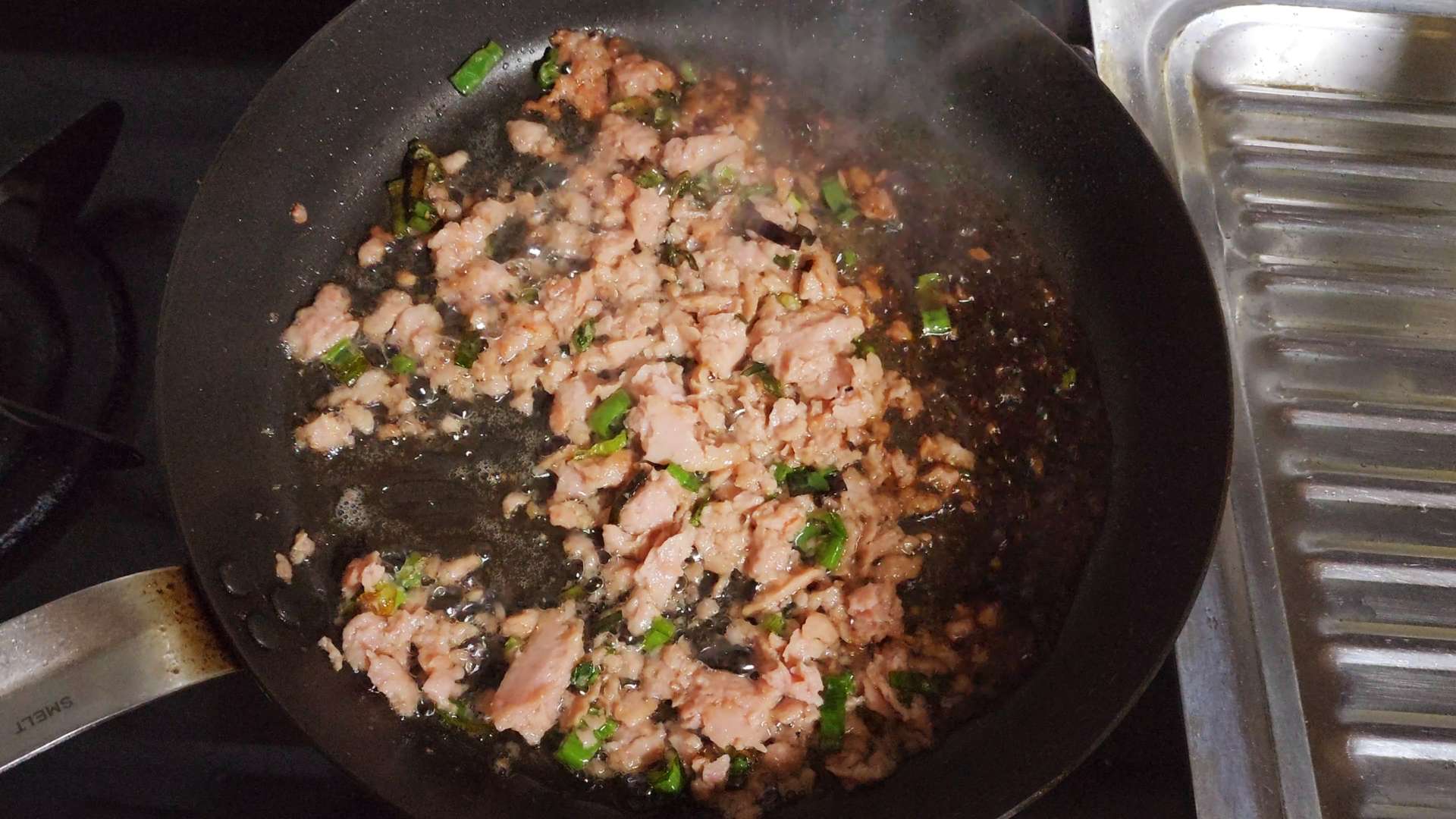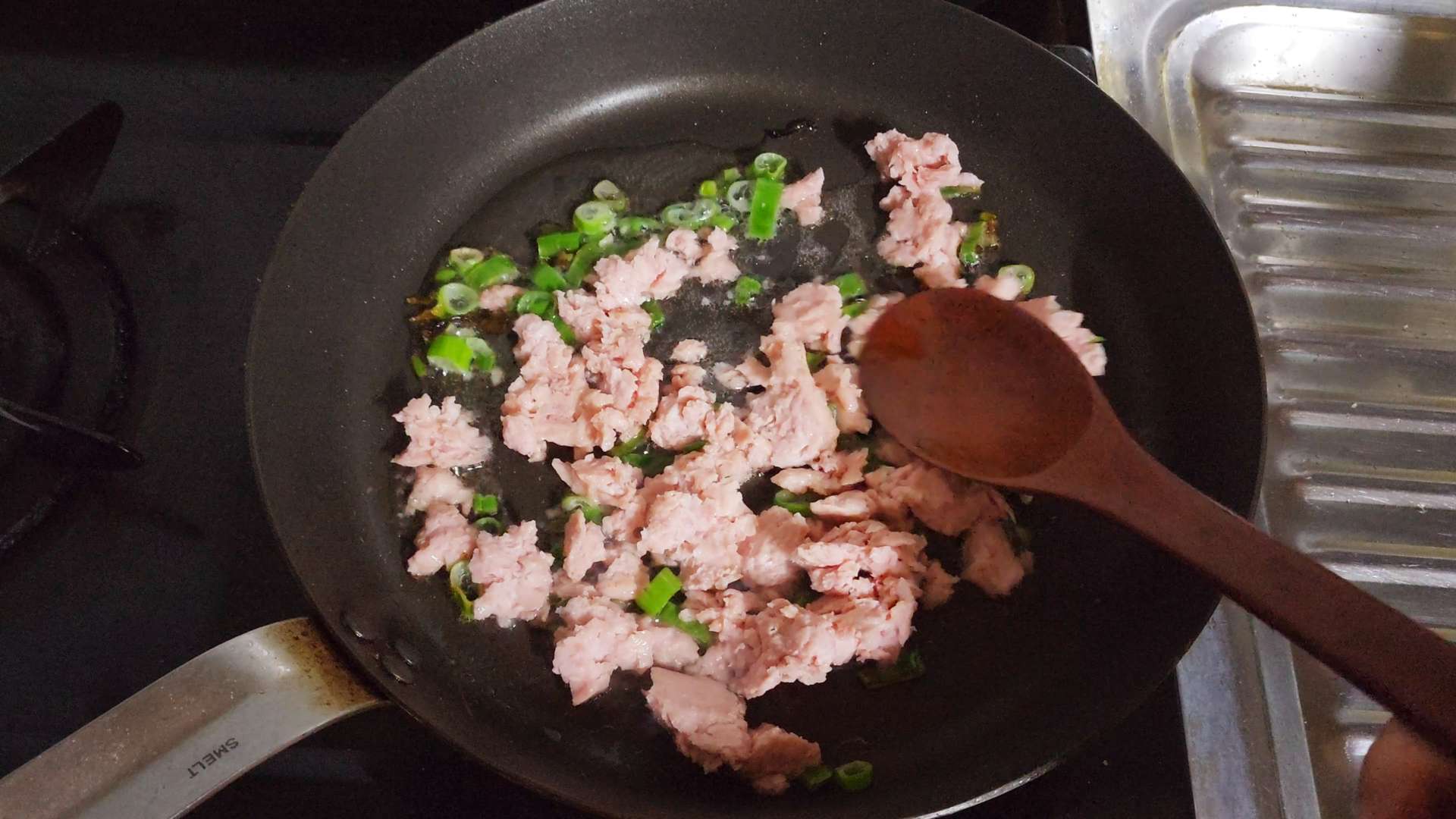 재료: 햇반 210g 2개, 대파 1/2대, 스팸 120g, 달걀 1개, 잘게 자른 김치 180g, 식용유, 진간장 2T, 고춧가루 1T, 설탕 1T, 굴소스 1T, 참기름 1T, 통깨