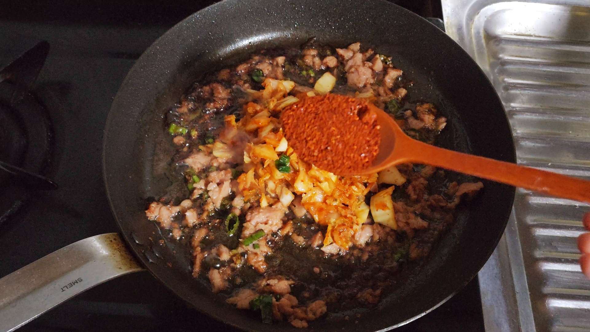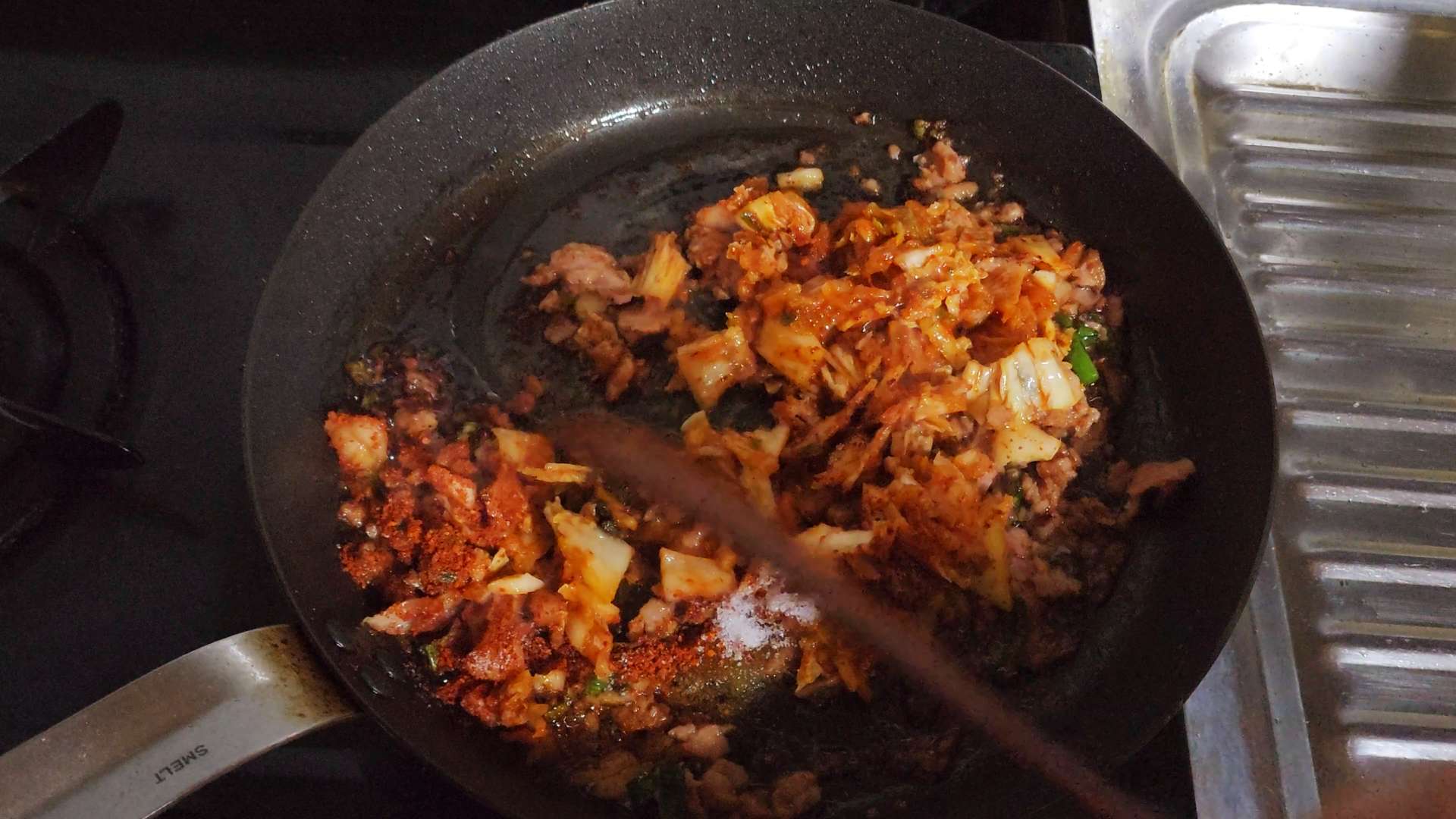 김치, 고춧가루 1T, 설탕 1T를 넣고 중불에서 볶아줍니다.