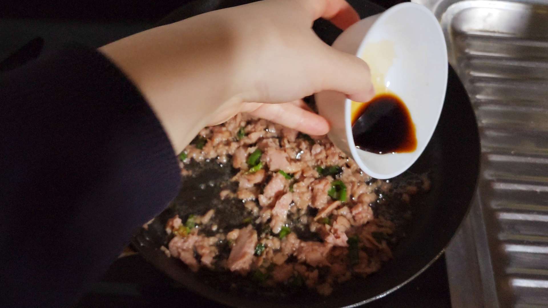 팬 한쪽에 진간장 2T 넣고 바글바글 끓으면 재료를 섞어줍니다.