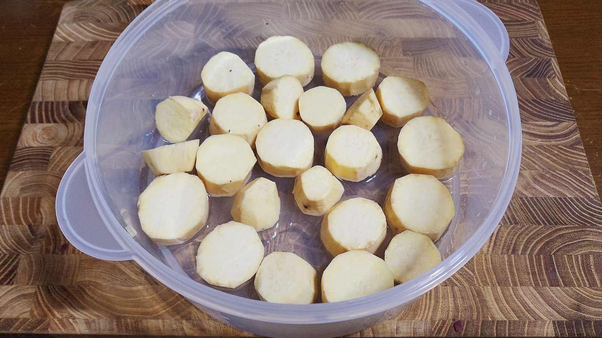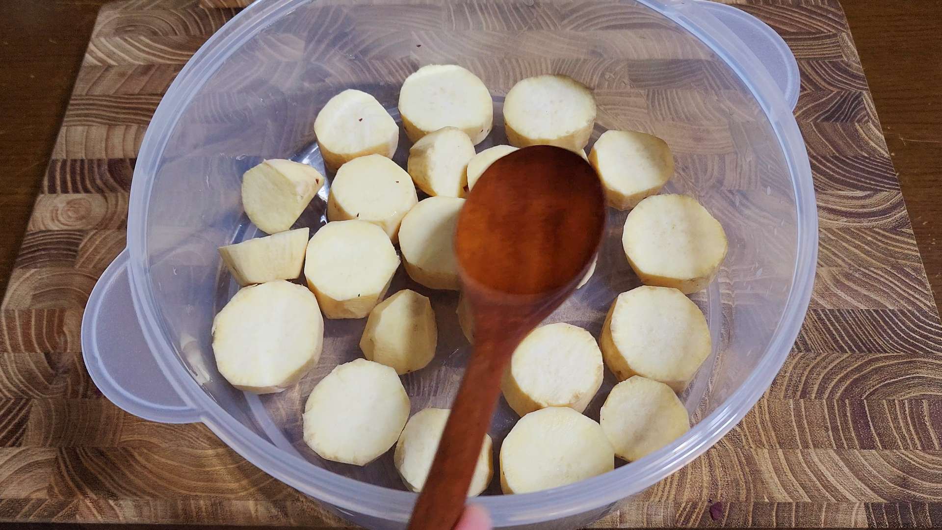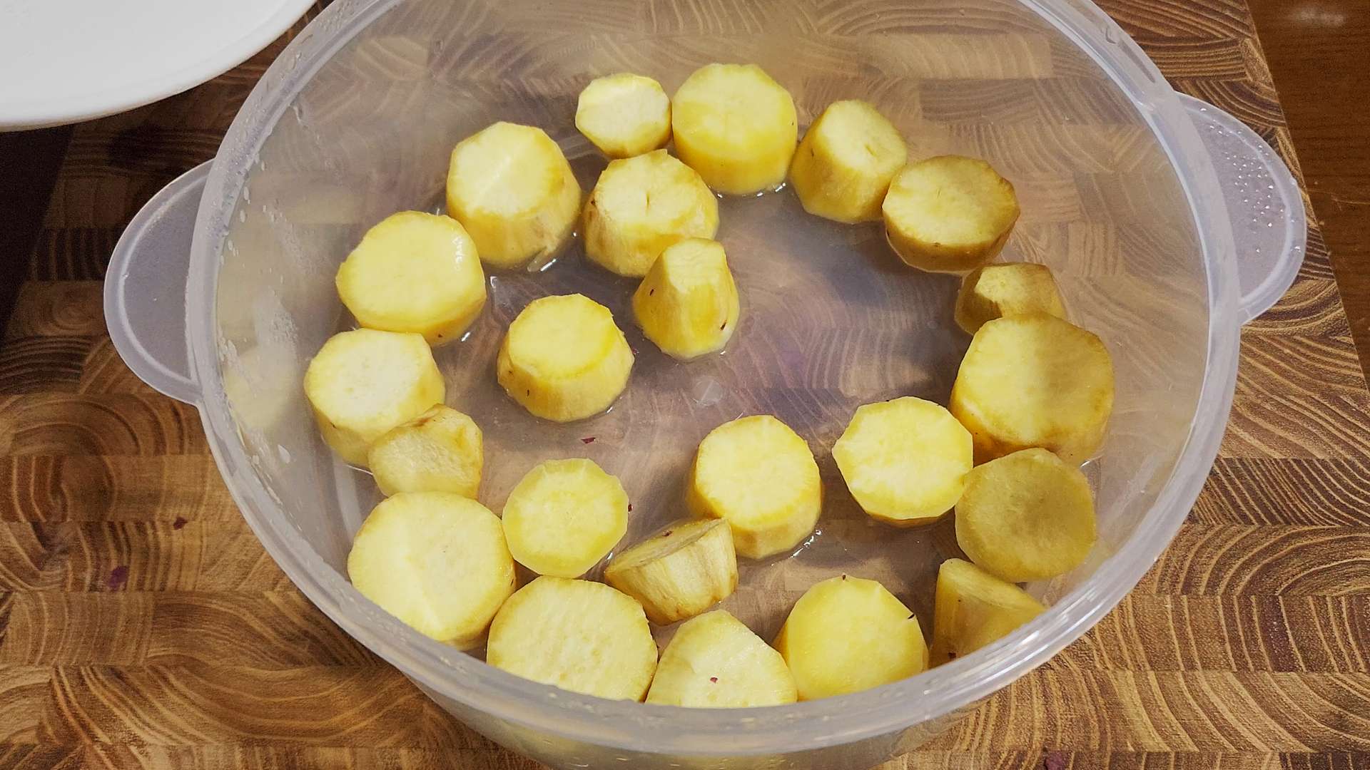 내열 용기에 고구마, 물 1T를 넣고 랩을 덮어 전자레인지에 5분 돌려줍니다.