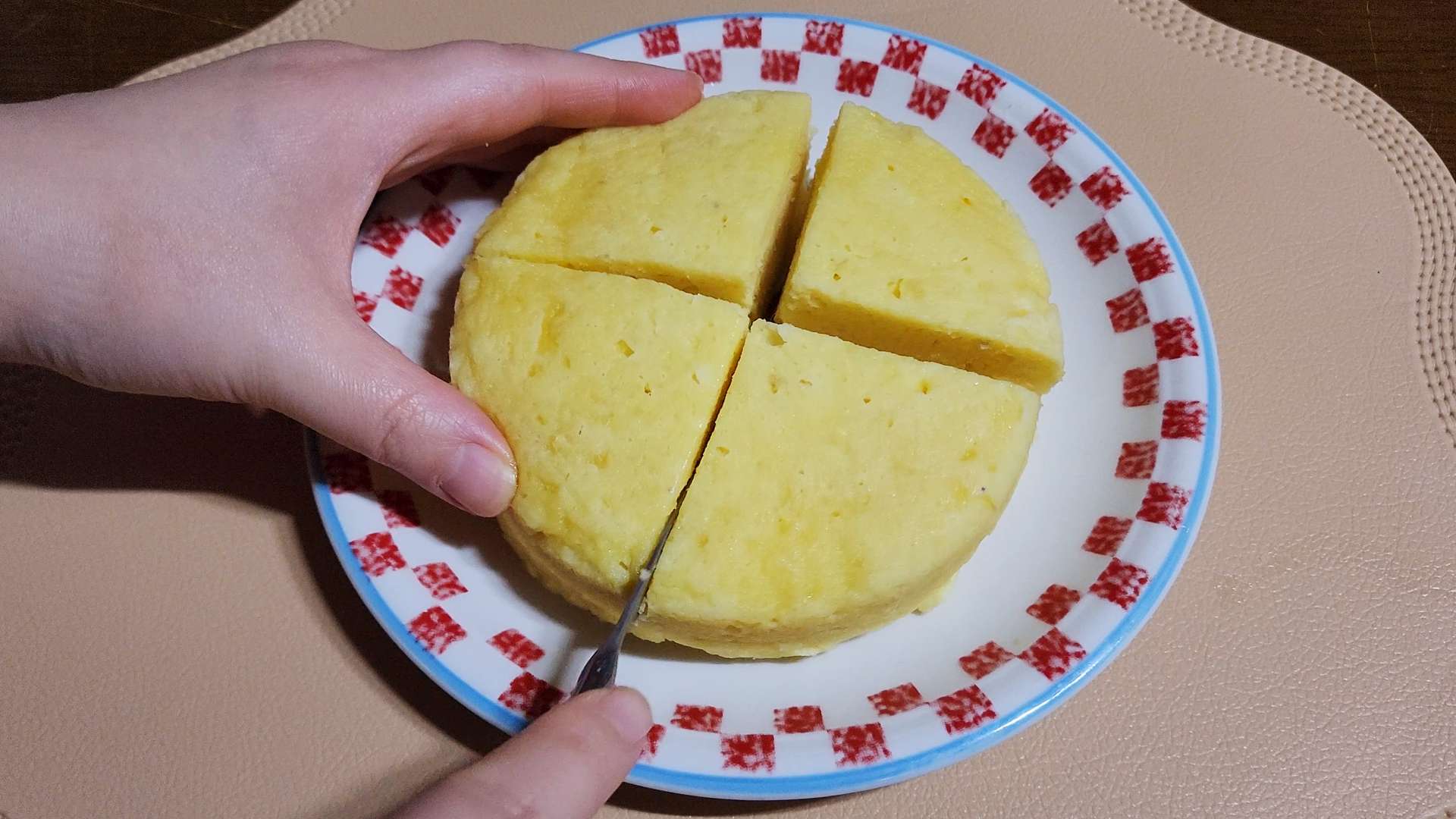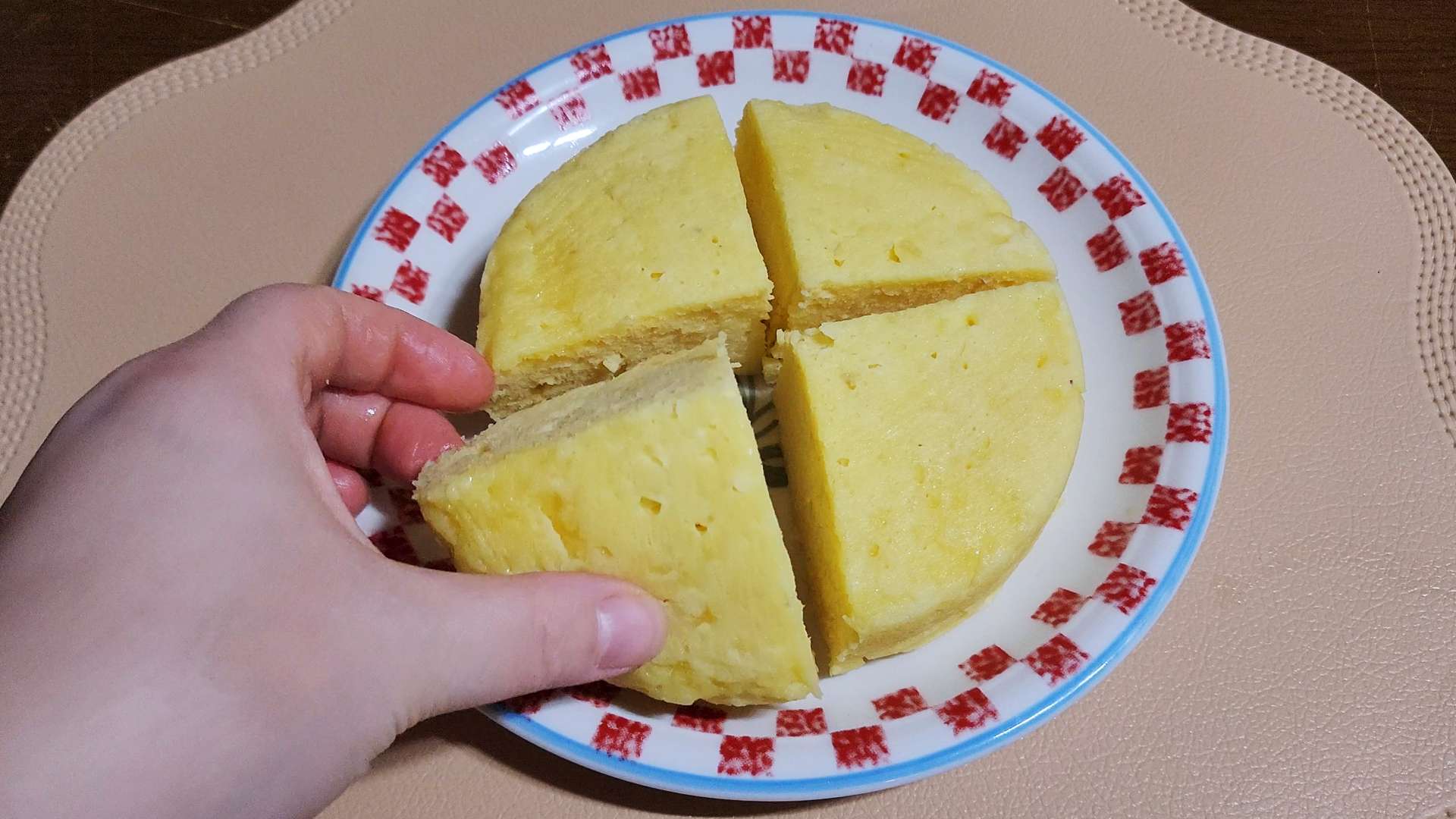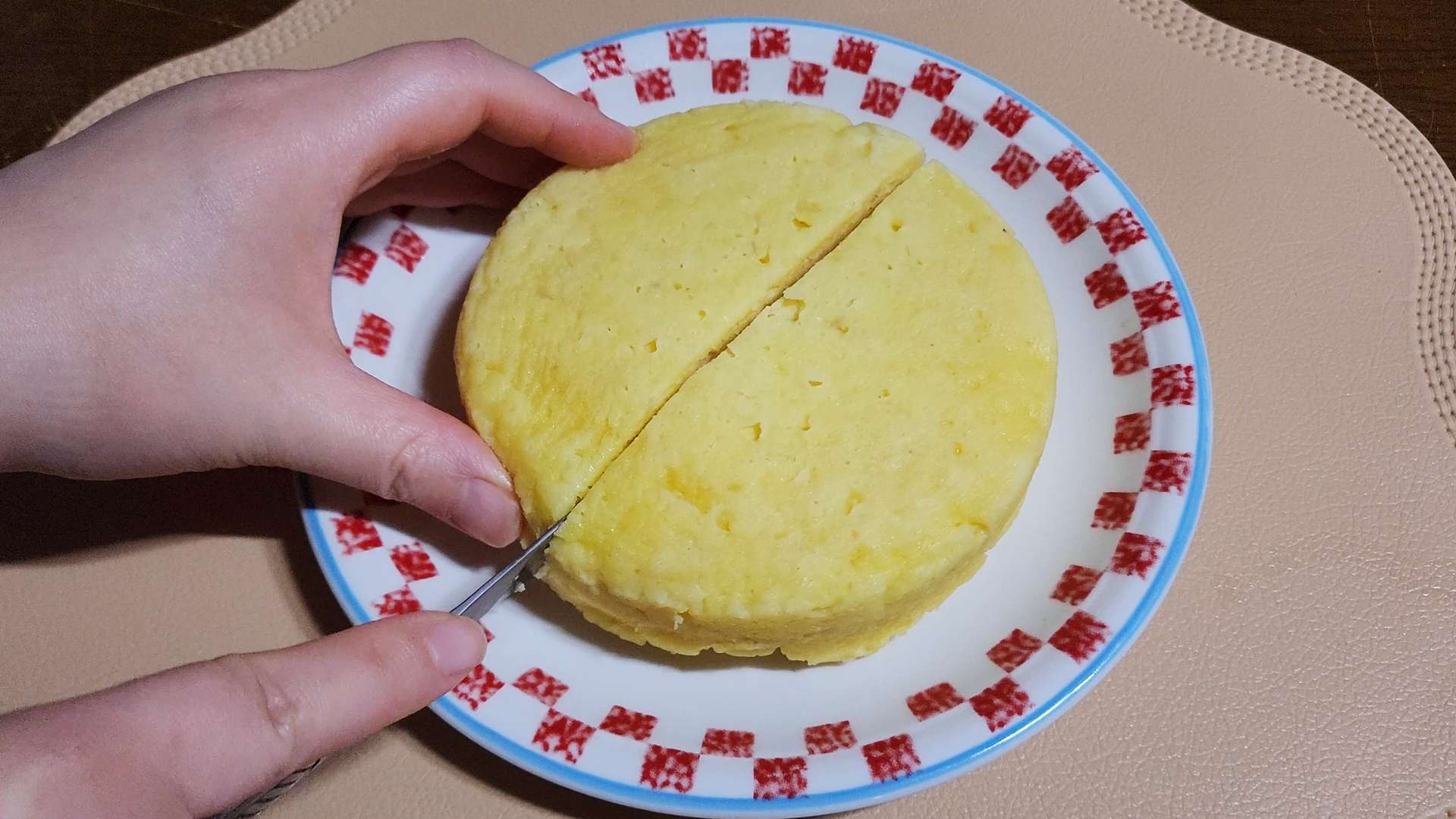 그릇에 고구마 케이크를 담고 먹기 좋은 크기로 잘라줍니다.